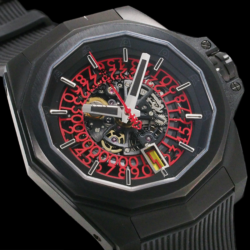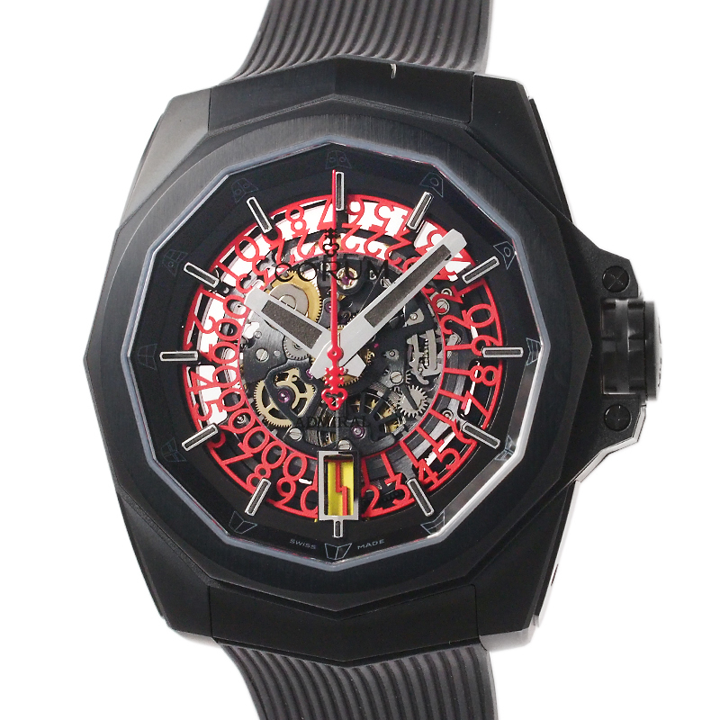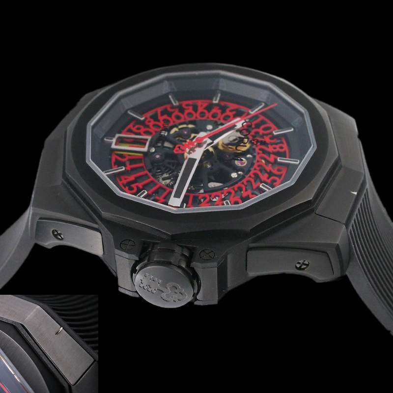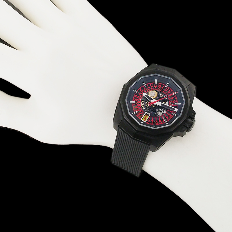 備考:存在感溢れる重厚なデザインが魅力的な「アドミラル 45 スケルトン」。ケースに打ち傷が見られますが、クールなスケルトンフェイスにレッドカラーのアクセントカラーが映え、高品質のチタンケースにブラックPVD加工が施されたオールブラックのスポーティーでスタイリッシュな288本限定モデルです。