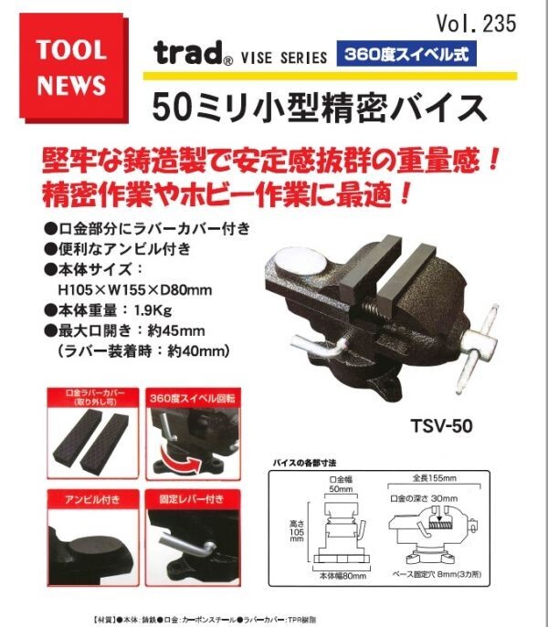 堅牢な鋳造性で安定感抜群の重量感! 精密作業やホビー作業に最適! 【仕様】 ●口金部分にラバーカバー付き ●便利なアンビル付き ●本体サイズ:H105xW155xD80mm ●重量約1.9kg |