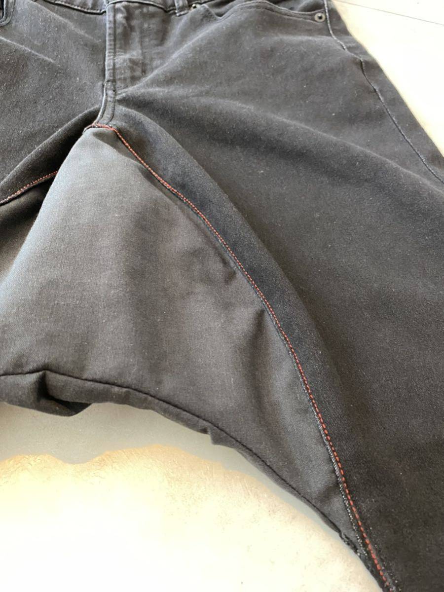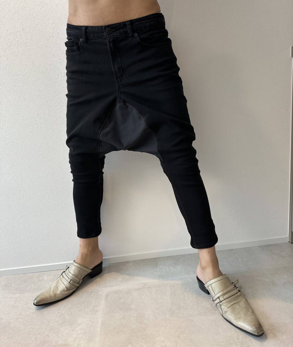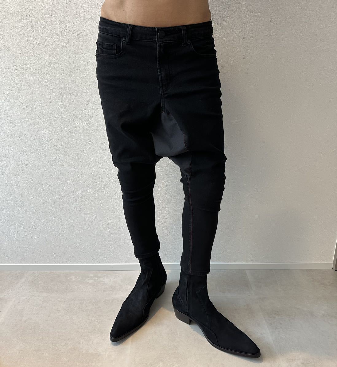 股上を異素材で深く取り、膝下は極スリムのスキニーとしました。