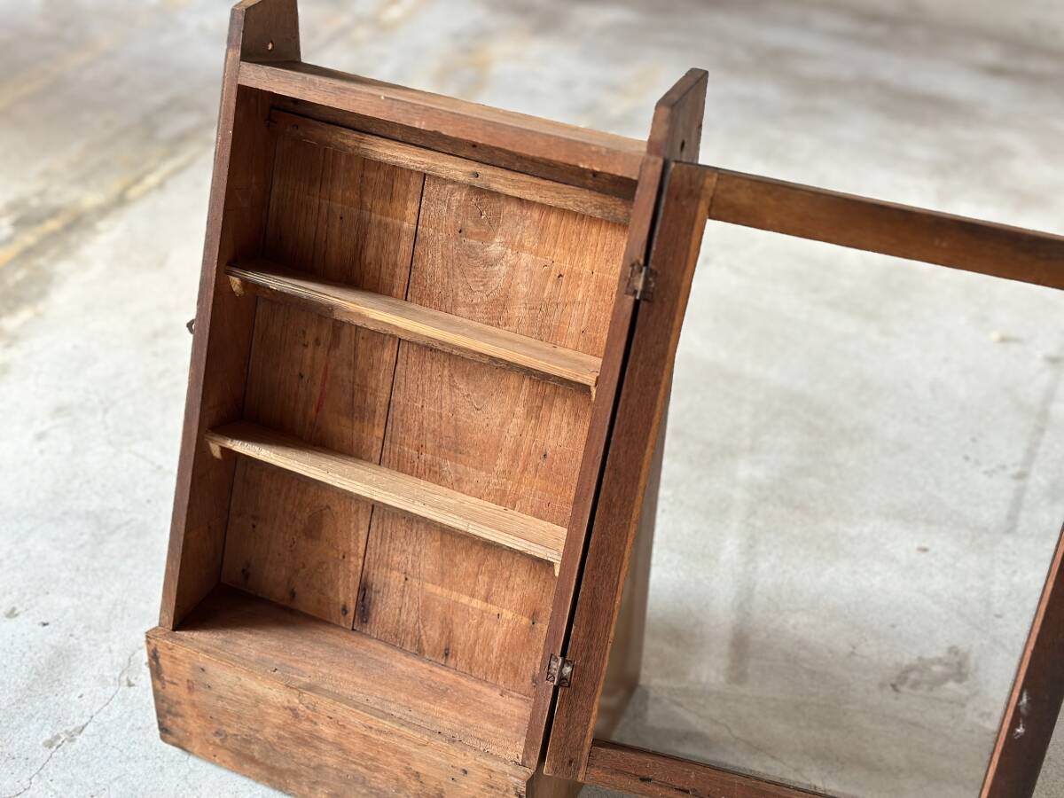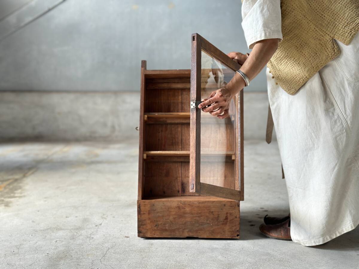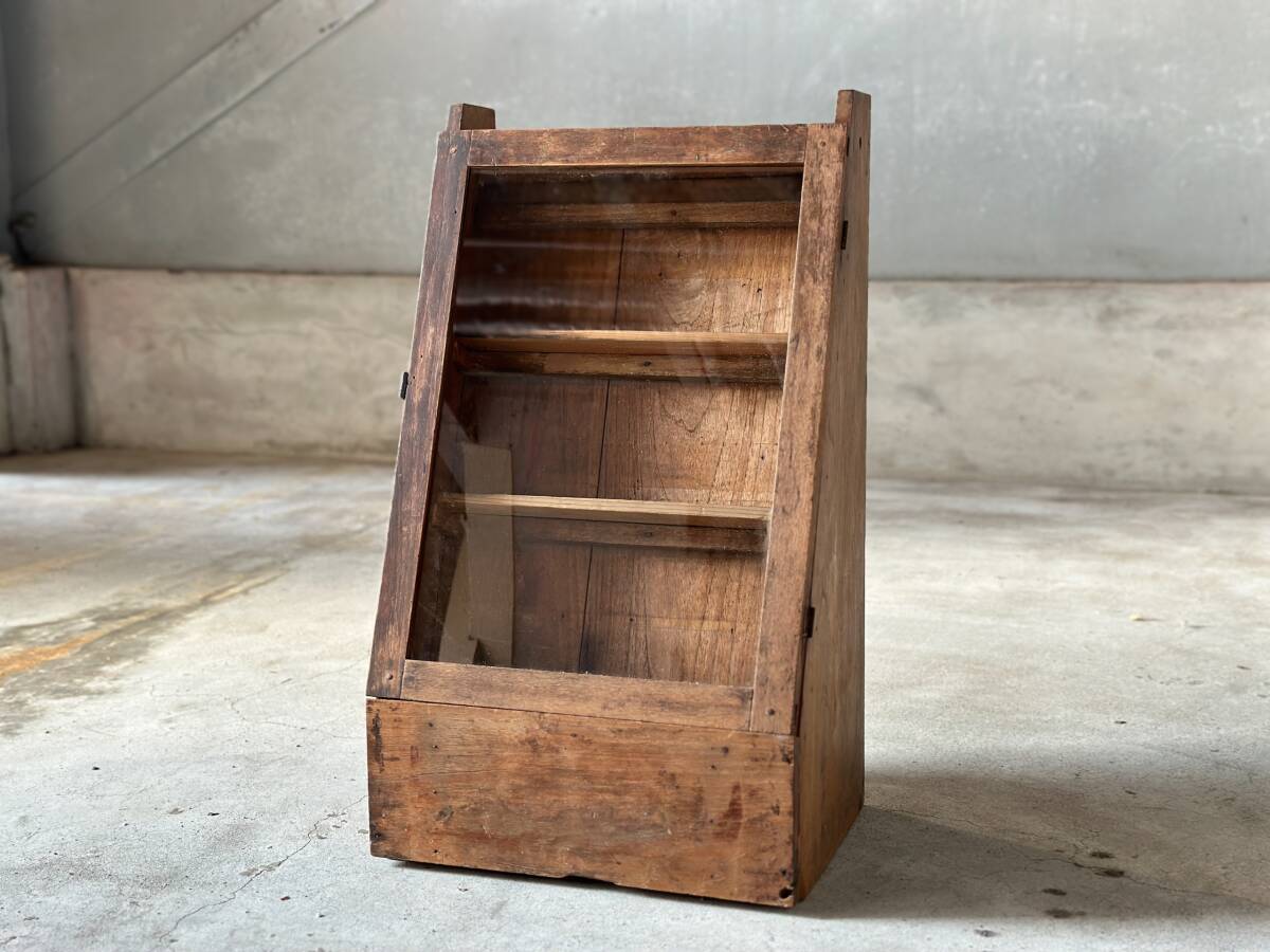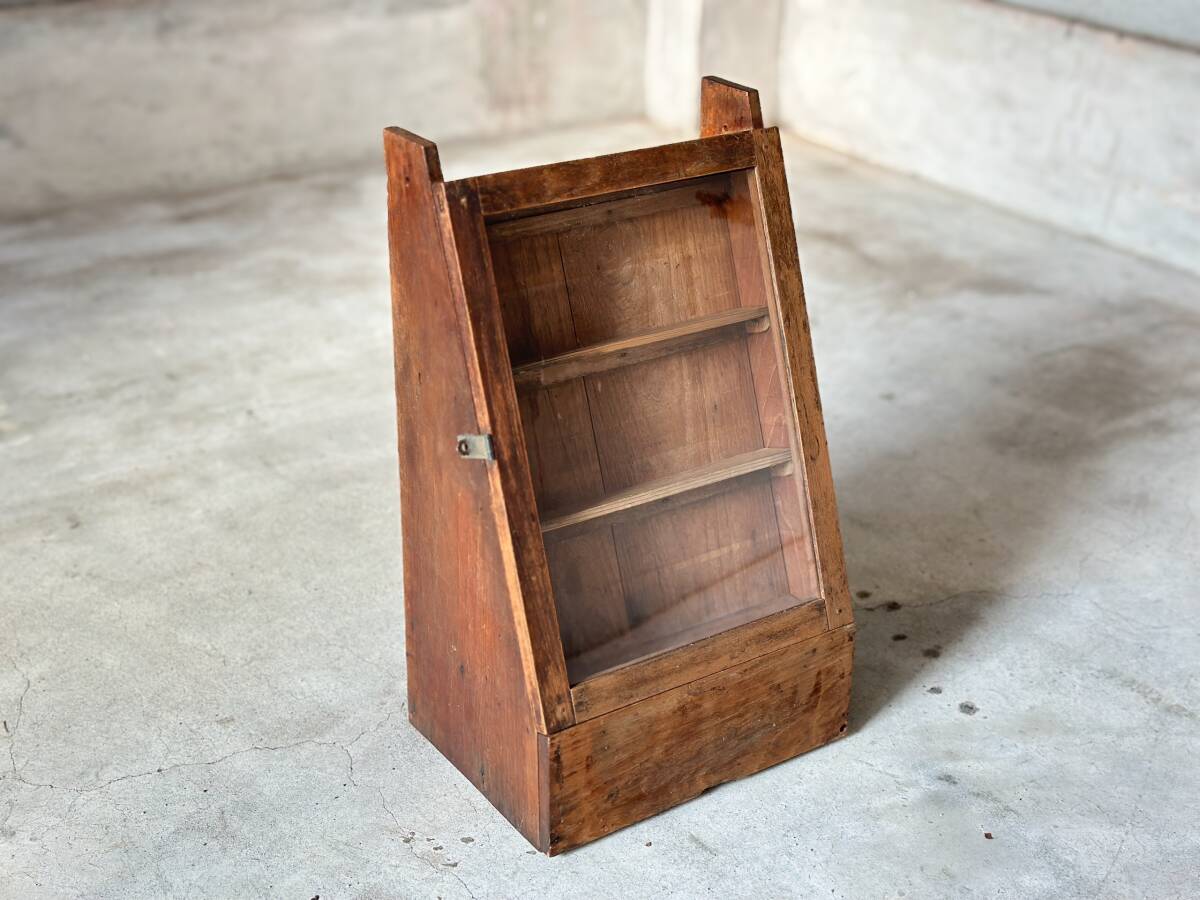 台形の形のヴィンテージのチーク材のディスプレイガラスショーケースです。
