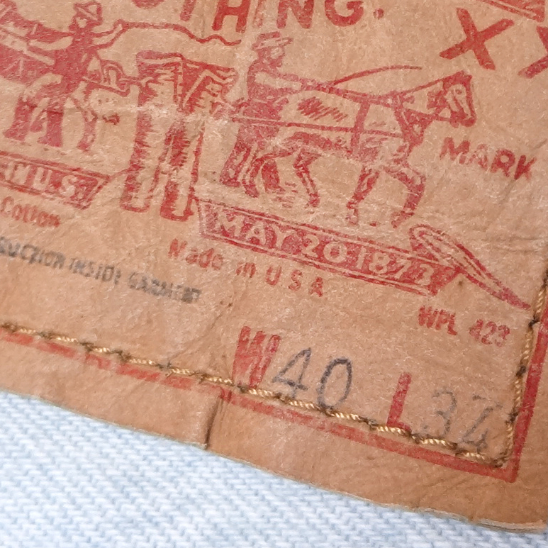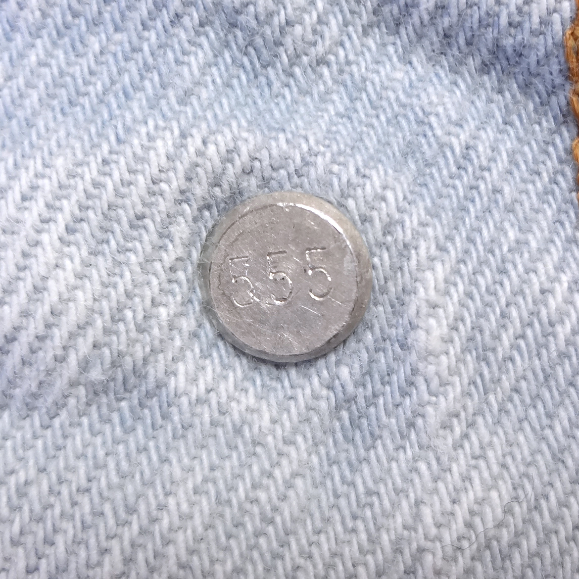 ・スモールeレッドタブ、アーキュエットステッチ、トップボタン裏刻印555、5ポケットリベット、ボタンフライ、MADE IN USA表記入りペーパーパッチ
