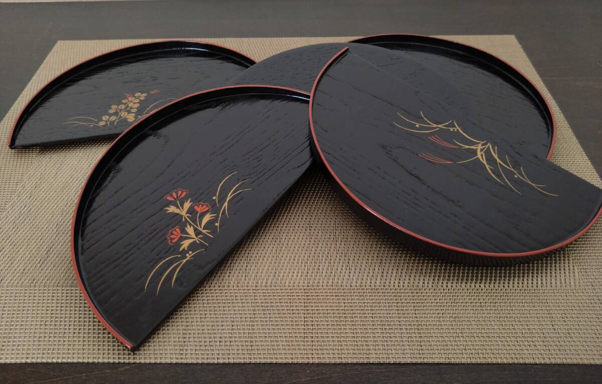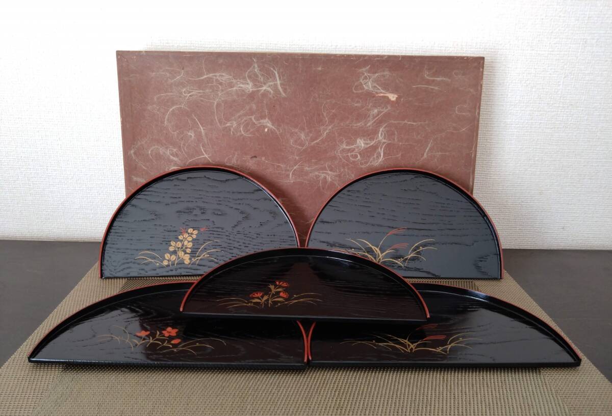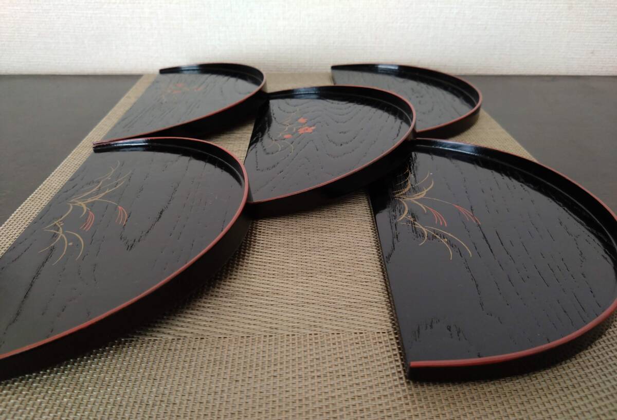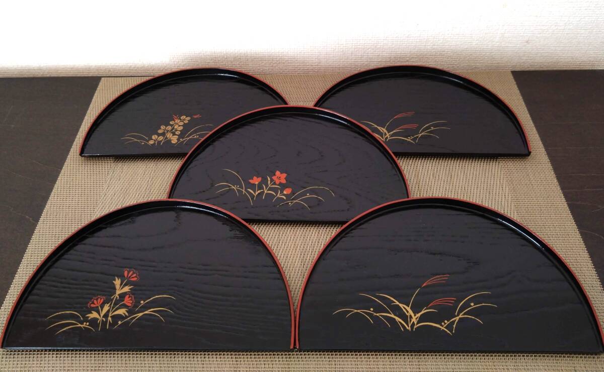 半月盆 漆塗り 蒔絵 草花文 5客セット  ##