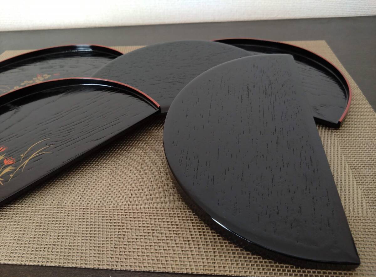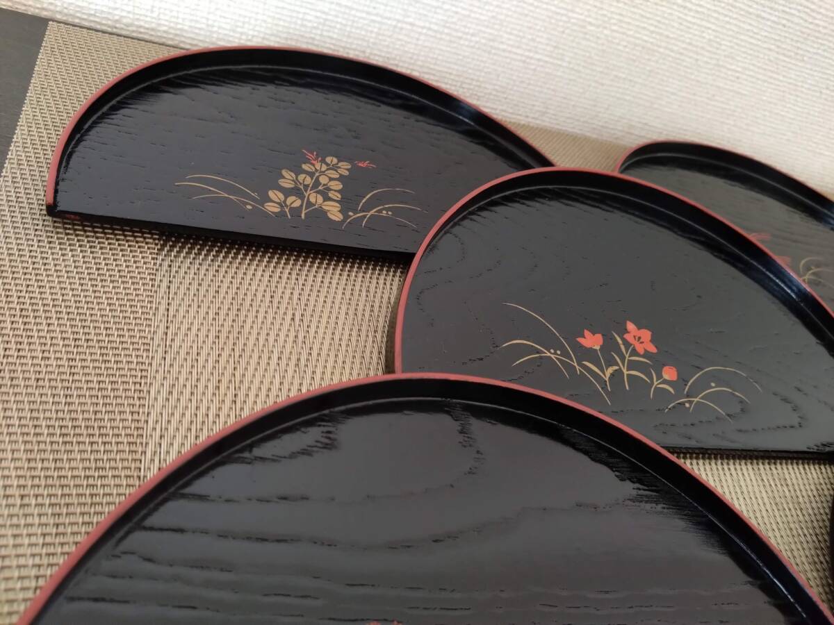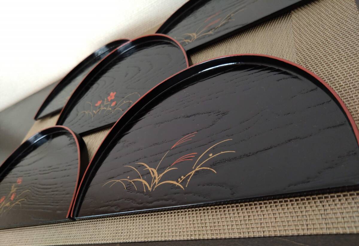 半月盆 漆塗り 蒔絵 草花文 5客セット  ##