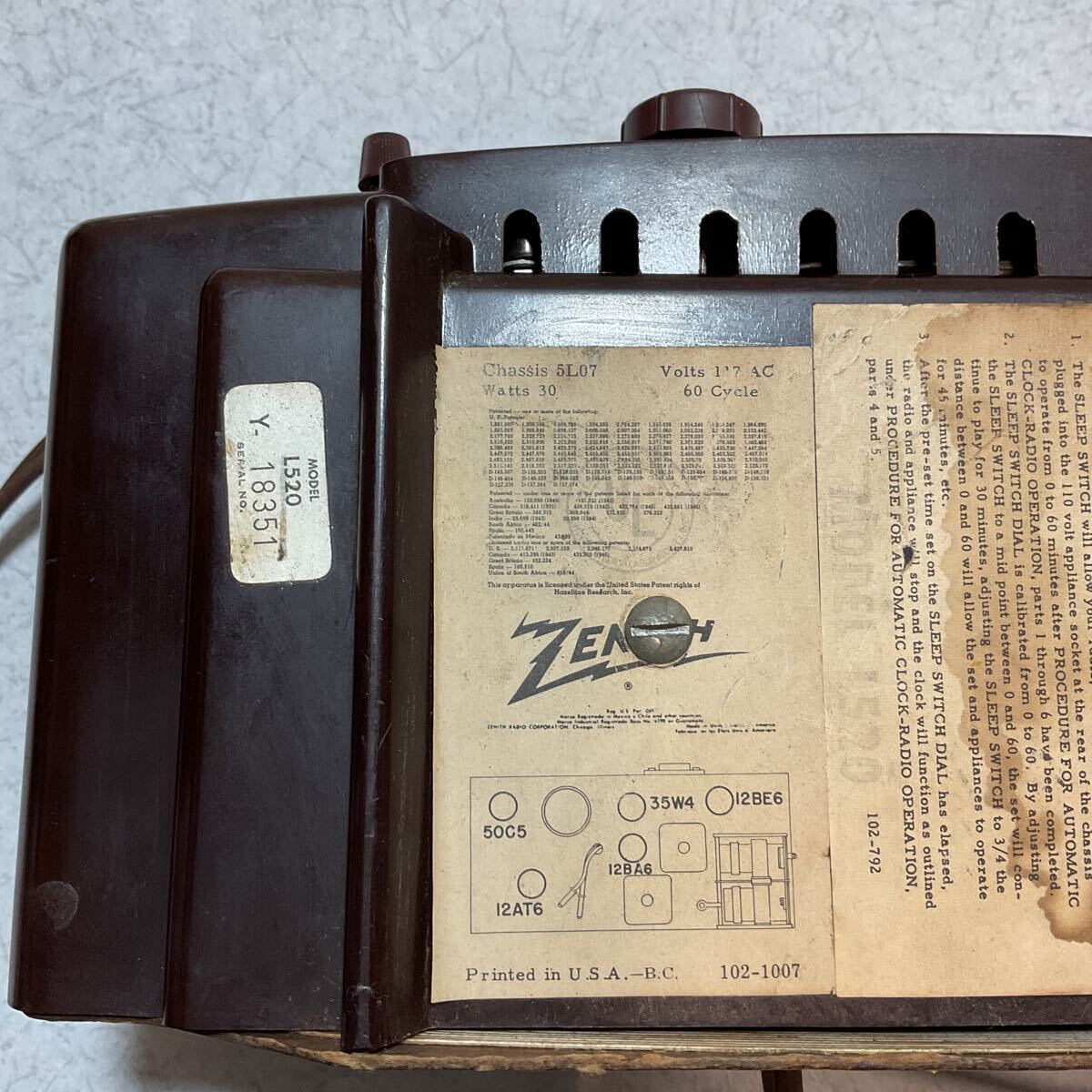 【通電/音出し確認】ZENITH 真空管ラジオ MODEL L520 目覚まし時計 アンティーク ラジオ レトロ品 現状品