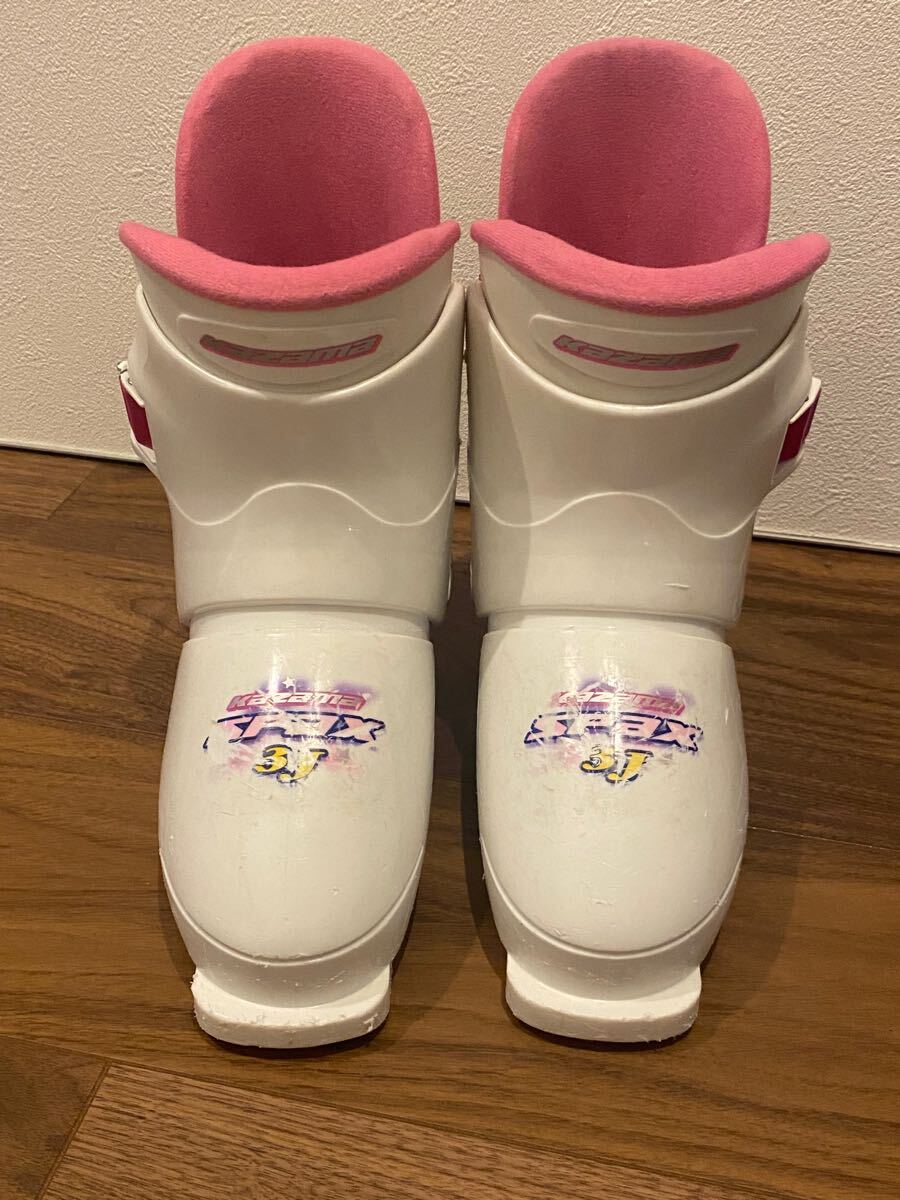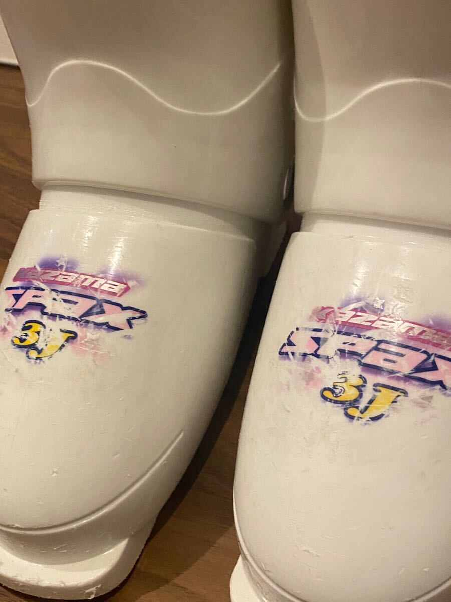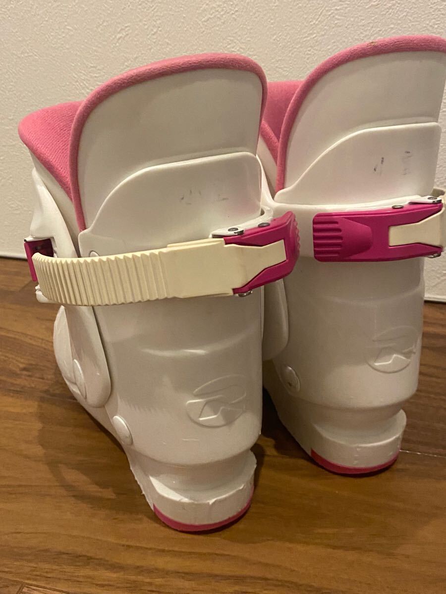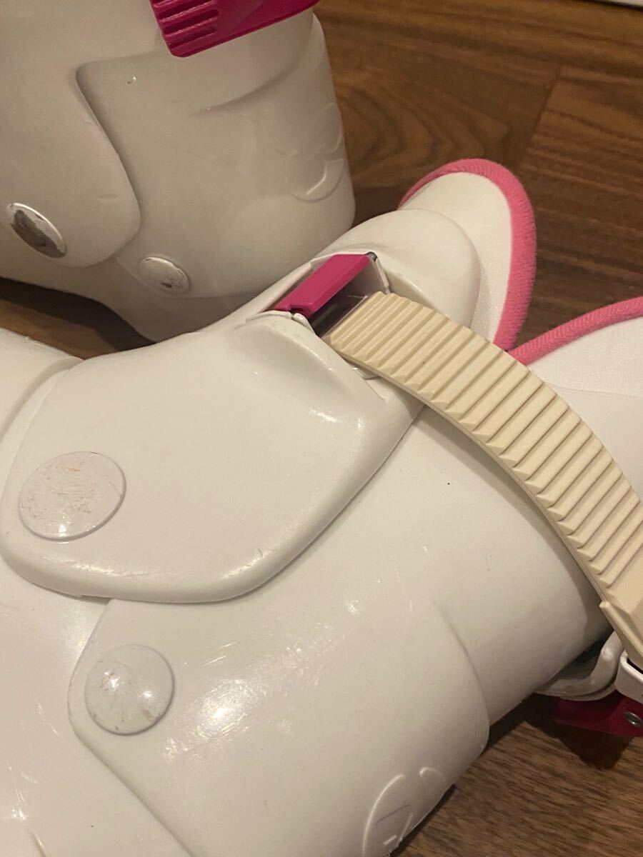 ホワイトとピンクの子供用スキーブーツ、サイズ 21-22キャラクターグラフィック付き。