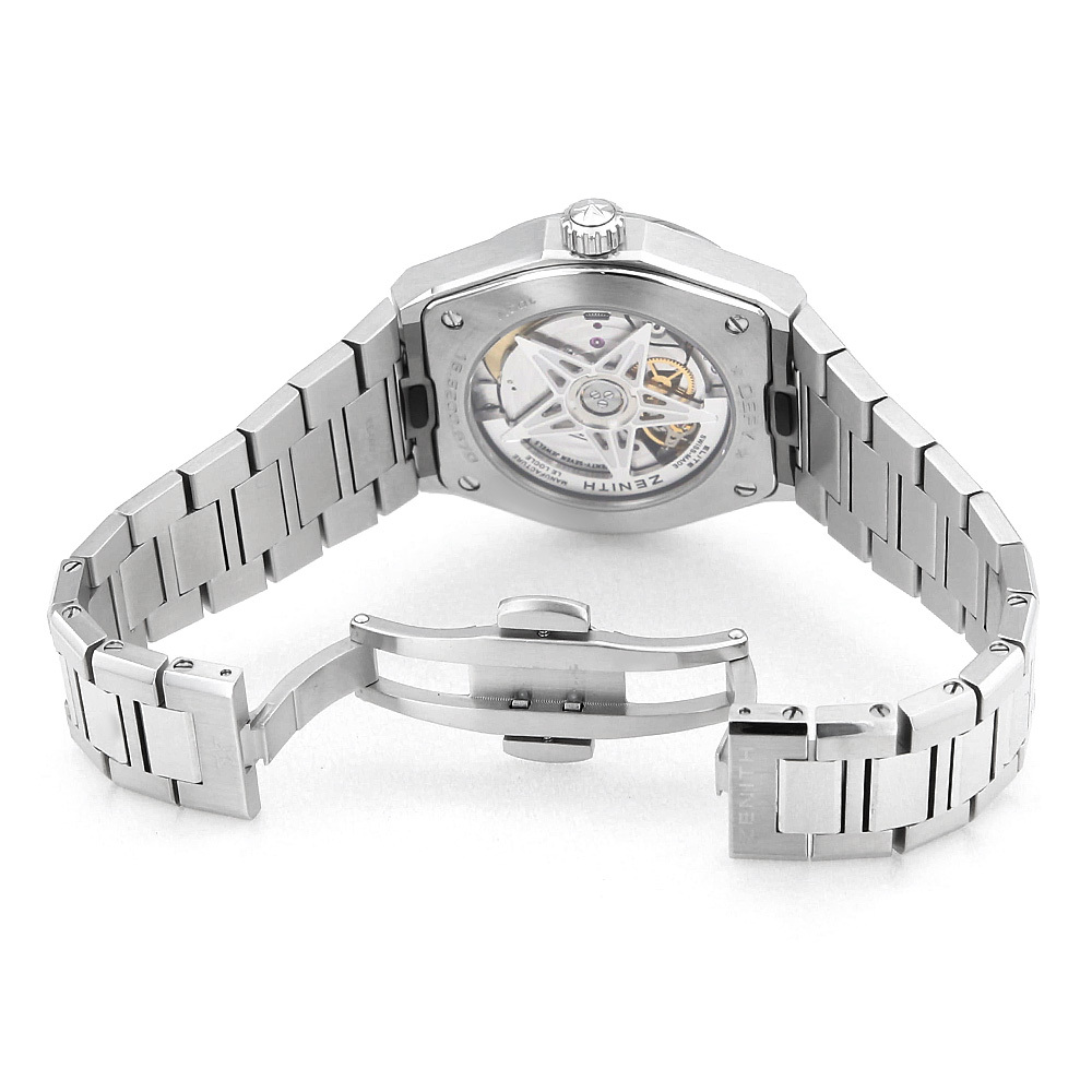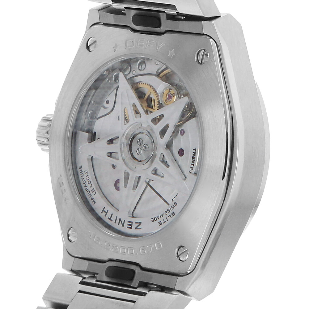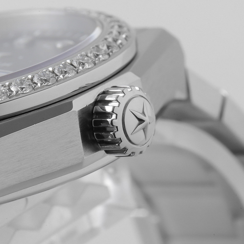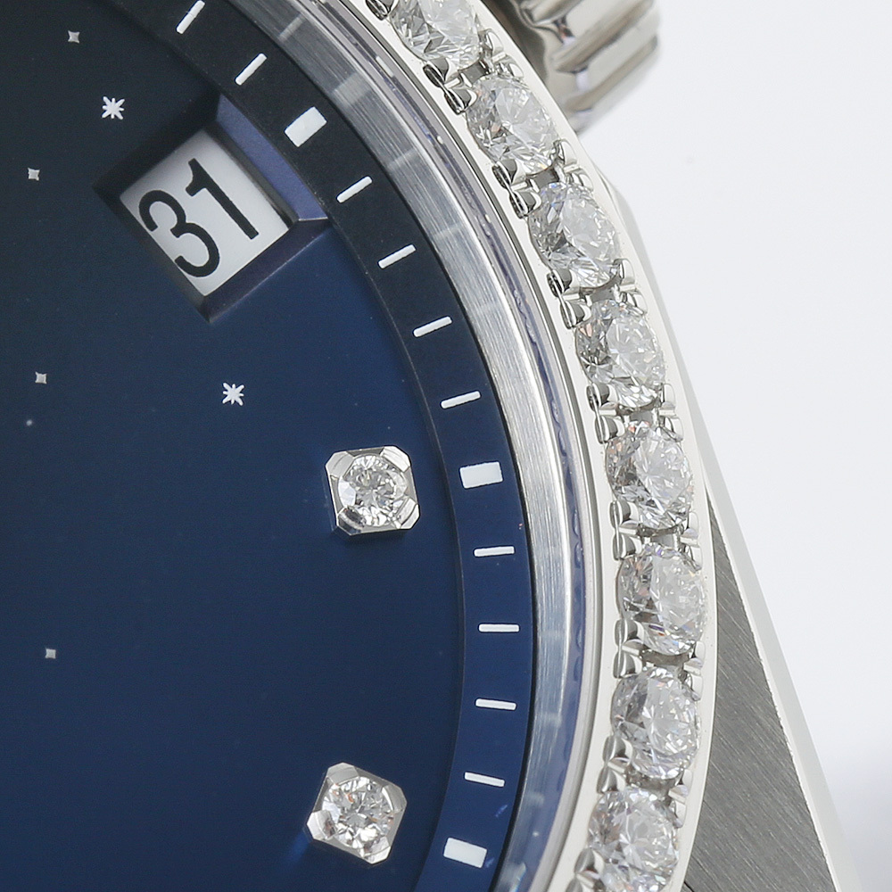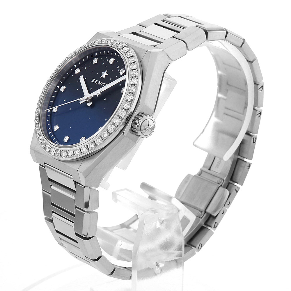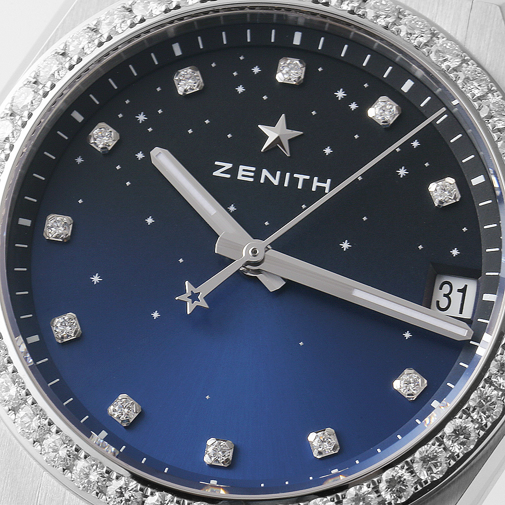 モデル情報 | 美しいグラデーションを施したディープブルーに星を描いた文字盤のデファイが入荷しました。『デファイミッドナイト』は女性向けのスポーティシックなタイムピースです。ケースサイズは36mmと存在感のある大きさ。ベゼルにあしらったダイヤモンドが手元を上品に輝かせます。ブルーのグラデーションの濃淡が見せる深い宇宙を思わせる綺麗な夜空に、星が煌めく幻想的な文字盤が女性らしい美しさを醸し出しています。パワーリザーブ50時間仕様。10気圧防水。 |