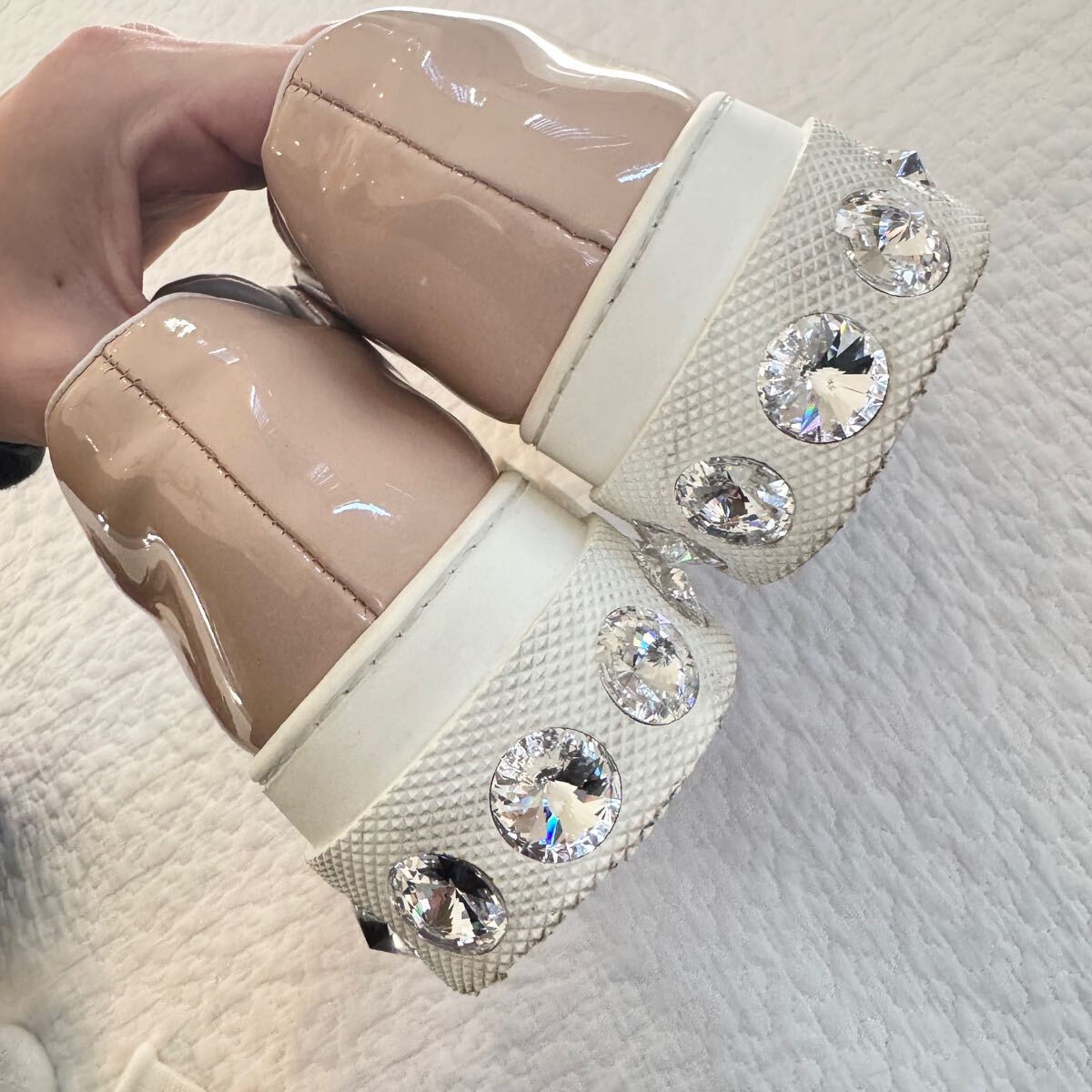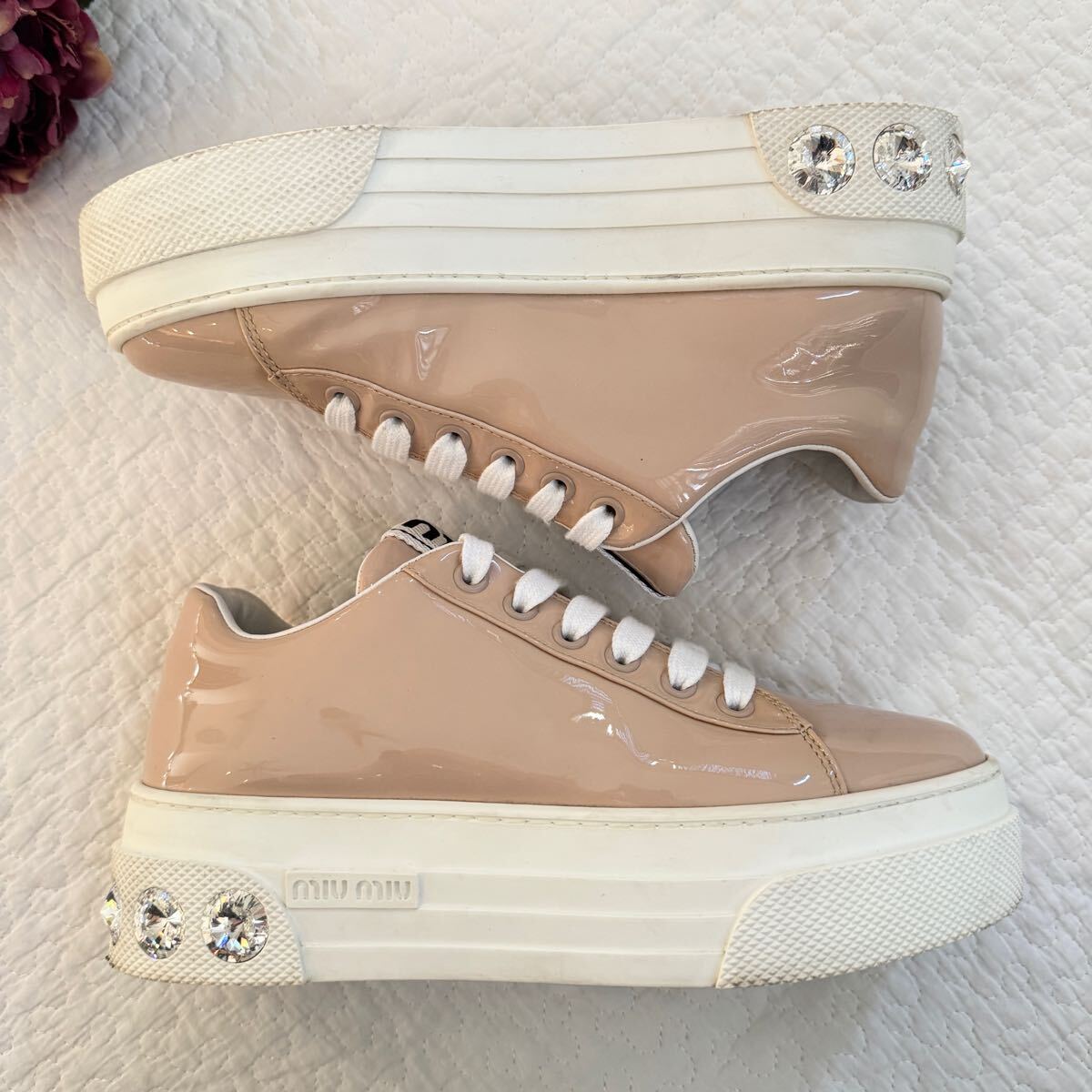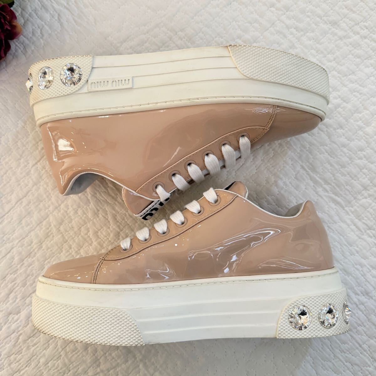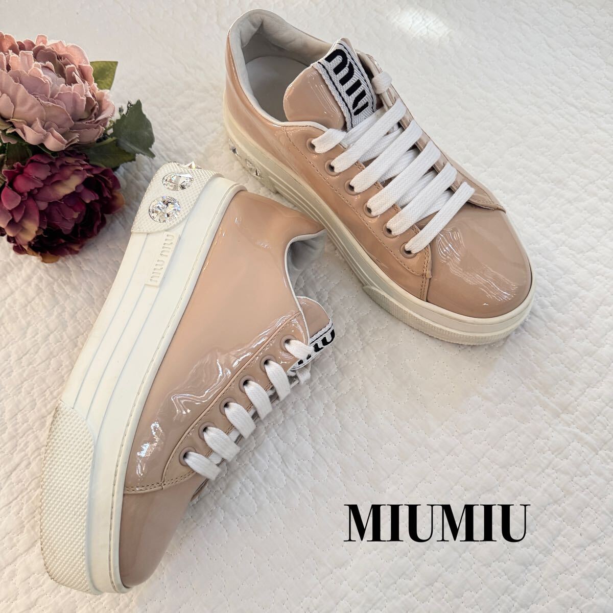 極美品 希少 miumiu ミュウミュウ ビジュー パテントレザー 厚底 スニーカー クリスタル 34 ピンク ロゴ
