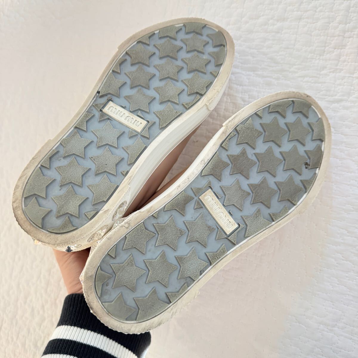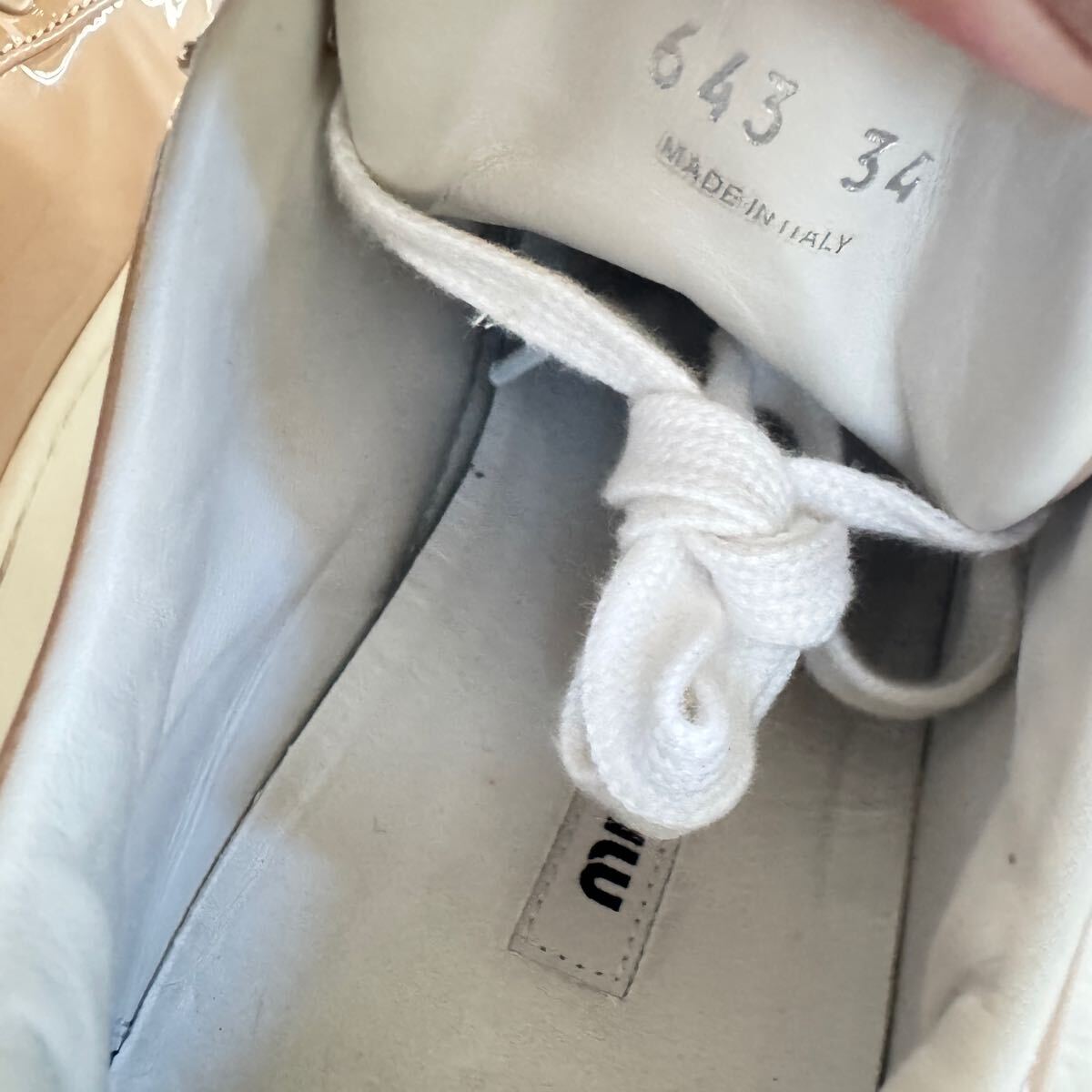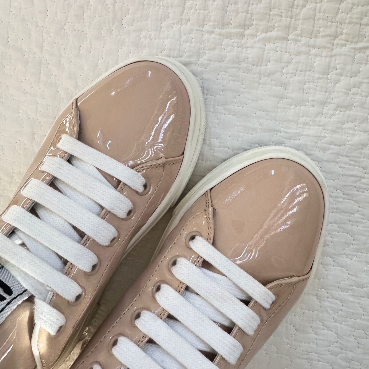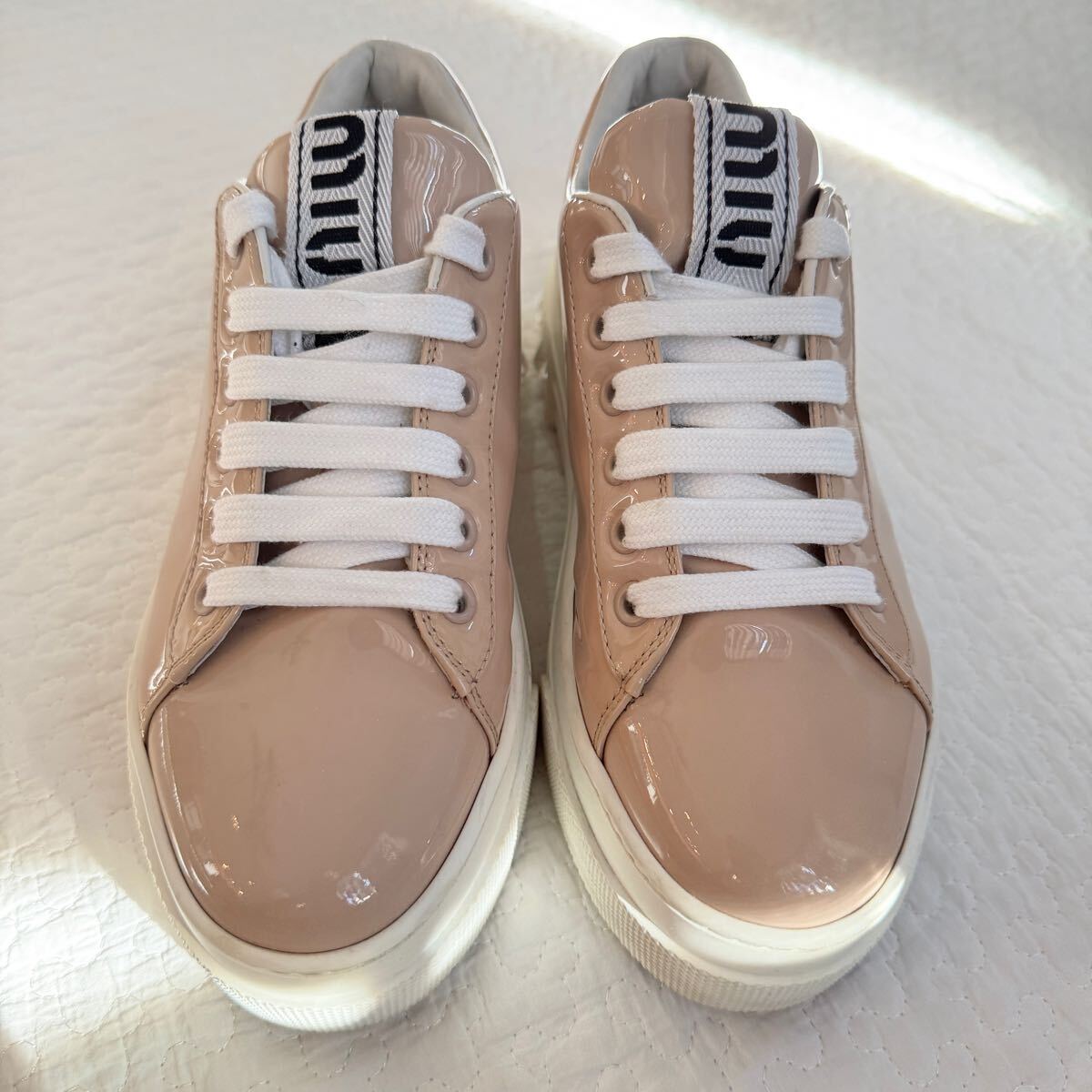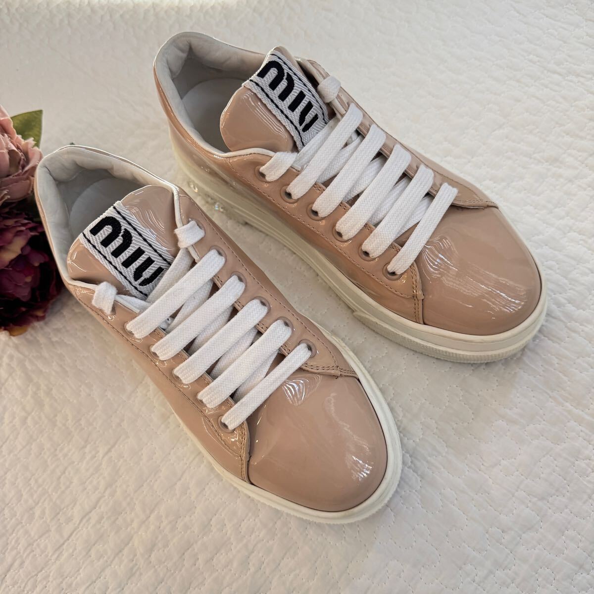 極美品 希少 miumiu ミュウミュウ ビジュー パテントレザー 厚底 スニーカー クリスタル 34 ピンク ロゴ