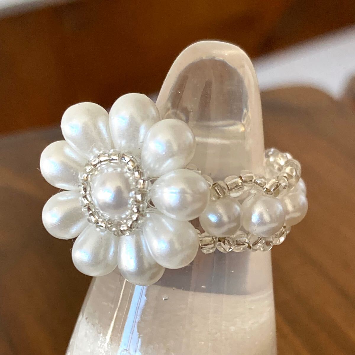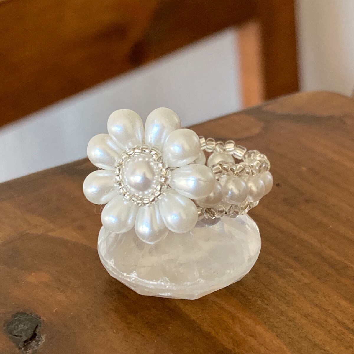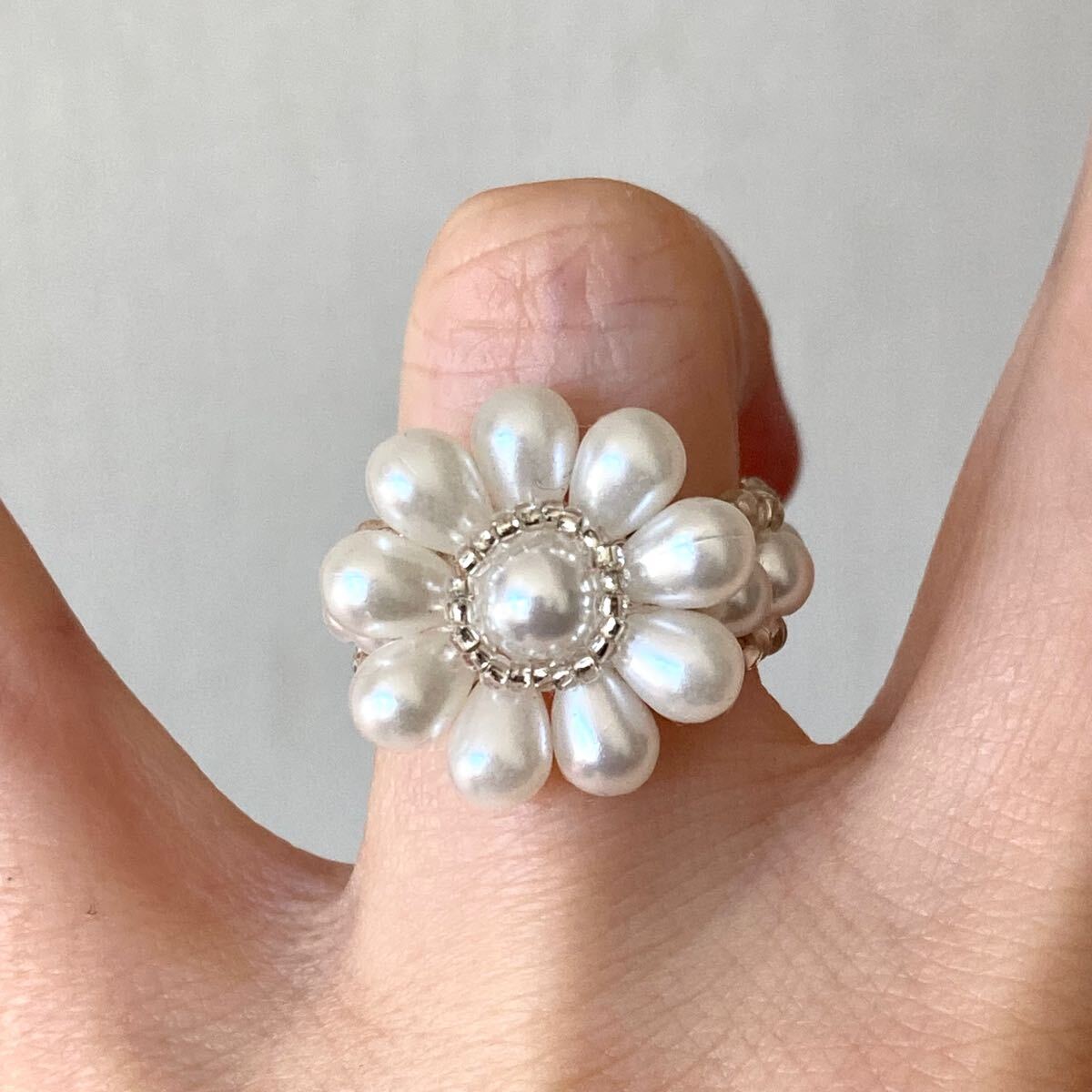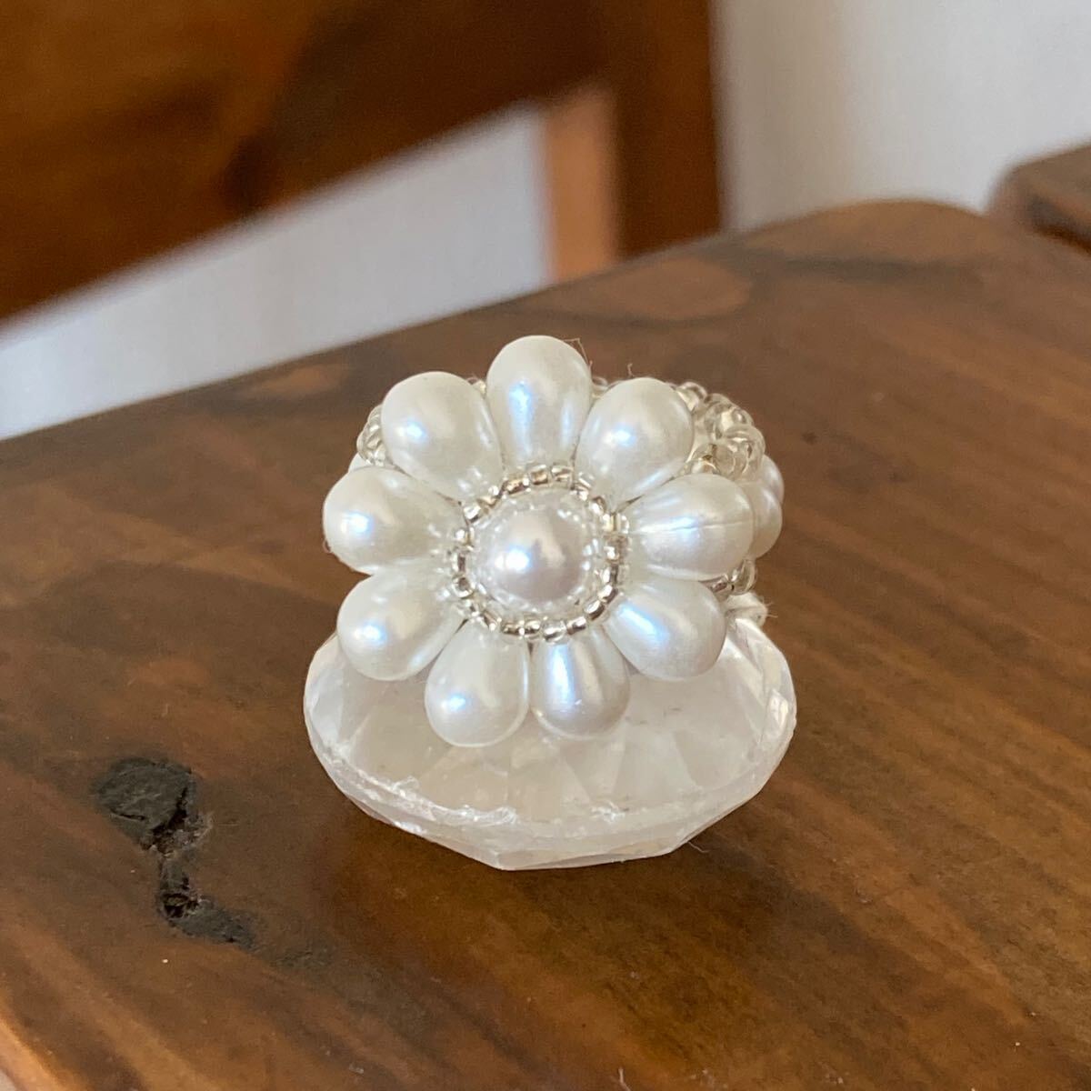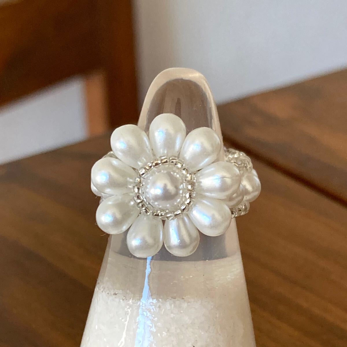 小さめパールのドロップビーズのお花モチーフが可愛いリングです♪
