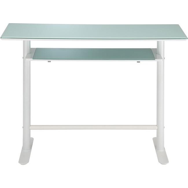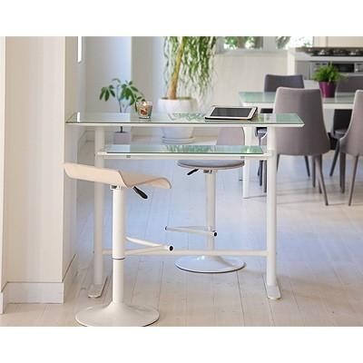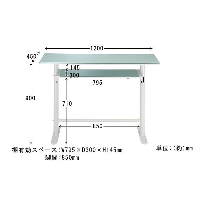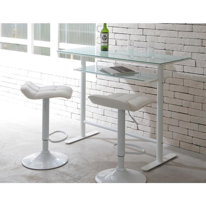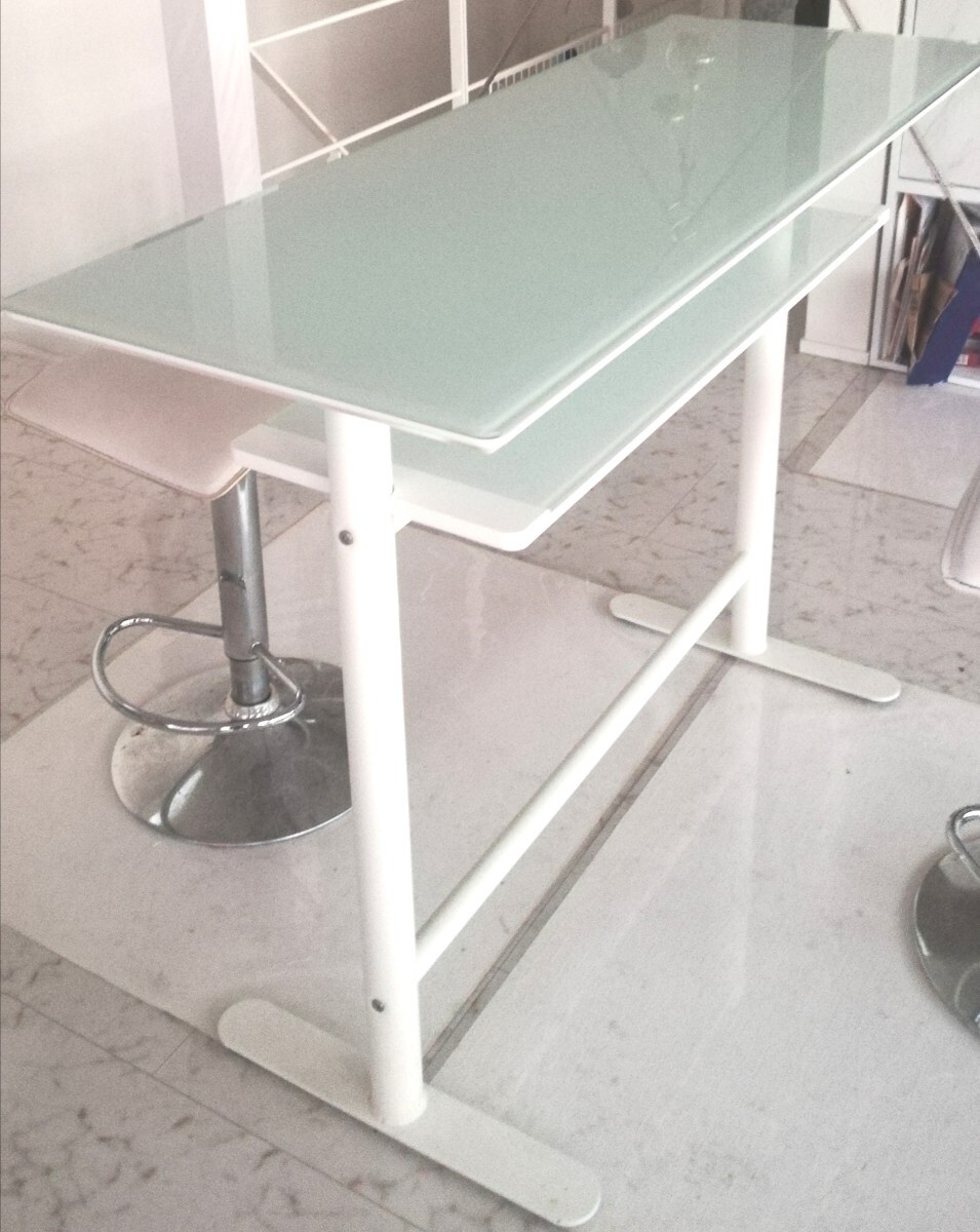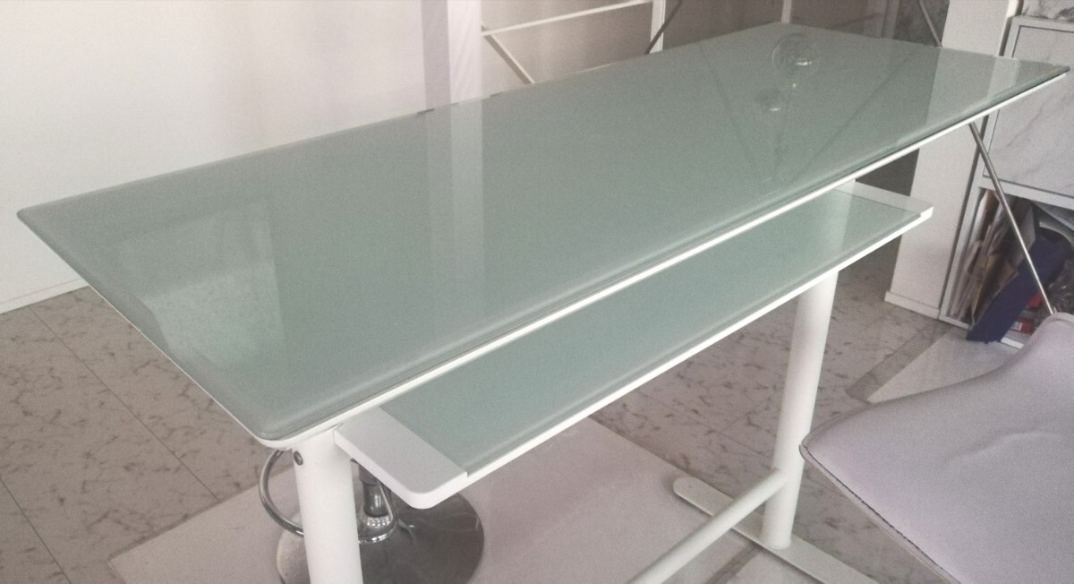 強化ガラス(悲惨防止フィルム加工)を天板に使用、窓から差し込む日射しや照明のライトに照らされ眩しく輝くカウンターテーブルです、