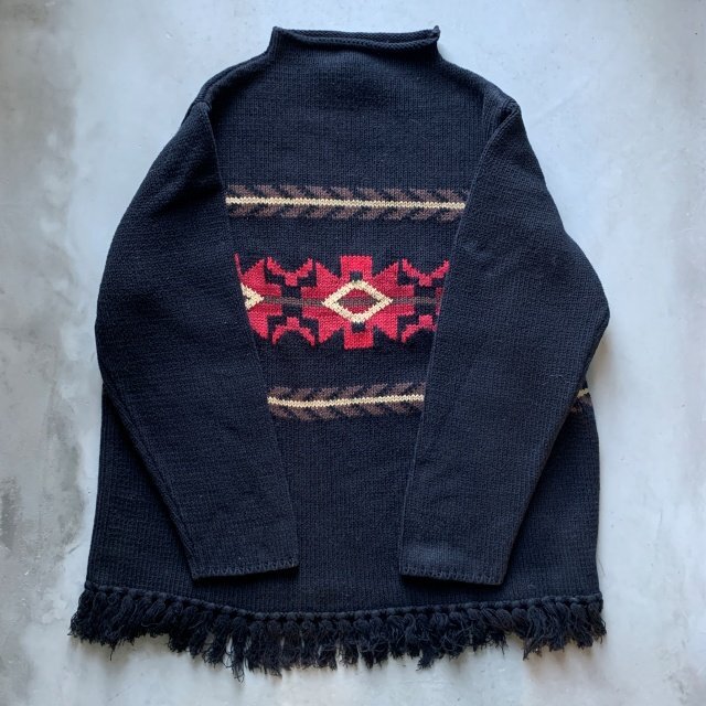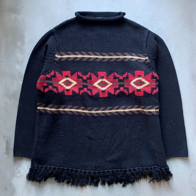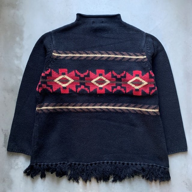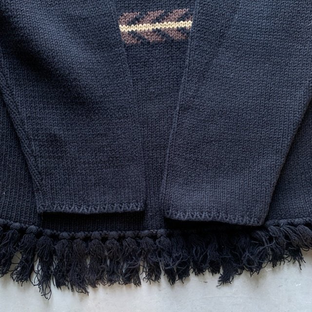 ★商品状態★ ・着用感ございますが特に目立つダメージや汚れなどは見当たりません。 ・古着慣れされている方でしたら問題なく着用していただける程度かと思います。 ★素材★ COTTON/ACRYLIC 60/40 ★配色★ 黒 ★サイズ表記★ 2X メンズM程度 ・実寸を参考にして下さい。 ★実寸サイズ★ 肩幅43㎝ 身幅62㎝(脇下~脇下) 着丈65㎝(襟下~裾)フリンジ除く 袖丈58㎝(肩~袖先) ・平置きにての採寸となります。 ・若干の誤差はご了承ください。 | ||||