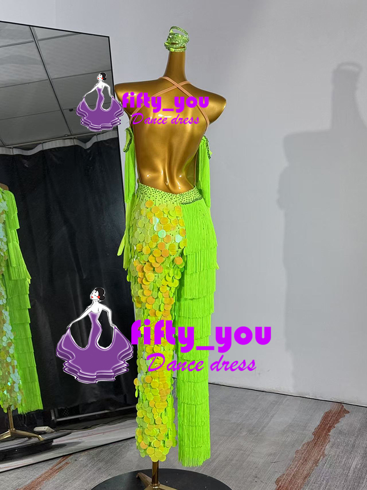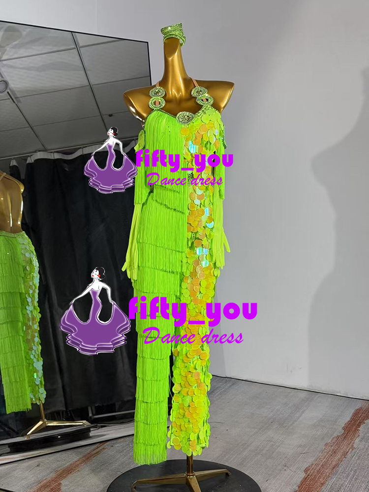 新品fifty_you セミオーダー レディース社交ダンス衣装  高級品 ラテンズボン ビーズいっぱい飾 蛍光色