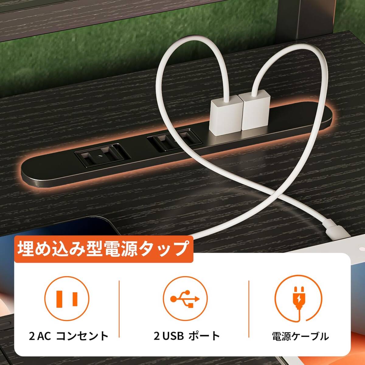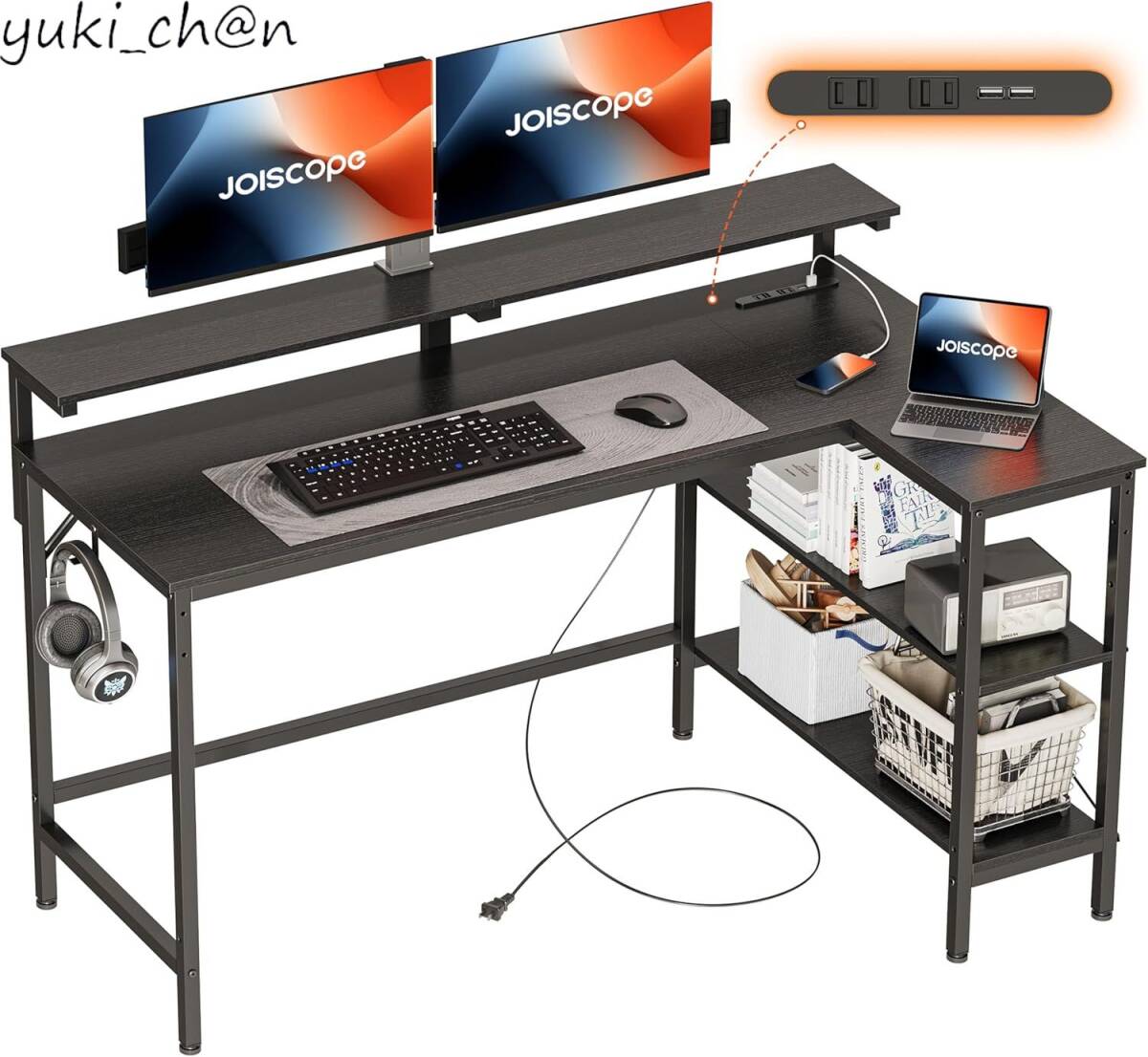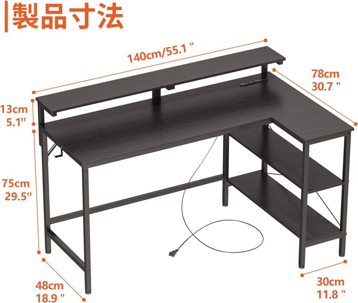 パソコンデスク 140×48~78cm l字型デスク 2USB+2AC電源コンセント付き オフィスデスク 組立簡単 ブラック
