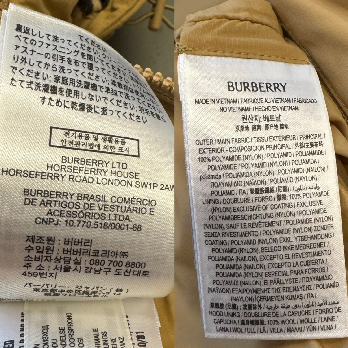 | 素材:ナイロン100% 裏地:ナイロン100%(コーティングを除く) フード裏地:羊毛100% 襟裏地:羊毛100% 袖口:綿88%/綿11% ナイロン/スパンデックス1% 中綿:ポリエステル100% ダウン充填材:グースダウン/グースフェザー |