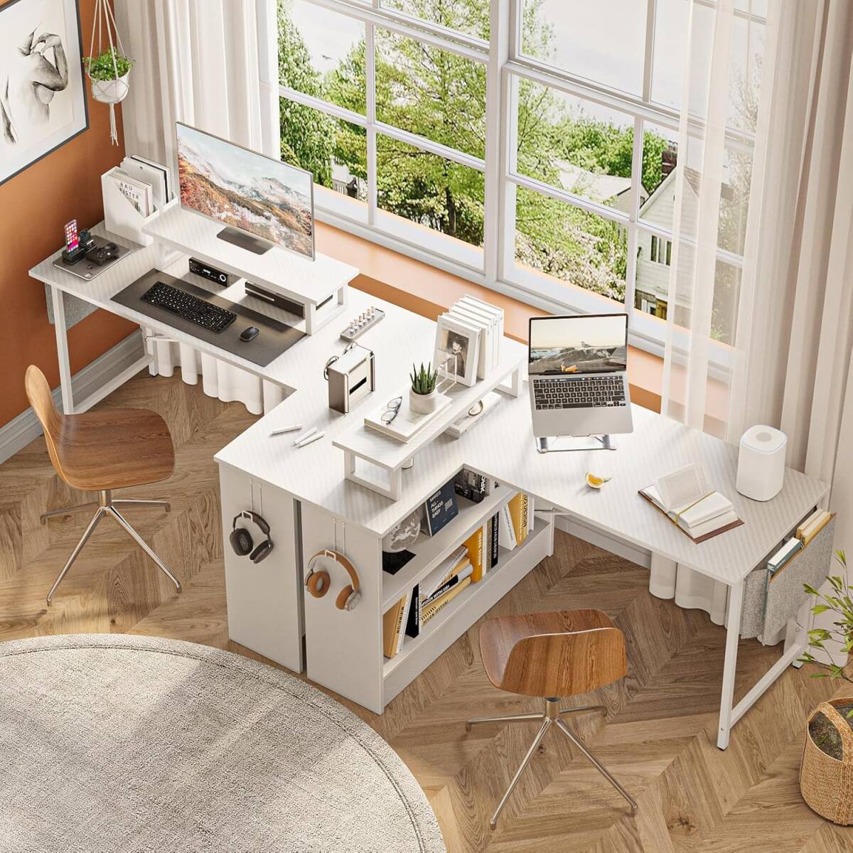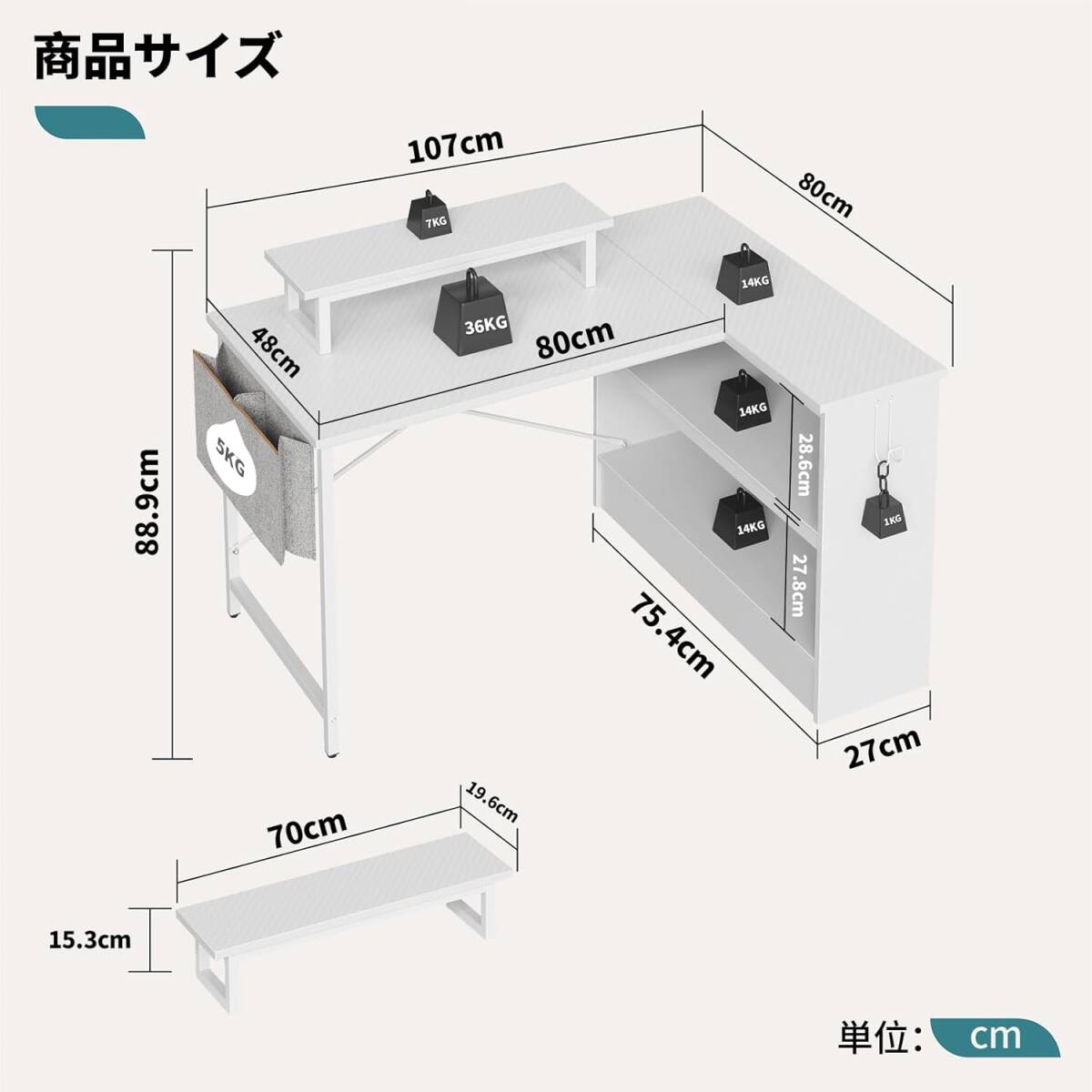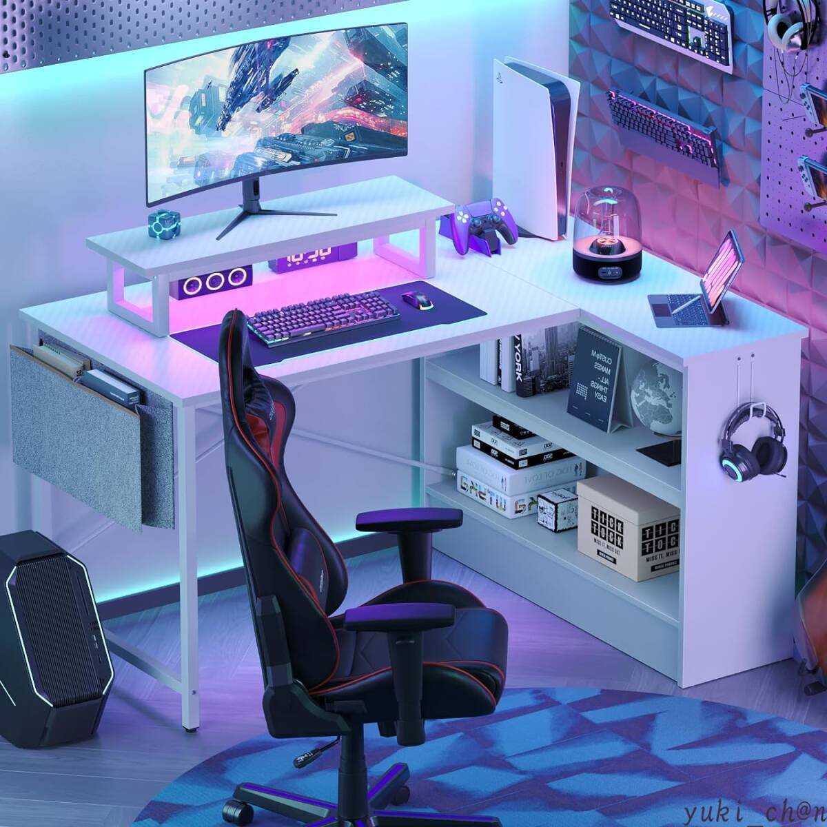 ゲーミングデスク l字デスク 幅107cm L字型 机 pcデスク 収納袋付き 在宅ワークデスク 左右入替可 木製 ホワイト
