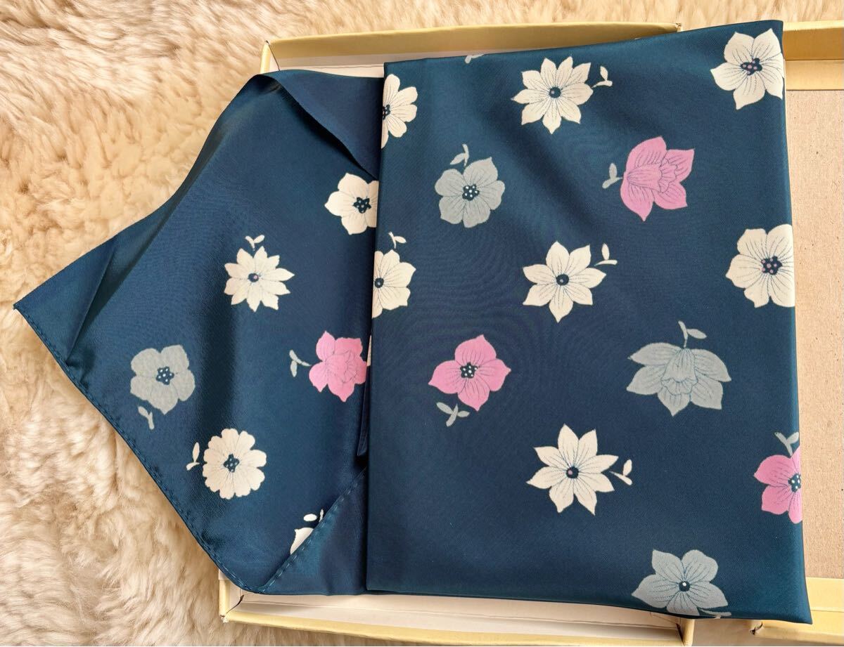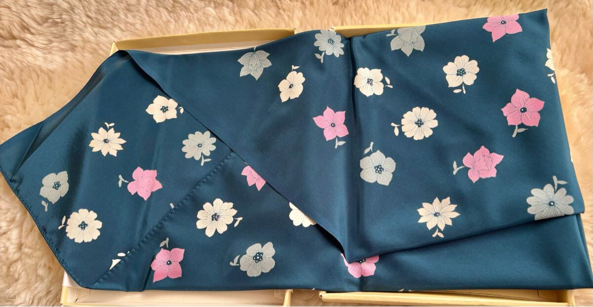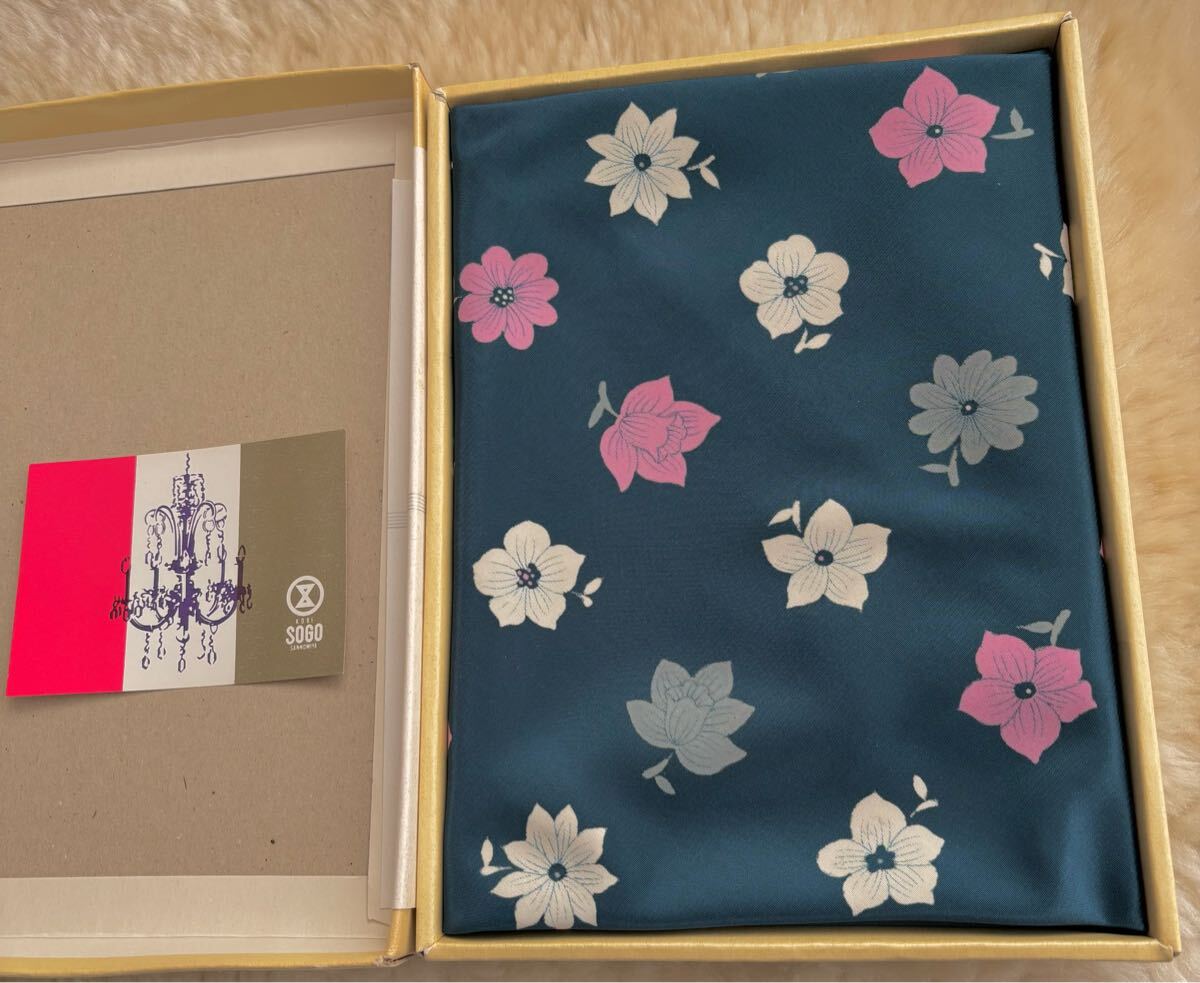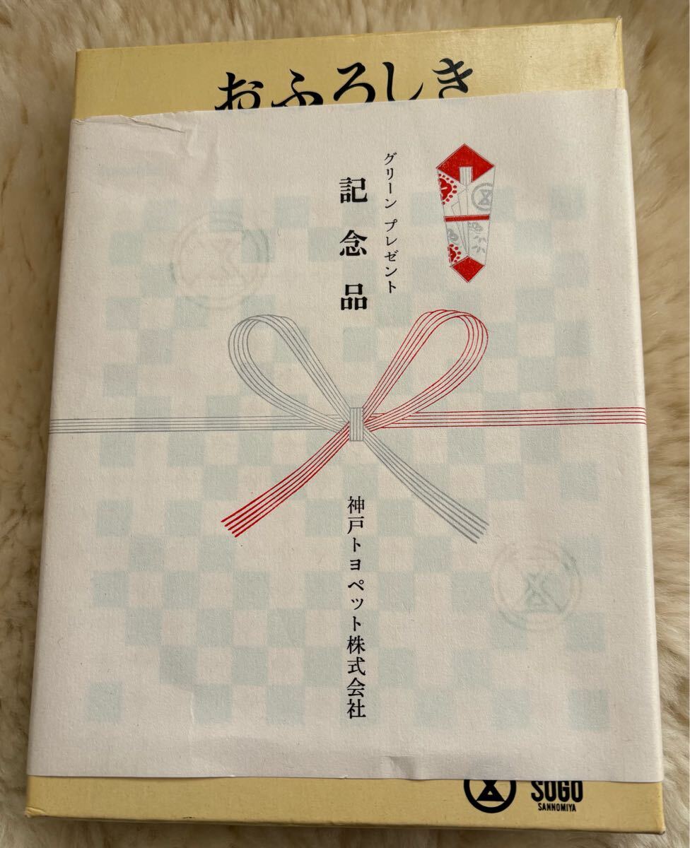 神戸トヨペット株式会社のグリーン プレゼント 記念品と書いた熨斗紙がかかったSOGOそごう百貨店の箱に入ったおふろしき。