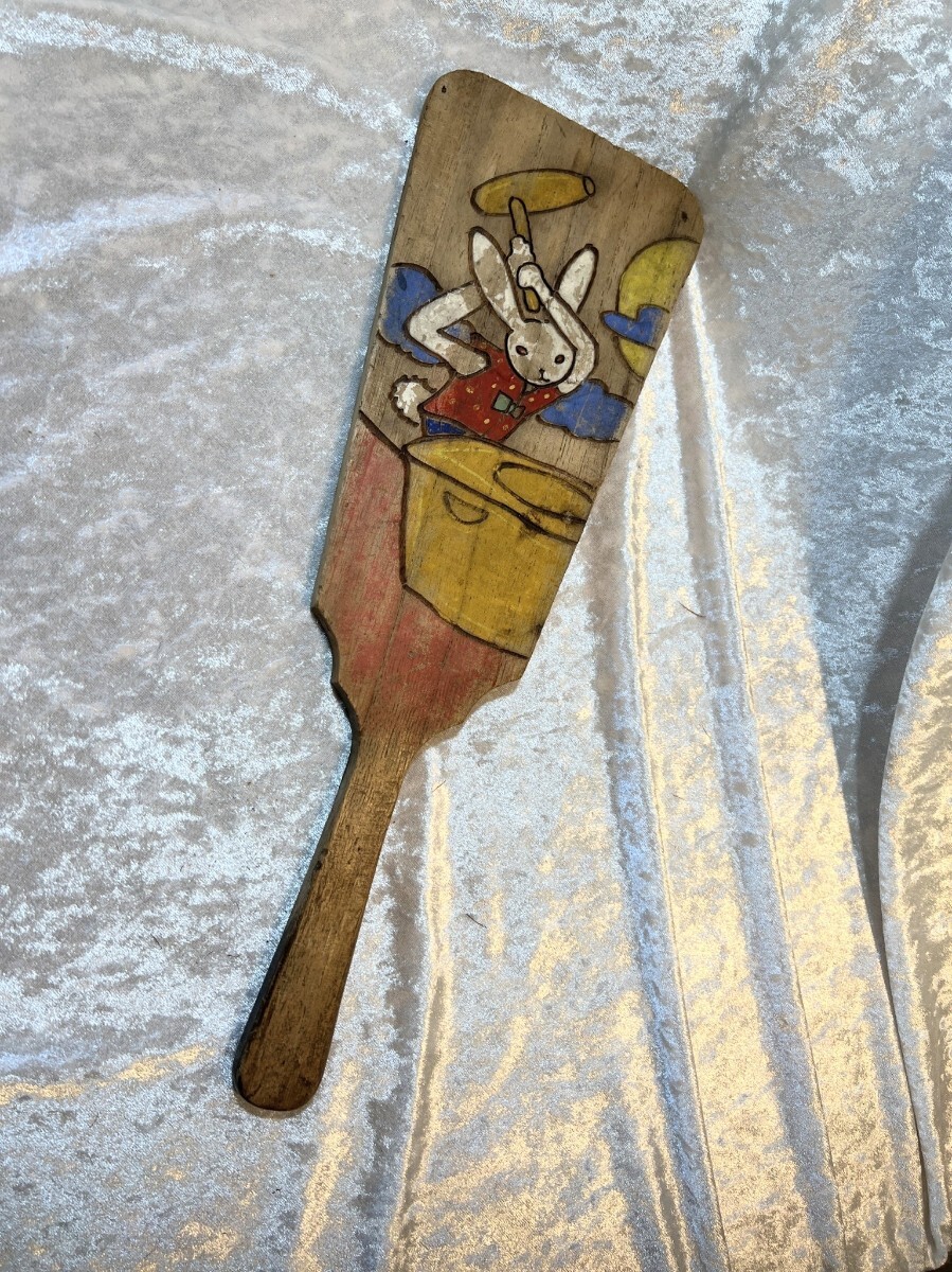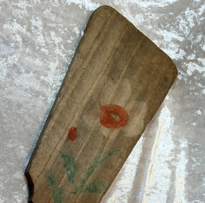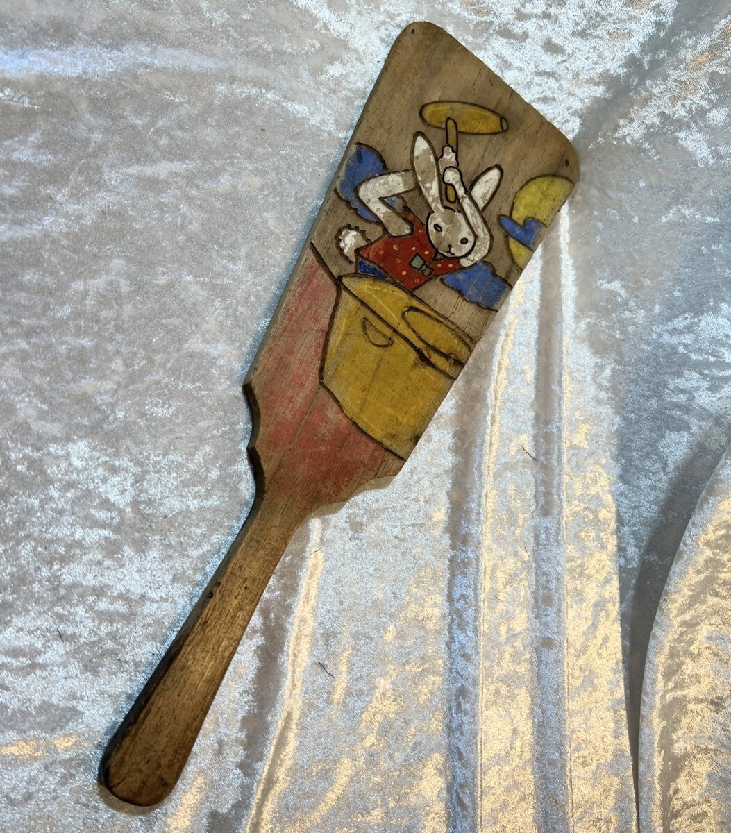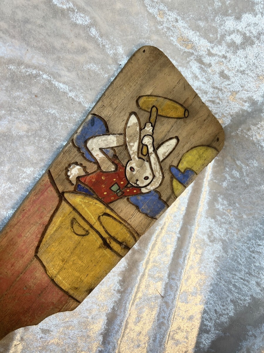 【雑貨・古民具】羽子板 木製 ウサギの餅つきのデザイン 裏は花模様 昭和レトロ ディスプレイ用品 インテリア用品 骨董品 アンティーク商品説明+++ 商品名:羽子板