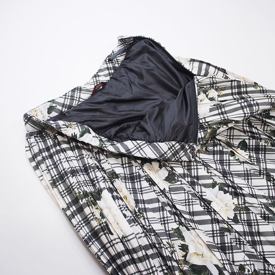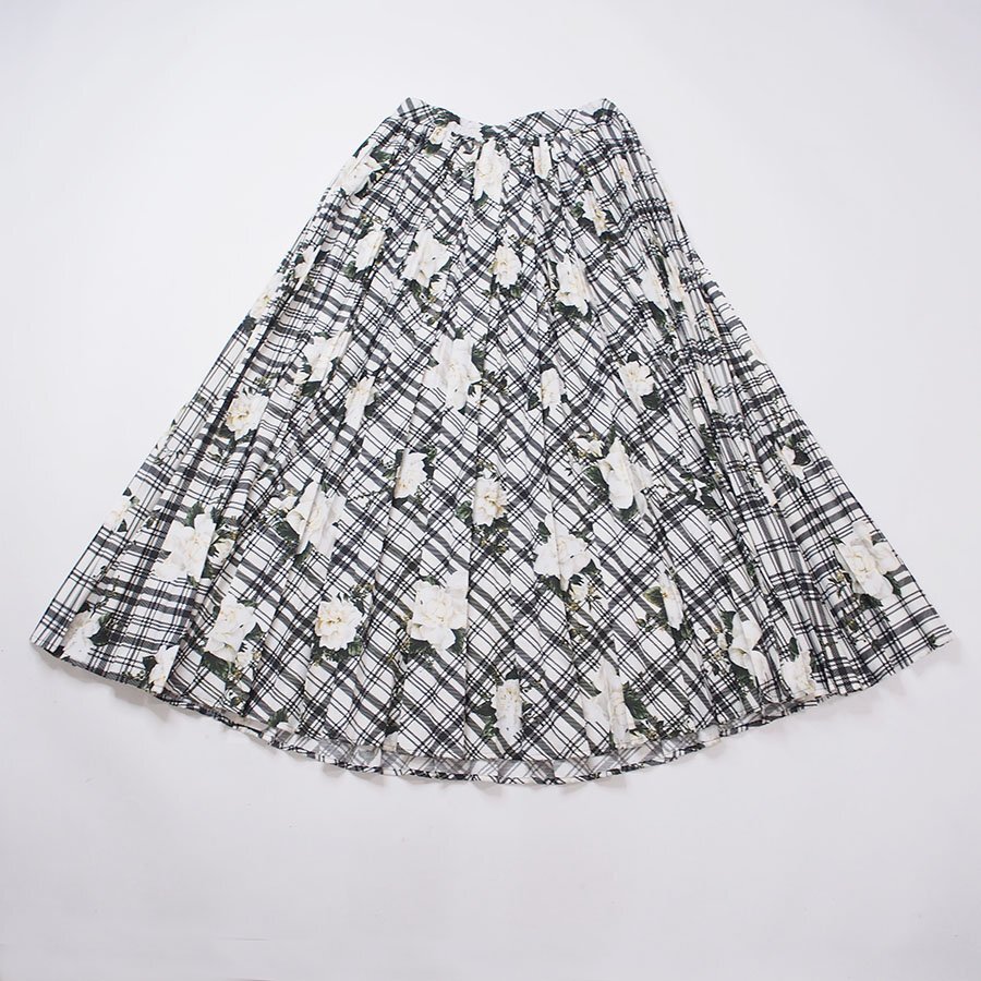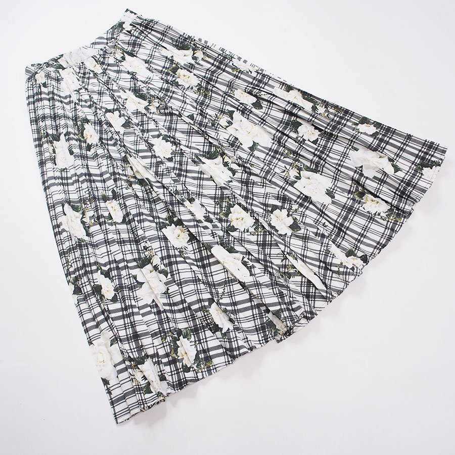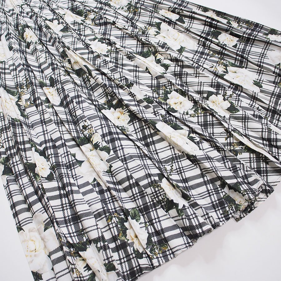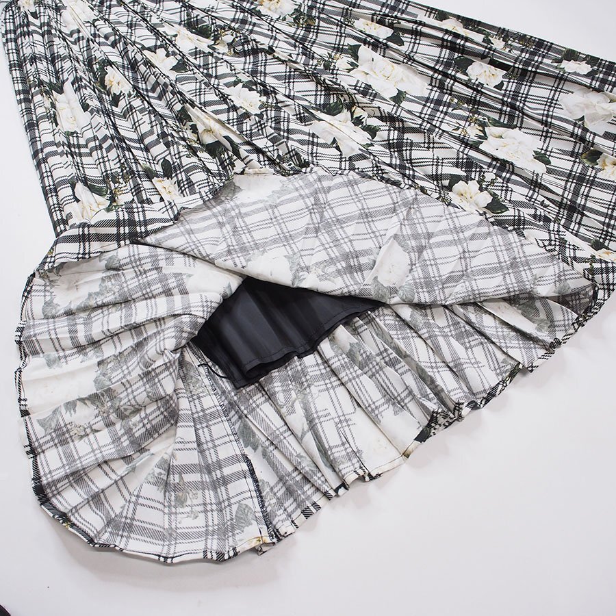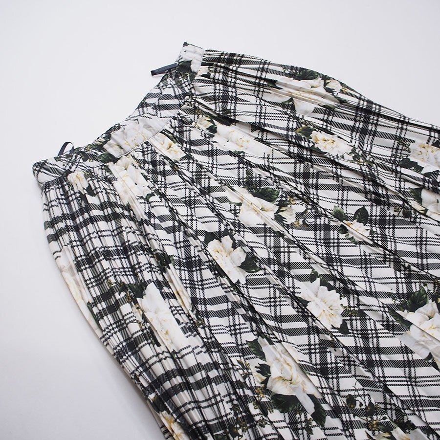 黒 オフホワイト チェックに花プリント プリーツ スカート
