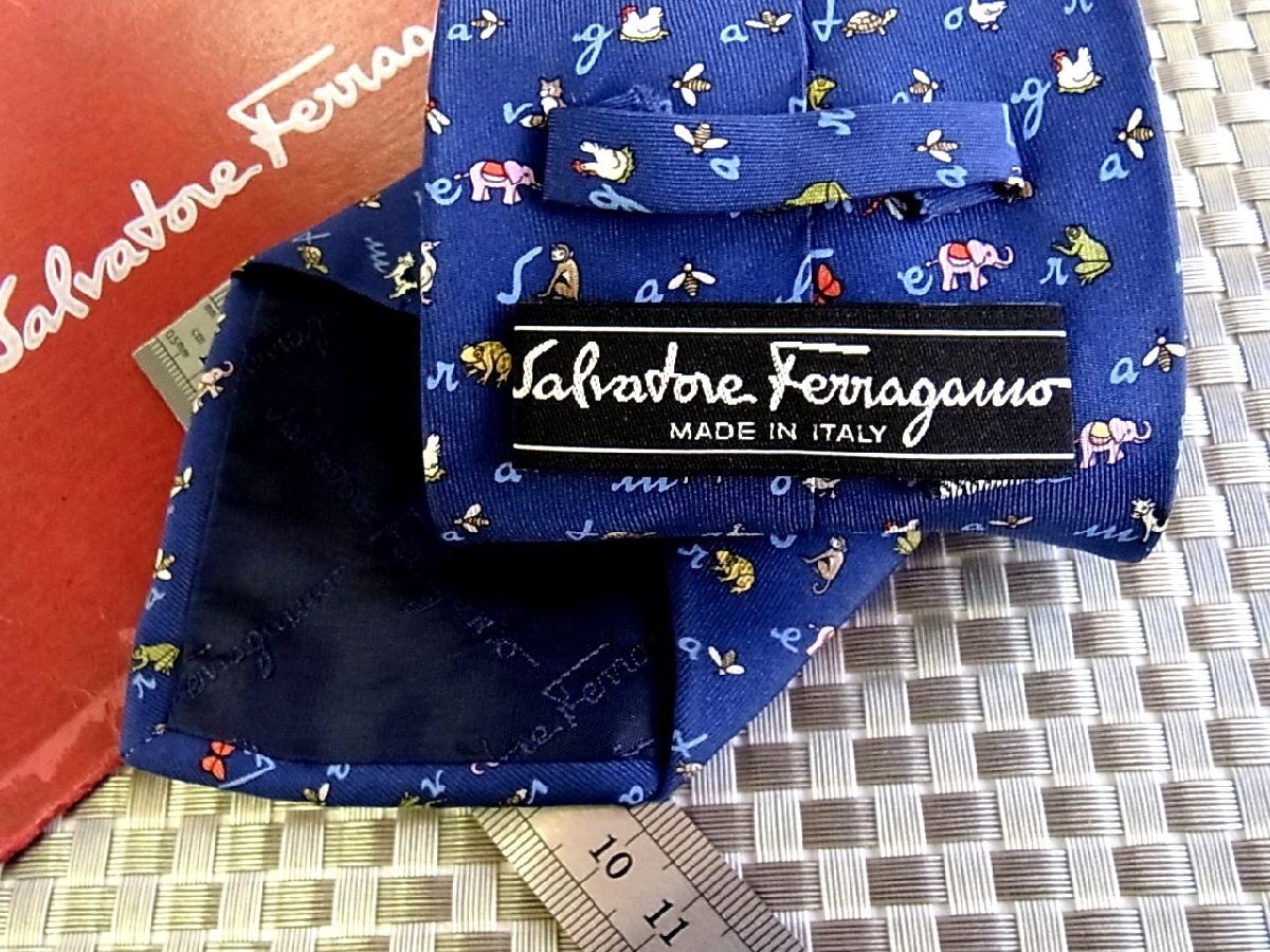 ♪37188D♪状態並品【ゾウ サル ウシ トンボ カエル チョウ 文字 柄】フェラガモ【FERRAGAMO】ネクタイ