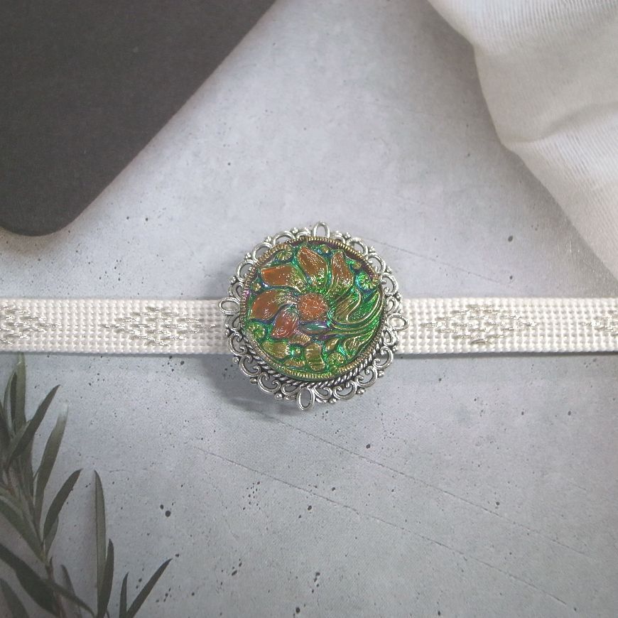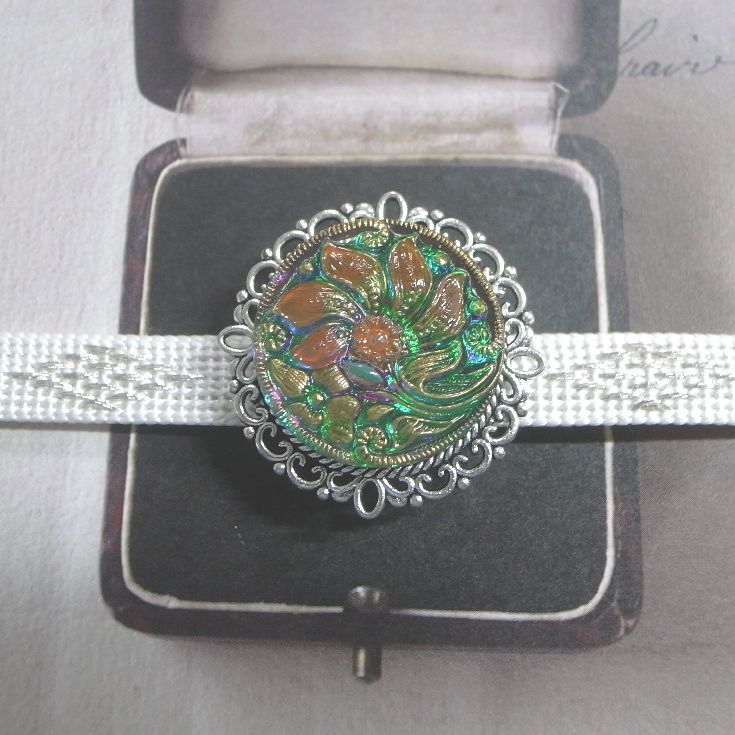 LEAF CLUB ♪ハンドメイド 帯留め 帯留 チェコ ガラス ボタン フラワー 花 アンティーク ビンテージ ヴィンテージ グリーン ④