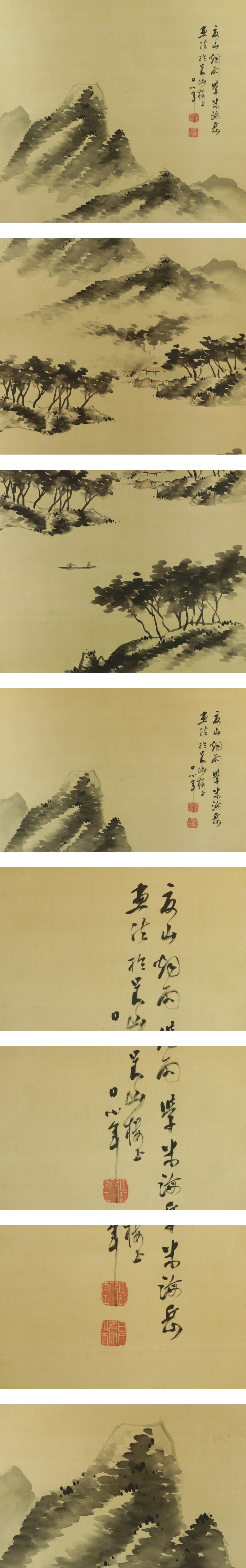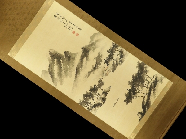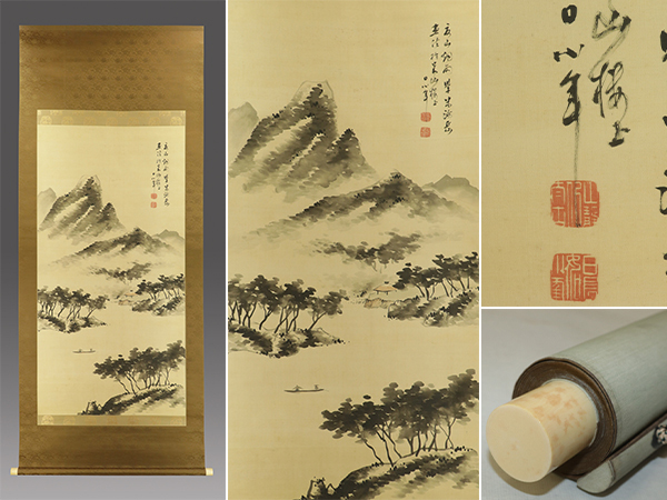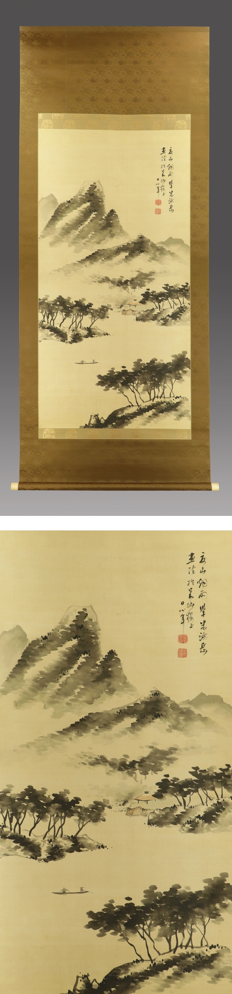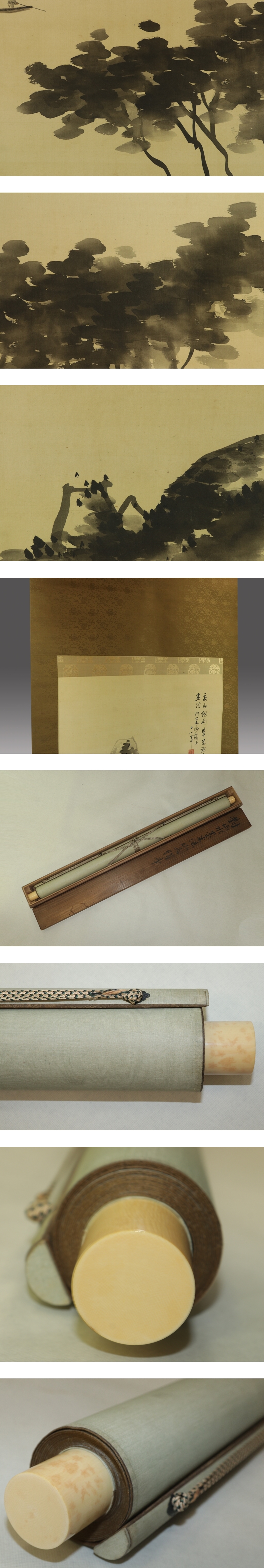 日根対山 ひね-たいざん(1813-1869) 江戸時代後期の画家。 文化10年生まれ。はじめ土佐派を学ぶ。 のち京都の貫名海屋に学問,書画の指導をうけ,文人画山水を得意とした。 明治2年3月13日死去。57歳。和泉(大阪府)出身。 名は盛長。字は小年。別号に茅海(ぼうかい),錦林子など。 本紙は、染み、汚れ、軽い皺、ヤケがあります。 表装は、染み、汚れ、軽い皺、軸先に変色があります。 【サイズ】 作品 横約69cm×縦約138cm 表装 横約86cm×縦約214cm |