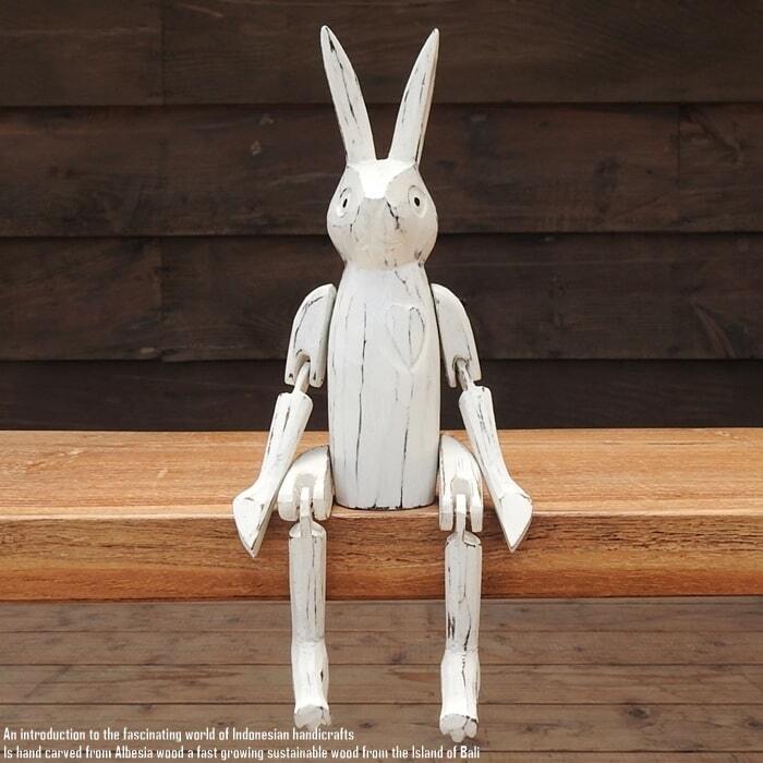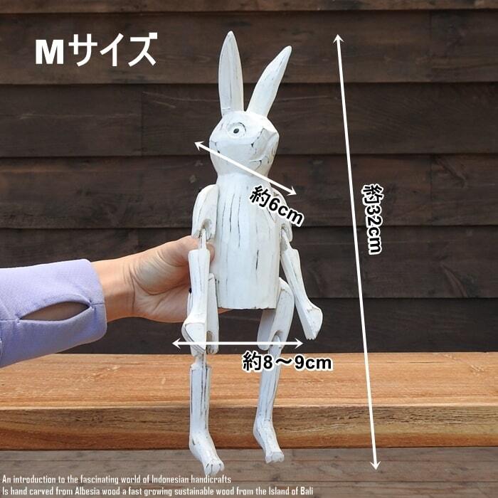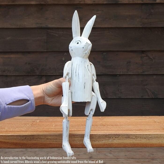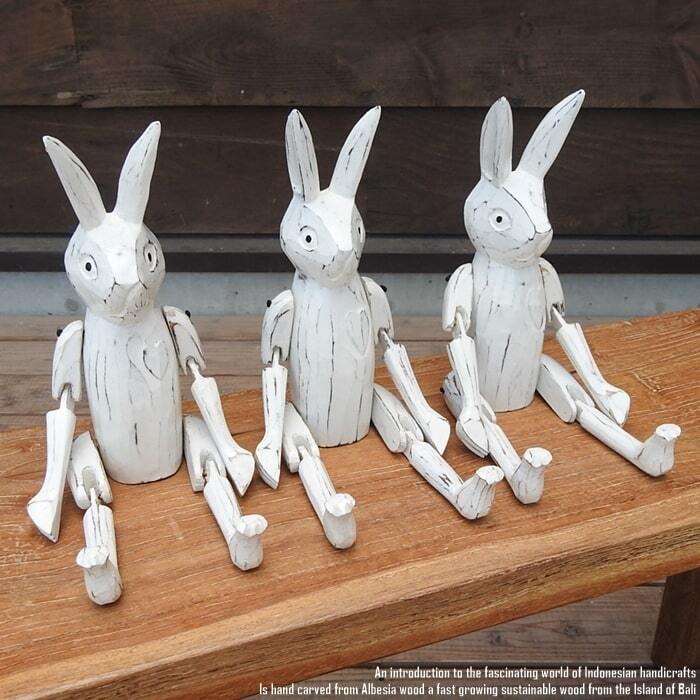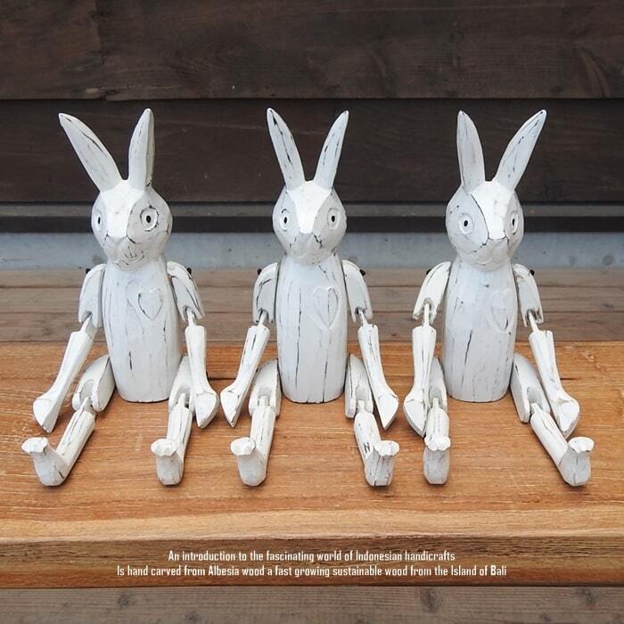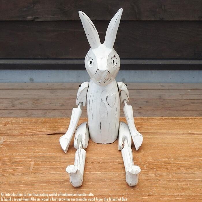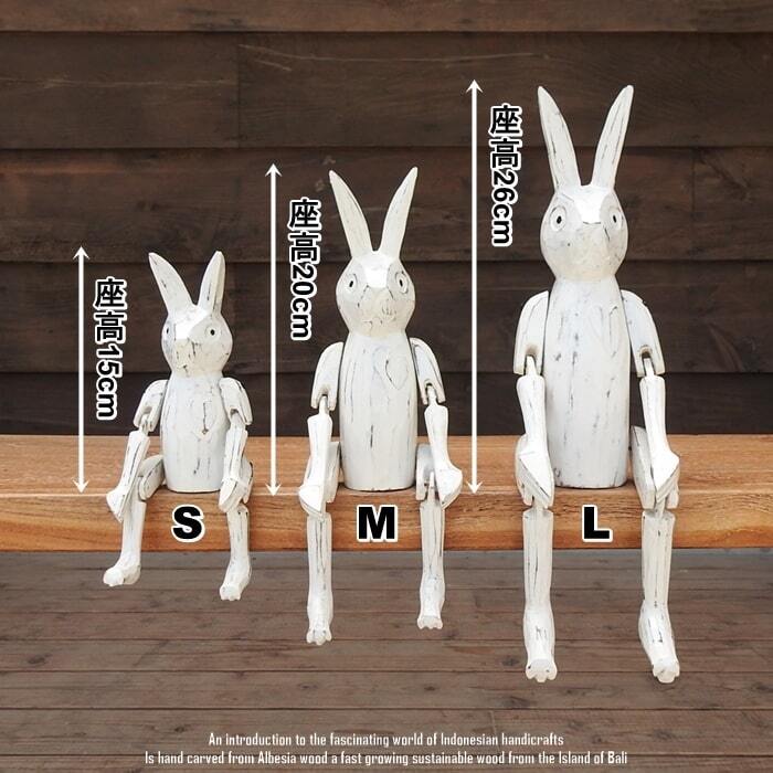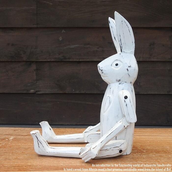 バリ島の職人さんが1点ずつ手彫りして手塗りした、お座りうさぎさんの白のMサイズモデルです。
