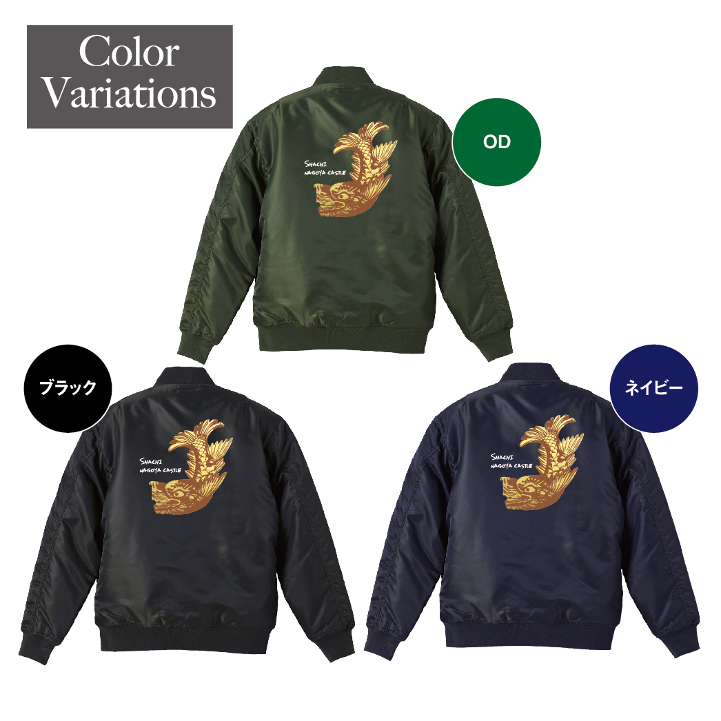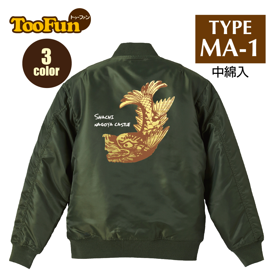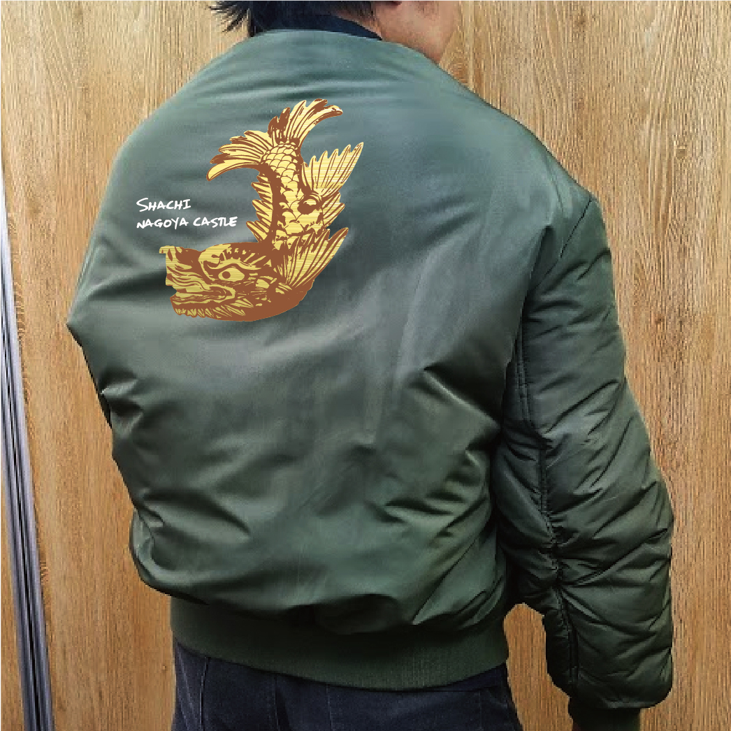 名古屋城の象徴である金のシャチホコが大胆にバックプリントされたタイプMA-1ジャケットは、オリジナルデザインで個性を引き立てます。中綿入りで暖かく、3色展開で選べる楽しさも。カジュアルなスタイルにぴったりで、街歩きやアウトドアシーンで活躍します。名古屋の文化を身にまとい、特別な一着を楽しんでください。※画像はイメージとなり、実際とは多少異なりますので予めご了承ください。※実際にお持ちのジャケットとサイズ表をよくご確認の上ご購入ください。※受注生産となるため、返品、交換はご遠慮ください。※料金は1枚での価格となっております。