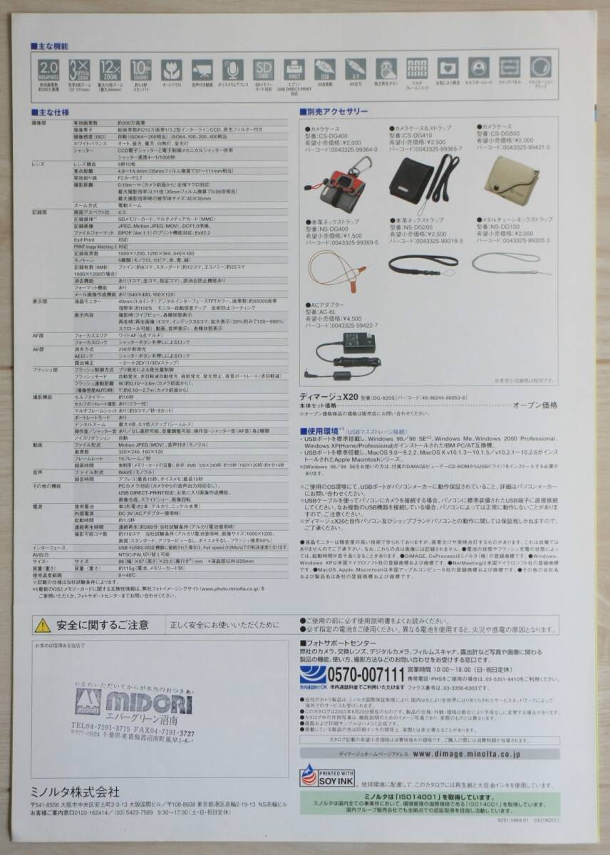 【カタログのみ】MINOLTA ミノルタ DiMAGE X20 光学3倍ズームデジタルカメラカタログ 2003年6月版 です。