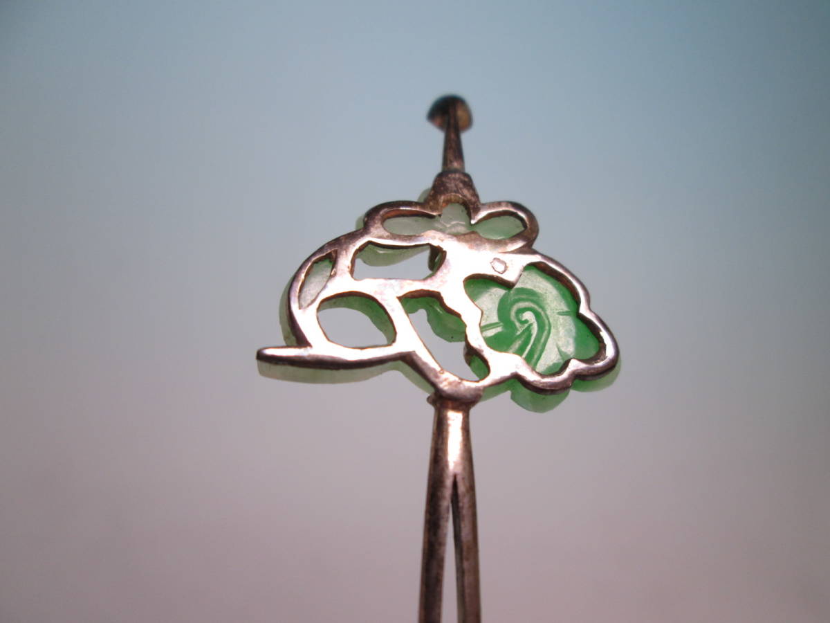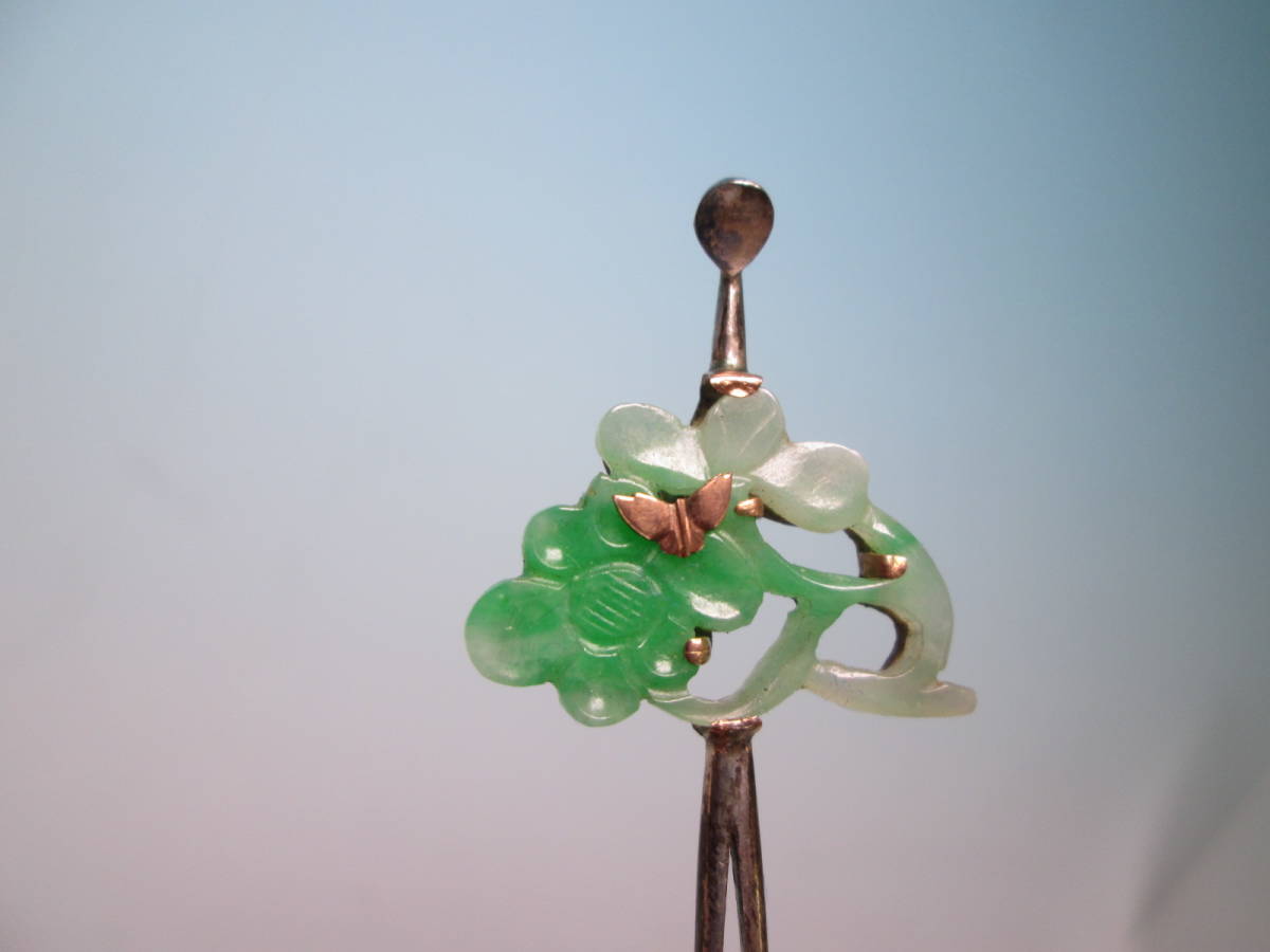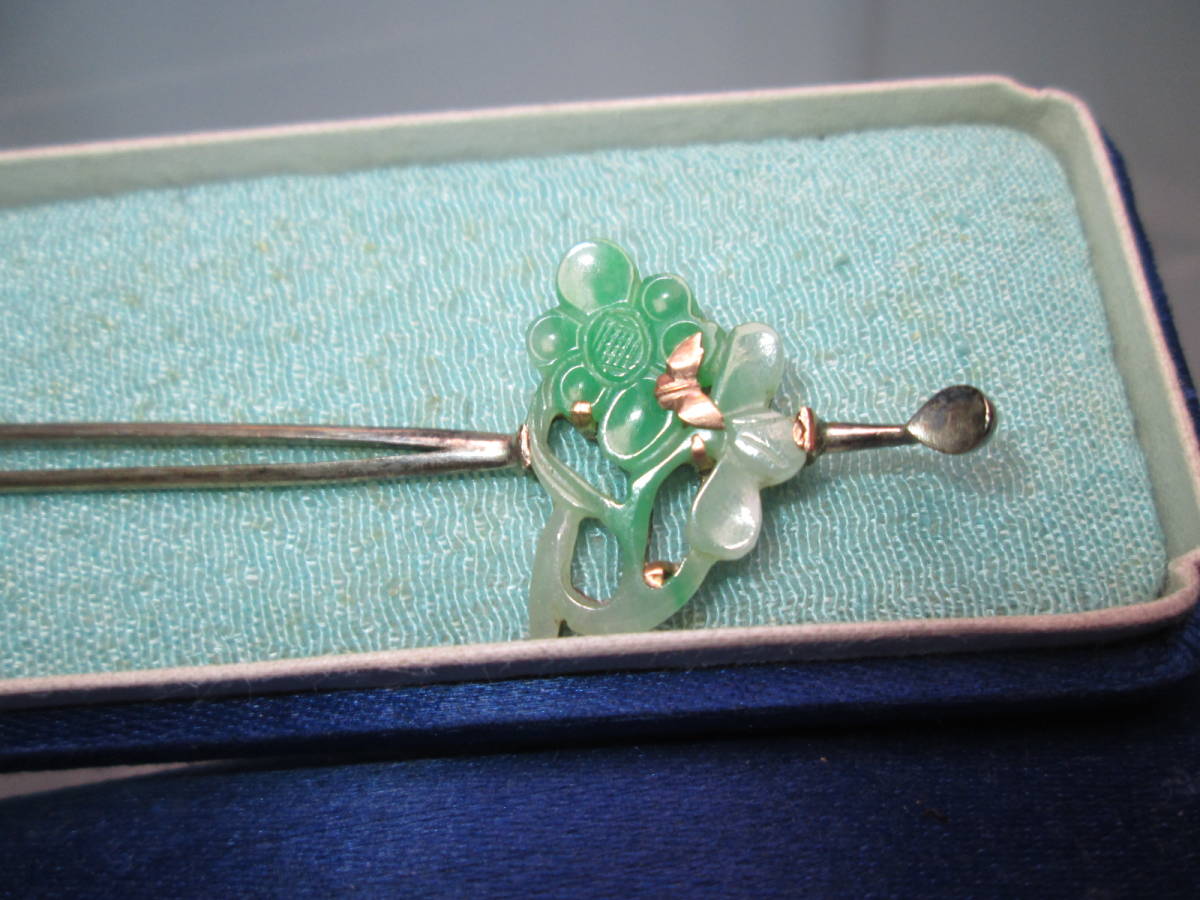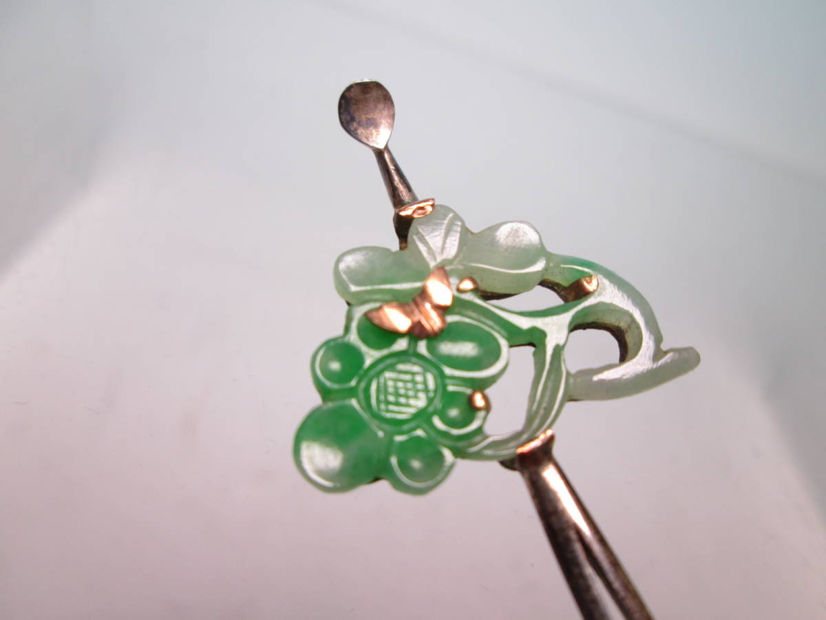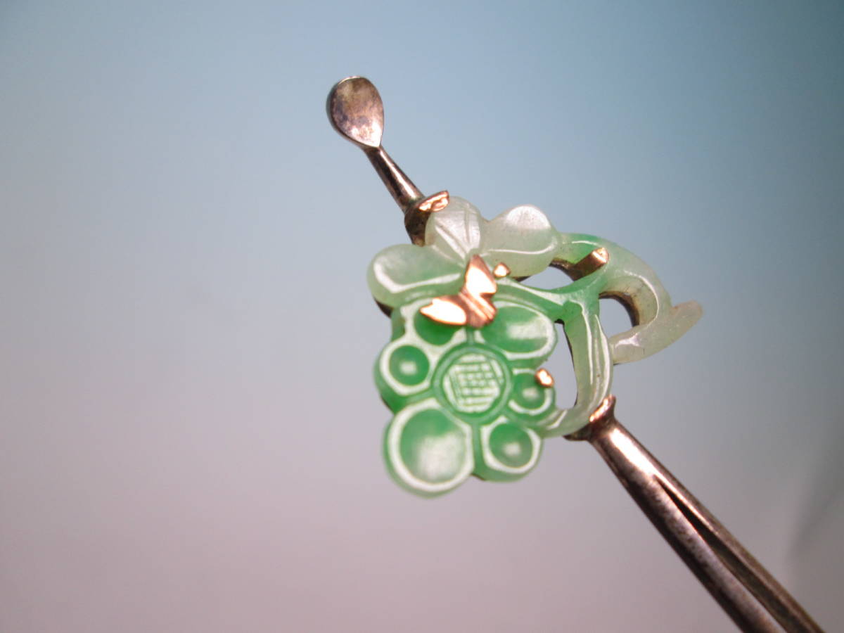 【江月】アンティーク・彫金細工 本翡翠 梅花透かし彫刻のかんざし 5,19g 共ケース付