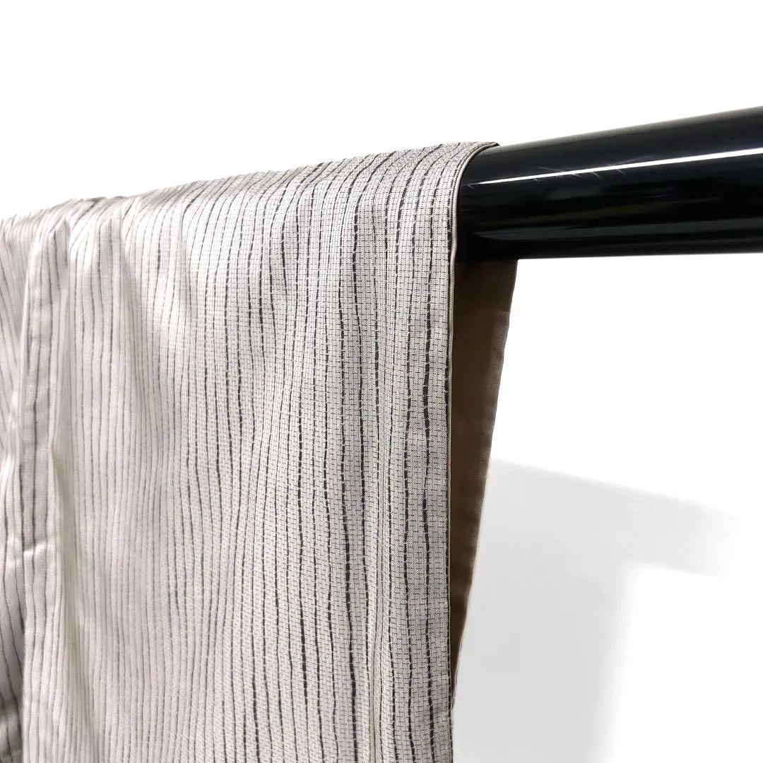 薄く紫のかかった薄いグレーの大島紬地によろけ縦縞が描かれたお洒落なデザインの一着です。