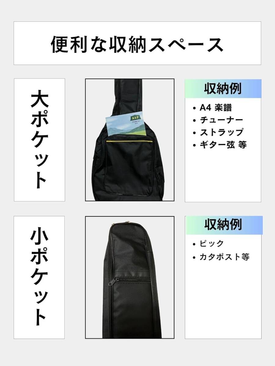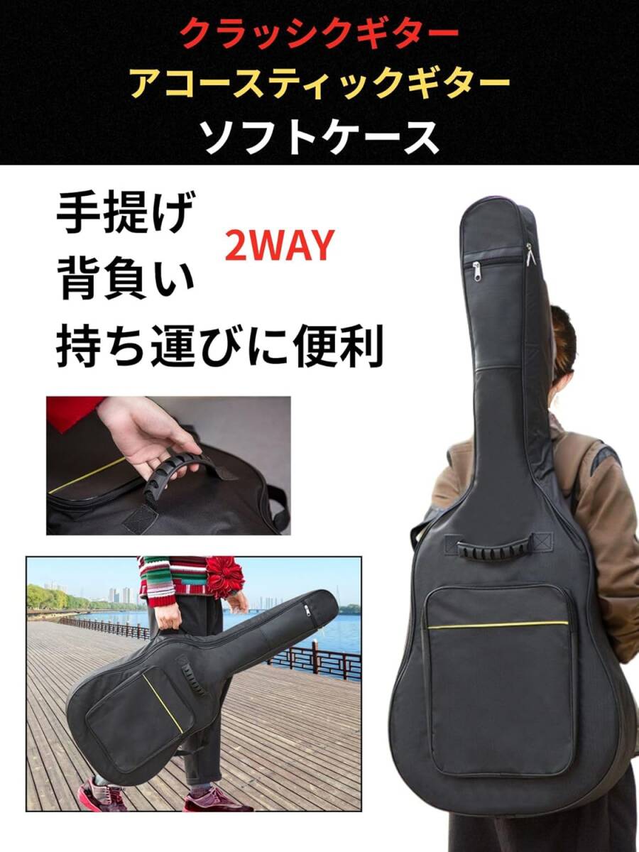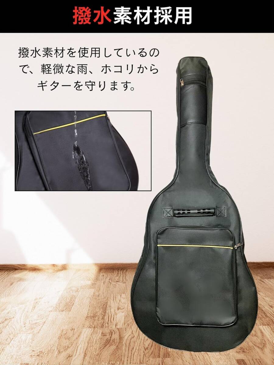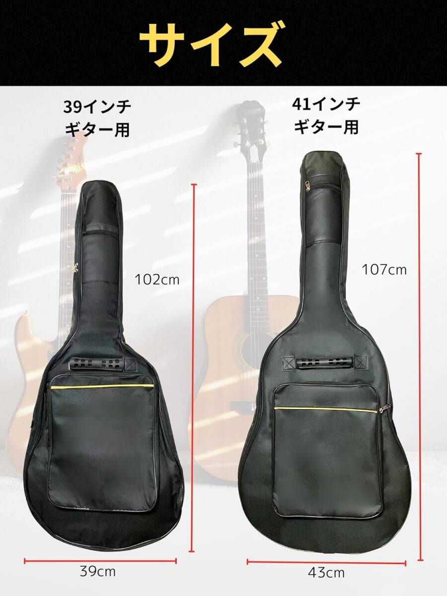 オックスフォード生地を採用のギターソフトケースです。【サイズ:重量】39インチ:102cmx39cmx12cm 480g 多少の測定誤差はご容赦ください。 全体に5mmのクッションパッドがあり、日常の移動や軽い旅行での持ち運びの際に傷、擦り傷から大切なギターを保護します。 2か所のポケットがあり、正面に大ポケット、ネック部分に小ポケットあります。スマートフォン、iPad、A4の楽譜本、楽譜ファイル、チューナー、ピック、ストリング、ケーブル、カポス、アクセサリなど小物をたくさん収納可能です。シンプルかつエレガントなデザインで、どんなスタイルにもマッチします。 撥水加工生地を使用しているので、多少の雨に対する撥水性、防水性や チリ、埃、砂などに対する防塵性が期待できます。音楽愛好家やプロフェッショナルギタリストにとって、大切なギターをしっかり守ることが非常に重要です。このソフトギターケースは、あなたのギターを安全かつスタイリッシュに保護するために設計されています。 ショルダーストラップが長さ調整できます。また、クッション素材を採用しているので、肩への負担を減らします。 ギターケースの正面に手提げグリップ、、側面部には手持ちグリップが付いてるので、毎日の練習やライブ演奏の移動、出演、リハーサルや授業などの持ち運びにとてもに便利です。 生産時期により色、細部が変更になる場合がありますご了承ください。モニターや光の加減で実際の見え方と違う場合があります。金属アレルギーの方はご購入をお控えください。ボタンの摺動抵抗には個体差があります。製品の特長検品の際の箱の痛みのある場合があります。小さな部品があります。口の中には絶対に入れないでください。窒息などの危険があります。小さなお子様やペットの手の届かない場所に保管して下さい。 本品を引っぱる、投げるなど乱暴に扱わないでください。破損やケガの原因となり危険です。 ●できるだけ在庫を確保できるよう努めておりますが、他サイトでも販売していますので、稀に在庫がない場合があります。あらかじめご了承ください。よろしくお願いいたします。 ●ご連絡・発送は、祝祭日&長期休暇を除いた、月~金の10~17時までとさせていただいております。※年末年始12/28-1/5、GW、お盆期間は臨時休業とさせていただいております。お取引件数が多い場合は連絡、発送が遅れる場合がございます。 ●臨時休業の場合は落札通知のメッセージに記載しております。 ●連絡が取れない場合は落札者都合で取り消しさせていただくこともございます。評価に「悪い、非常に悪い」が付いている方は、キャンセルさせていただきます。新規IDの方、評価に「どちらでもない」が付いている方は、内容によりキャンセルされていただく場合があります。