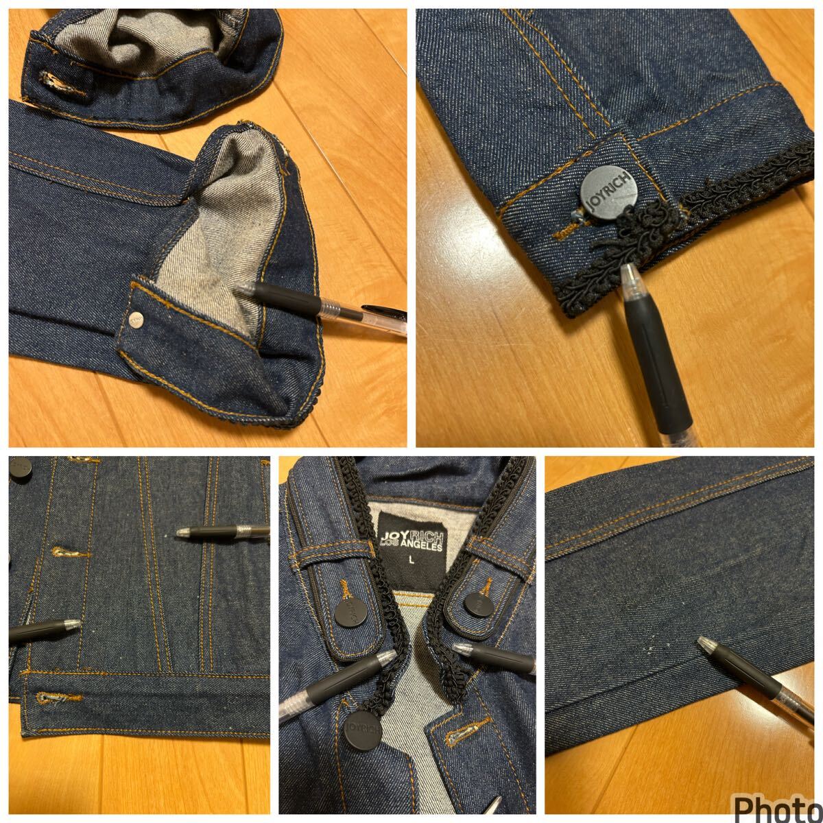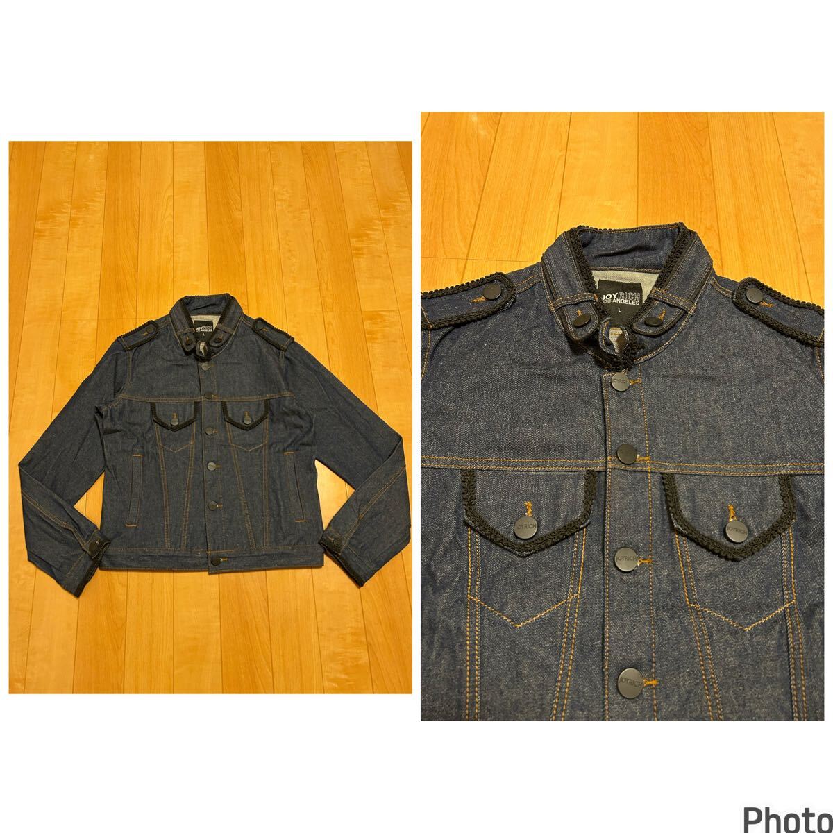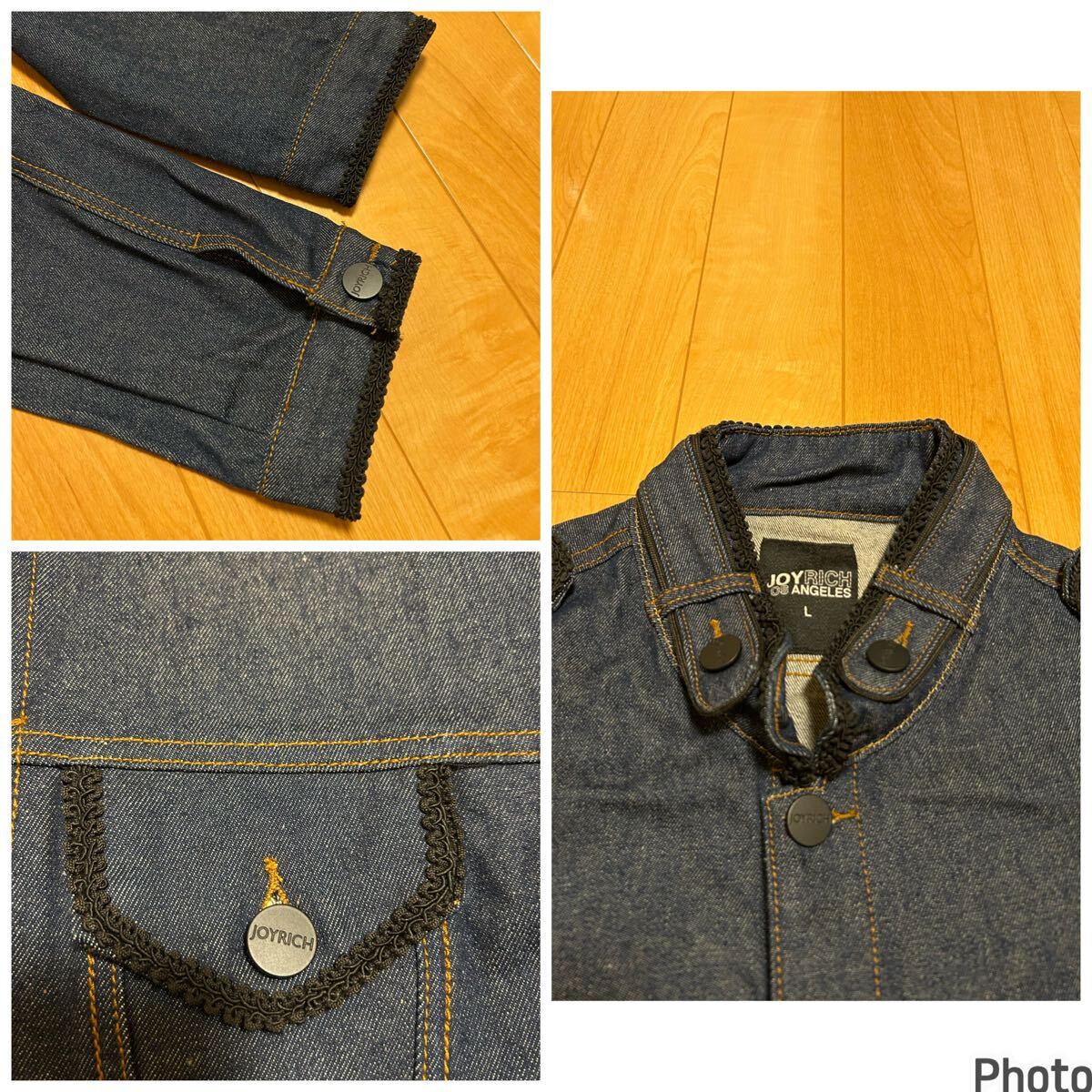 着用少な目.美品☆JOYRICH/ジョイリッチ L.A. メンズサイズL 特濃紺インディゴデニムジャケット 黒レース&ボタンデザイン 襟無しスタンド
