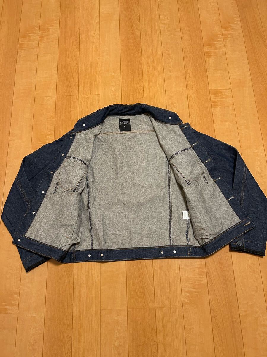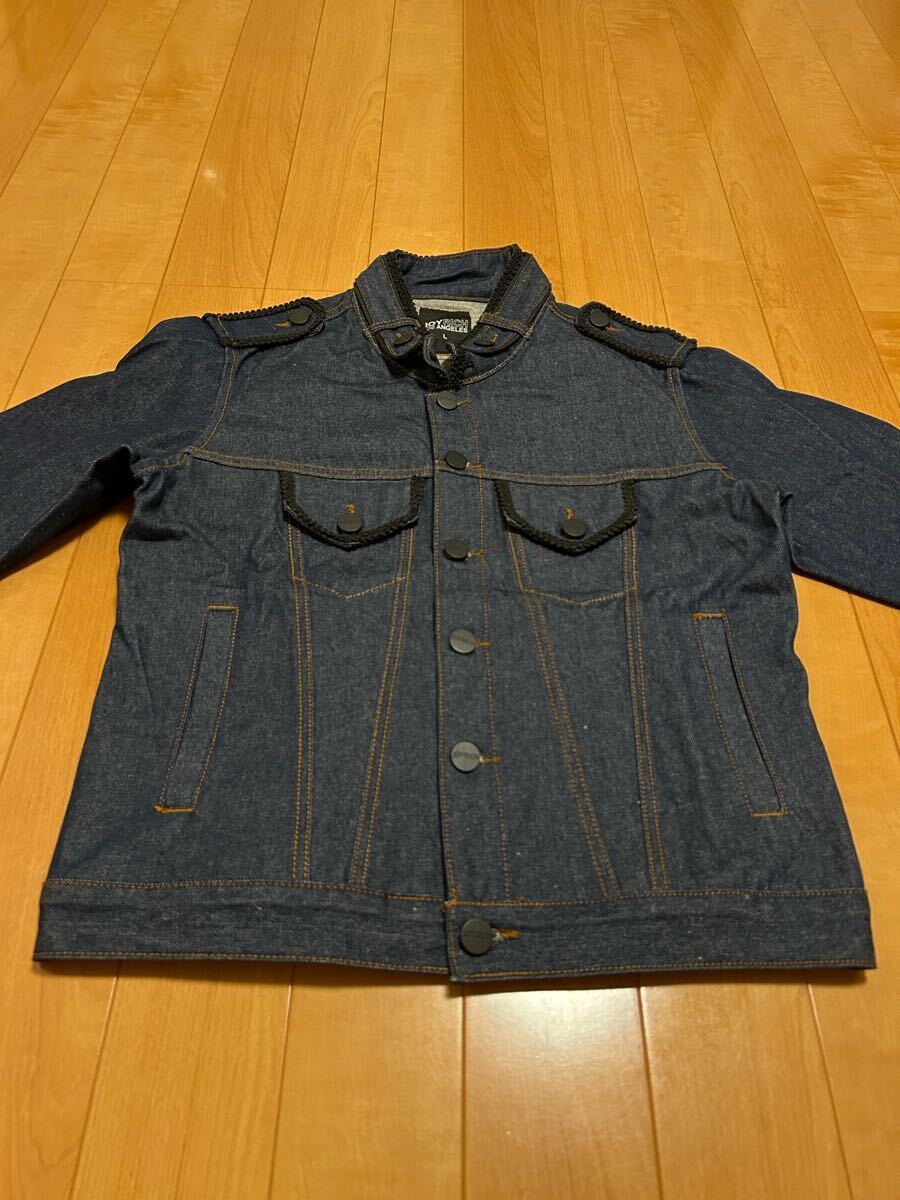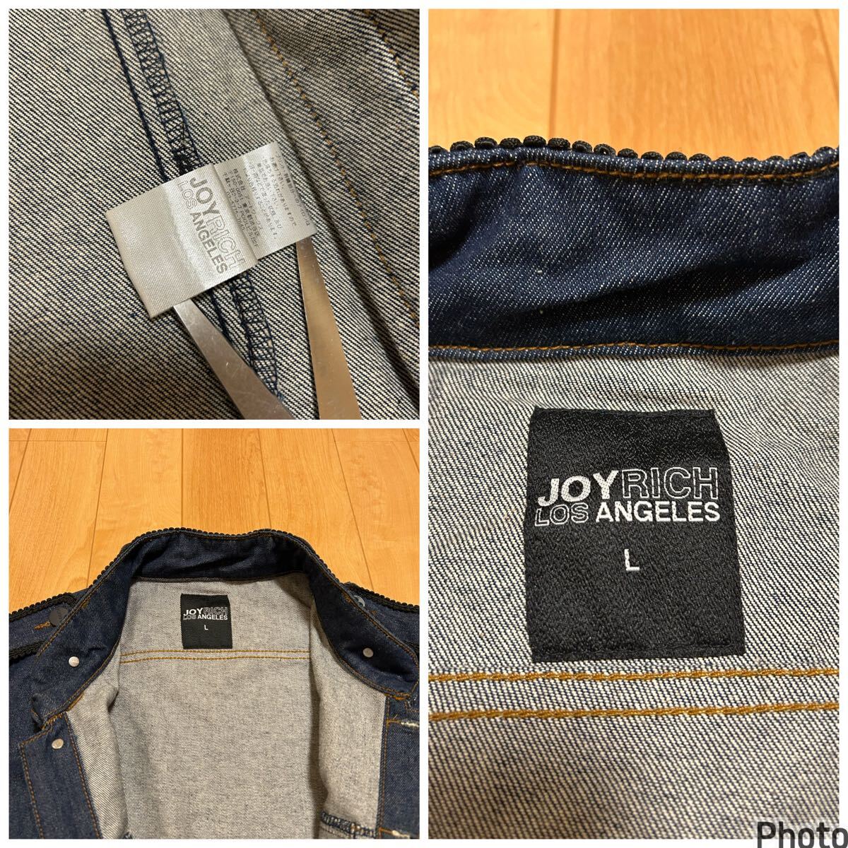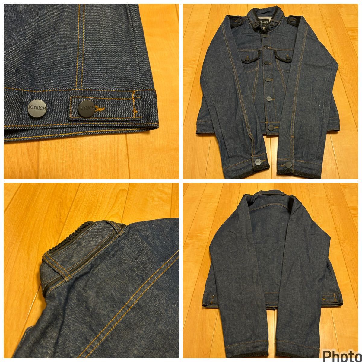 着用少な目.美品☆JOYRICH/ジョイリッチ L.A. メンズサイズL 特濃紺インディゴデニムジャケット 黒レース&ボタンデザイン 襟無しスタンド