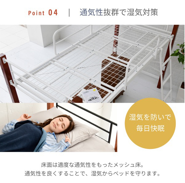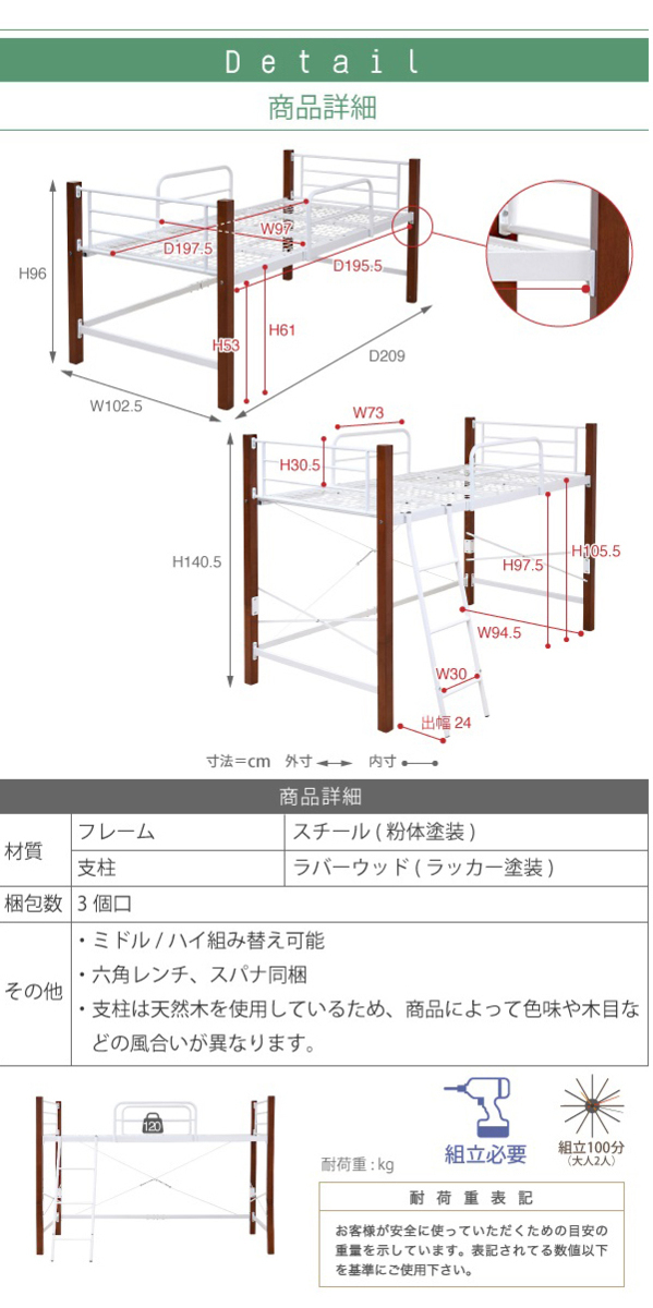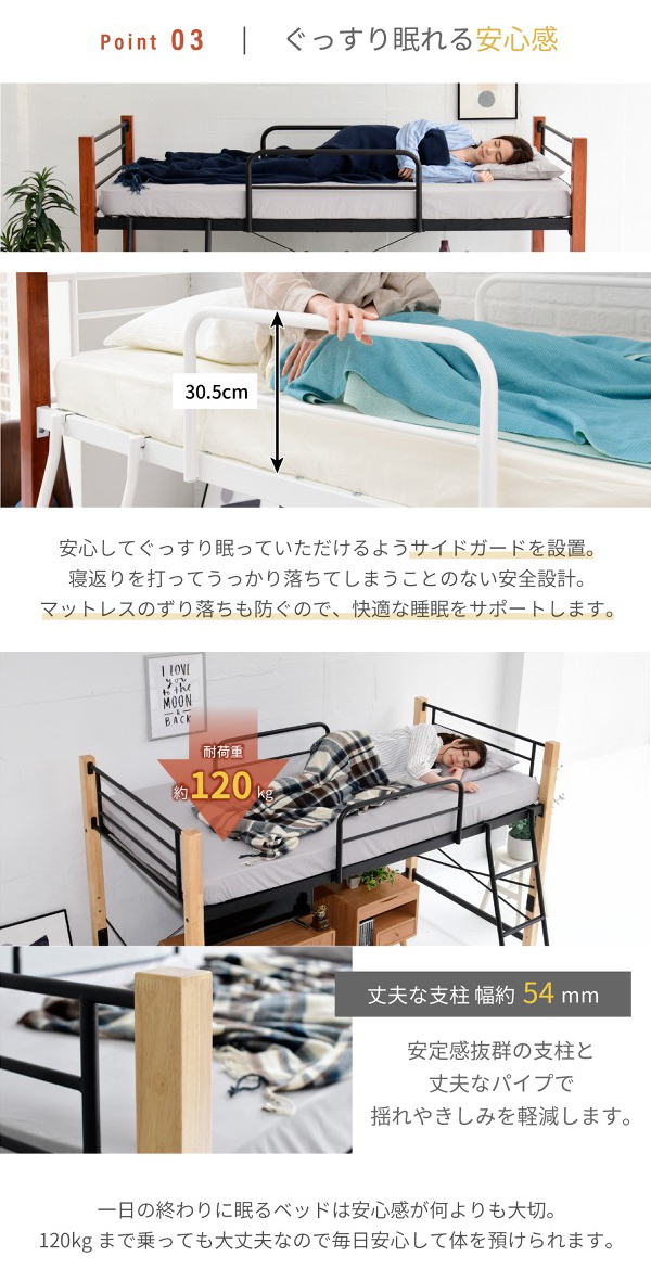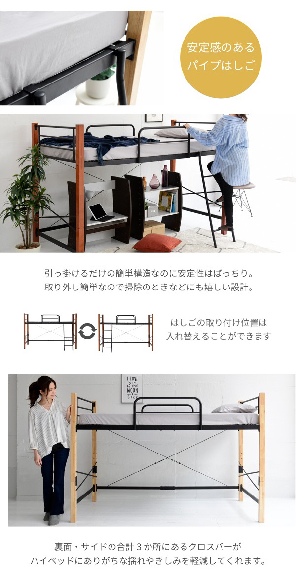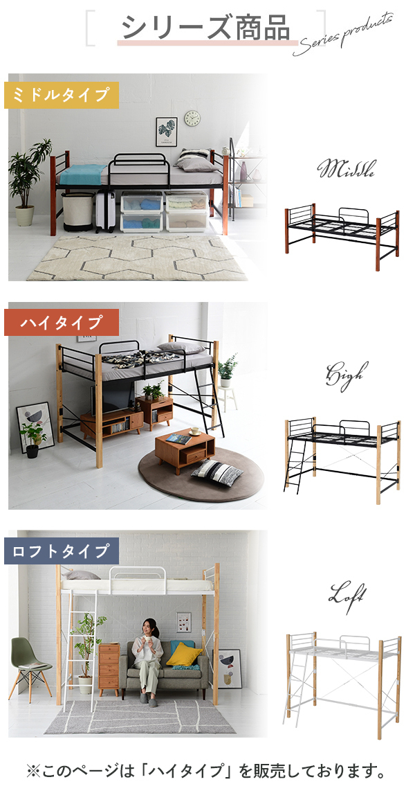 | 商品説明: | 温かみのある天然木とクールなスチールのコントラストがおしゃれな、ちょっと低めのロフトベッド。 【商品仕様】 ■本体サイズ [外寸]約幅102.5×奥行209×高さ140.5cm ■その他サイズ [内寸] 【共通】 (床面)約幅97×奥行197.5cm (サイドガード)約幅73×高さ30.5cm 【ミドルタイプ】 (床面高さ)高さ61cm (床面下)約幅94.5×奥行195.5×高さ53cm 【ハイタイプ】 (床面高さ)高さ105.5cm (床面下)約幅94.5×奥行195.5×高さ97.5cm (はしご出幅)24cm ■材質 [フレーム]スチール(粉体塗装) [支柱]ラバーウッド(ラッカー塗装) ■耐荷重 [床面]約120kg以下 ■備考 ・ミドル/ハイ組み替え可能 ・六角レンチ、スパナ同梱 ・支柱は天然木を使用しているため、商品によって色味や木目などの風合いが異なります。 ■生産国 マレーシア ■組立時間(目安)(大人2人) お客様組立(100分) ■キーワード パイプベッド ロフト ハイベッド ハイベッドフレーム ミドル ミドルタイプ 木製 アイアン 小部屋 ホワイト おしゃれ 木 白 組み立て 黒 組立 組立有 大人 子供 子ども 子供部屋 こども キッズ 中学生 こども用 高い 高さ調整 調節可能 鉄 梯子 低め 低い 揺れ防止 落下防止 ガード ロー 丈夫 ダークブラウン ブラック ブラウン パイプ 通気性 新生活 民泊 社宅 |