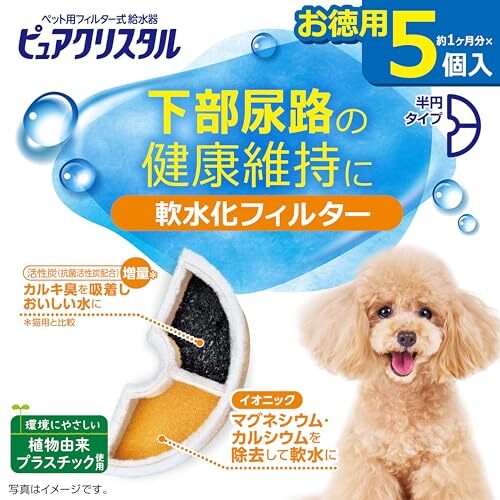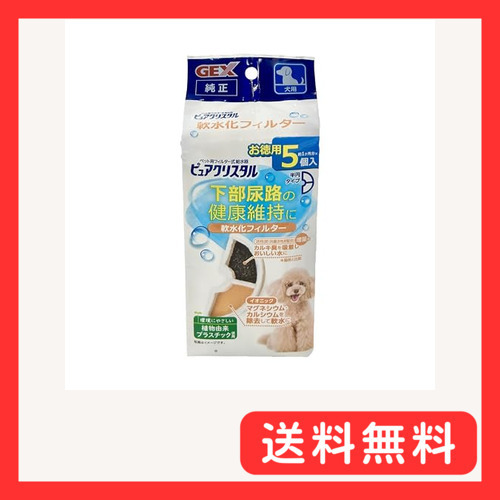 「GEX ピュアクリスタル 軟水化フィルタ半円タイプ犬用 純正 活性炭+イオニック 下部尿路の健康維持 5個入」▼4972547927231▼(商品説明)軟水化フィルタ-/-/4972547927231・Style:軟水化フィルタPatternName:5個入・ピュアクリスタル専用交換フィルタ、軟水化フィルタの約5カ月分のお得パック。・下部尿路の健康維持に ワンちゃんにやさしい水分補給を イオニック(イオン交換樹脂)が、水道水のマグネシウム、カルシウムを除去し、硬度を下げたワンちゃんにやさしい水(軟水)にします。・いつもきれいな水を 活性炭(抗菌活性炭配合)が、カルキ臭を吸着しおいしい水に。不織布で気になる食べカス、抜け毛、ホコリなどをキャッチして、キレイな水を維持します。 下部尿路の健康維持のために、水道水のマグネシウム、カルシウムを除去します。マグネシウム、カルシウムは動物にとって大切なミネラルですが、過剰摂取を防ぐことで健康に配慮できます。日頃から食事、肥満、運動不足なども注意が必要です。異常に気付いた場合は、早急に獣医師にご相談ください。この商品は病気の