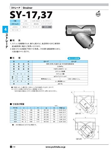 「ヨシタケ Y型ストレナ 80メッシュ 蒸気・空気・非危険流体 ねじ込み接続 接続口径32A 本体SCS 最高温度150℃ 型式SY-17 3」▼4589946531695▼(商品説明)-/-/SY-17 32A・パッケジ個数:1・製造国:日本・適用流体:蒸気・空気・冷温水・油・その他非危険流体・最高圧力:2.0MPa・最高温度:150℃・網目(こし網)80メッシュステンレス鋳鋼製のため、錆の心配が無く、食品関係・化学工業関係・給油配管等幅広くご使用頂けます。 目詰まりからくる流量低下を充分に考慮し、出来る限りろ過面積を大きくした高流量のマリン型です。