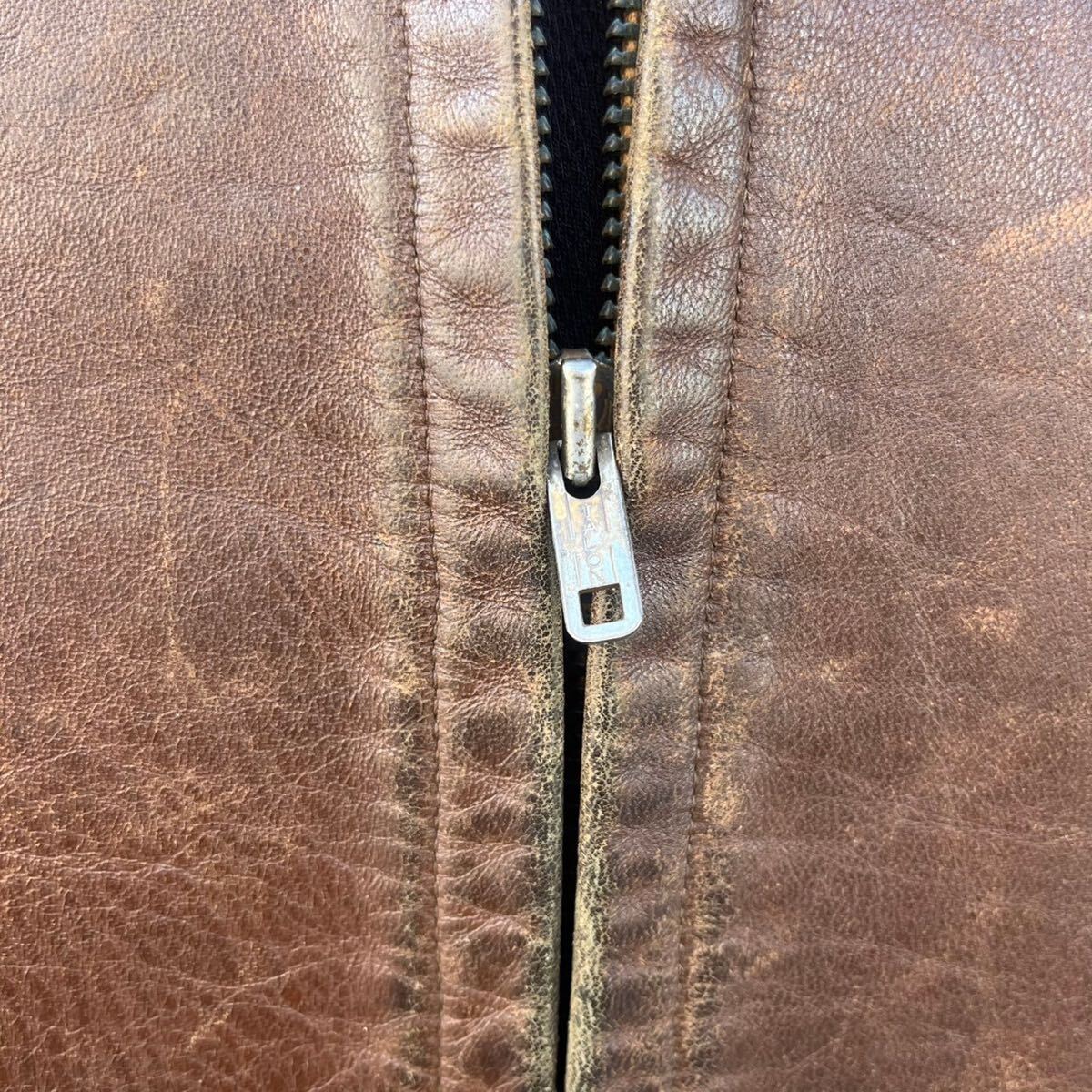 コンディション:フロントジッパー上部にジッパーの破れがございますが、問題なく開閉可能です。襟に破れ、全体的にレザーの禿げ、裏地にシミ汚れがございますが、着用に問題あるダメージはございません。