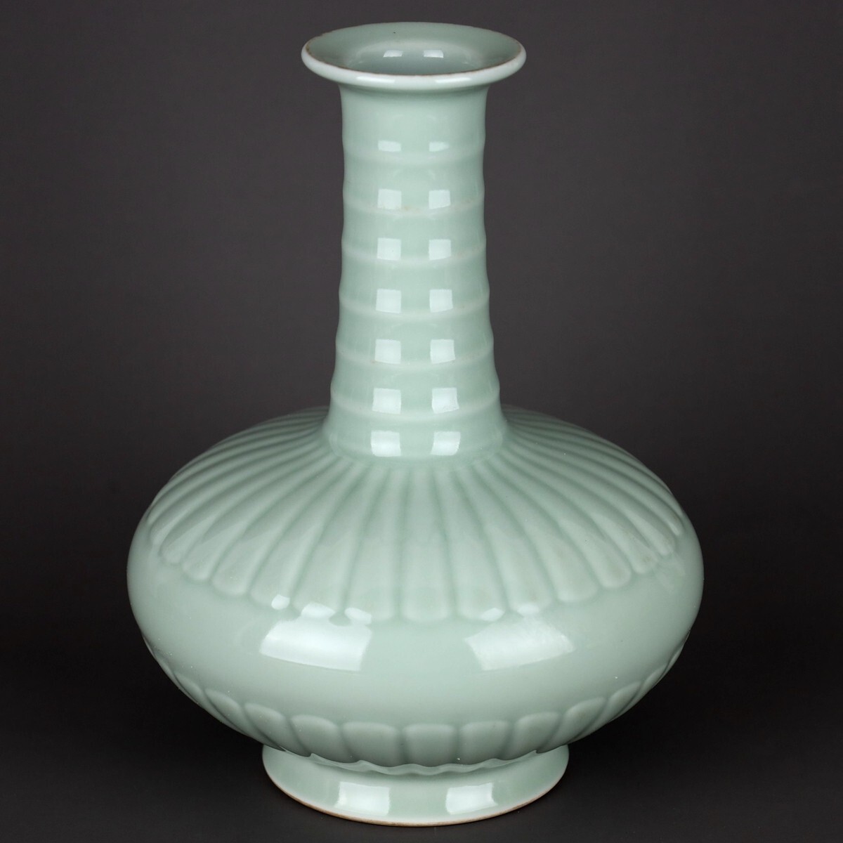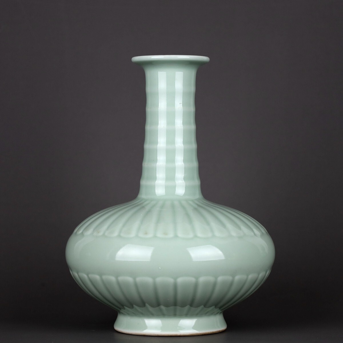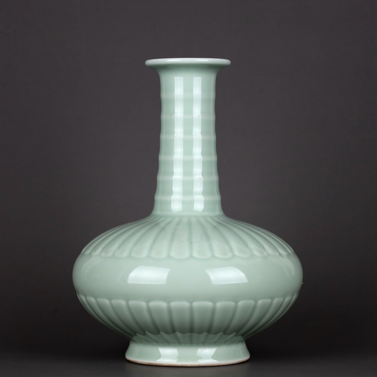 【瓏】陶磁器 豆青釉浮彫菊瓣弦紋長頸盤口瓶 大清雍正年製 染付 置物擺件 古賞物 古美術 陶芸 蔵出