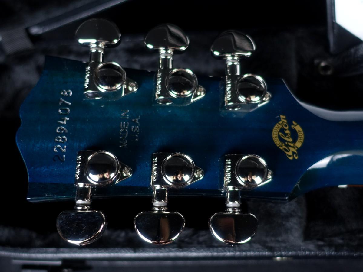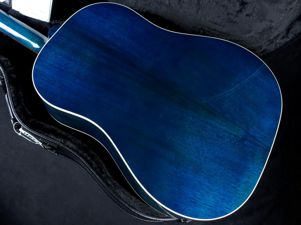 ボディからヘッド裏に至るまで全身ブルーボネットカラーを採用。スプルースとマホガニーの地の色による表情の違いがとても美しいです。