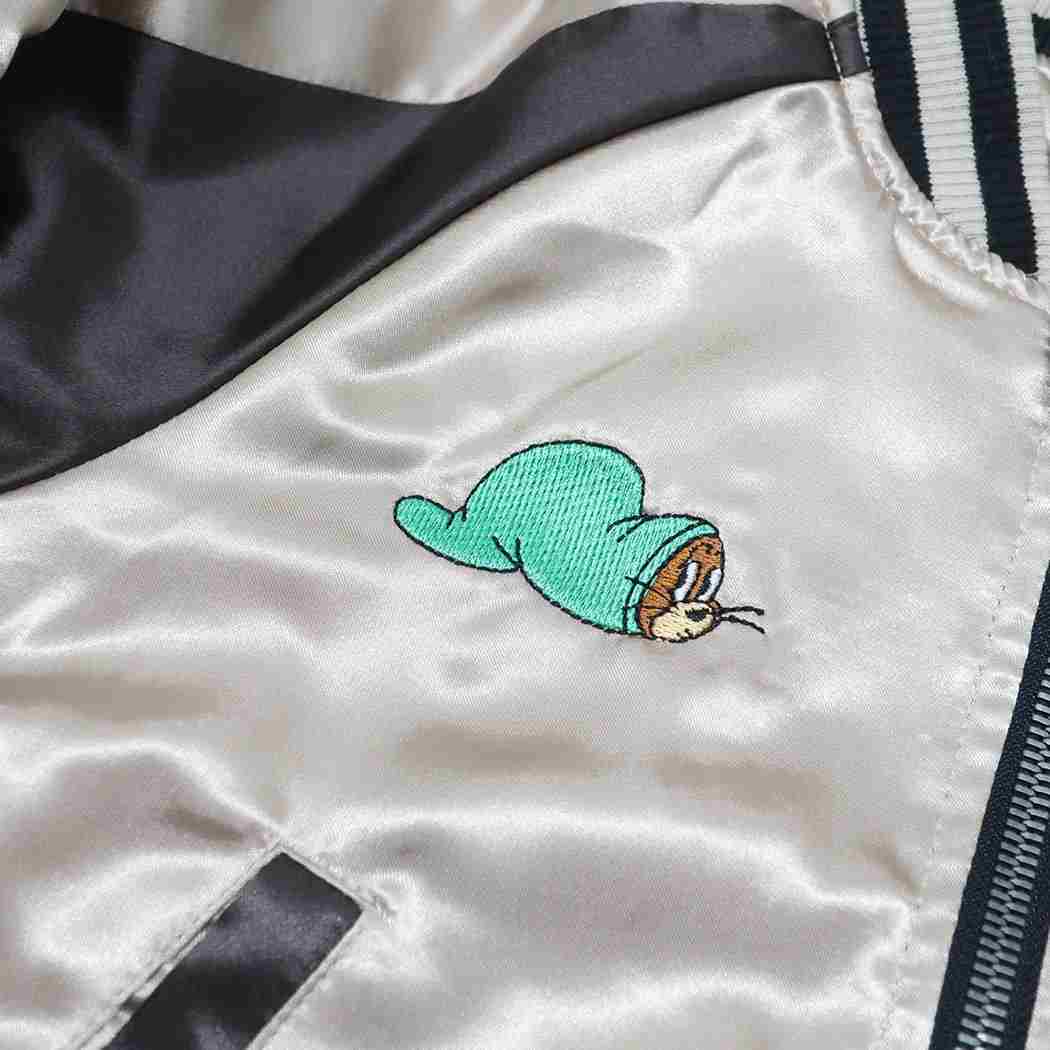 豪華な刺繍デザインがCOOLなキッズ用スカジャンが登場 トム&ジェリーのキュートなファッションアイテムこちらはトムとジェリーのファニーアートやタフィーが刺繍された豪華な[スカジャン]フロント バックに刺繍デザインされています。他にもいろいろあるのでお気に入りを揃えてくださいサイズ:S(胸囲約36cm/裄丈約41cm/着丈約41cm/子供用90サイズ)素材:ポリエステル/中綿