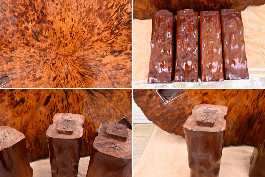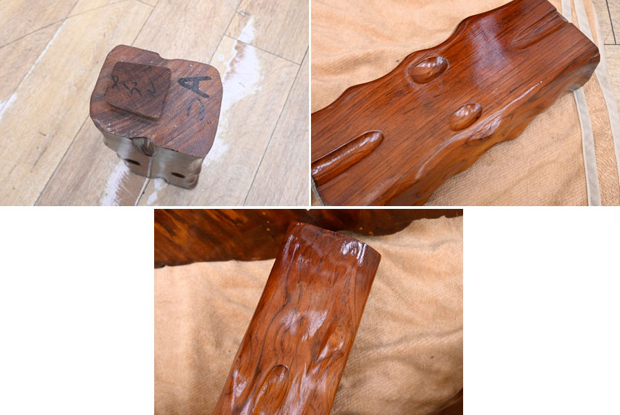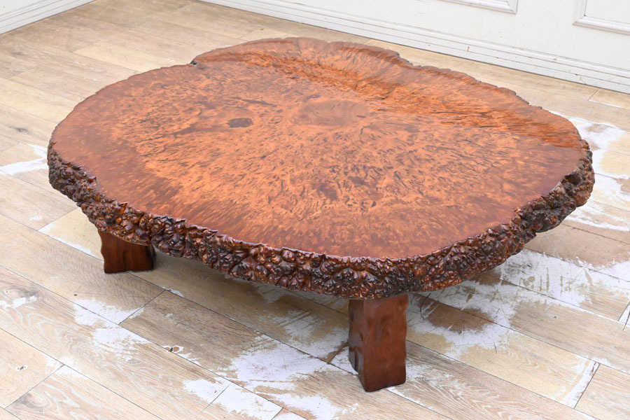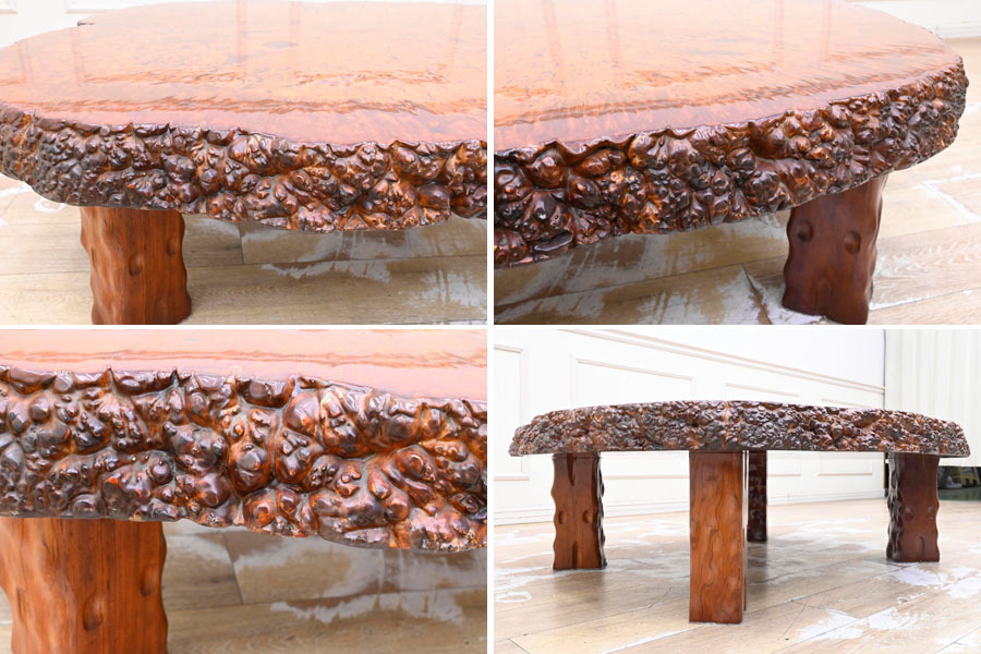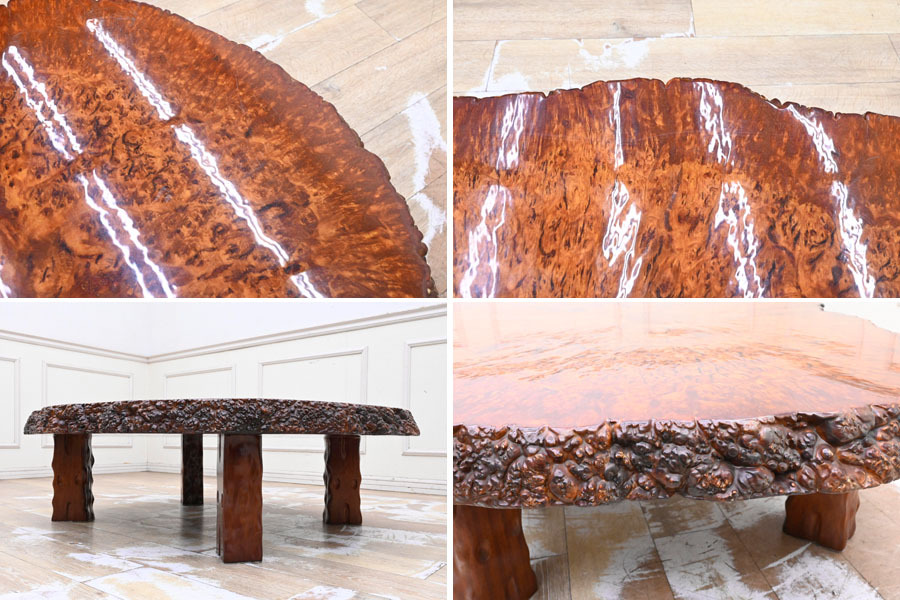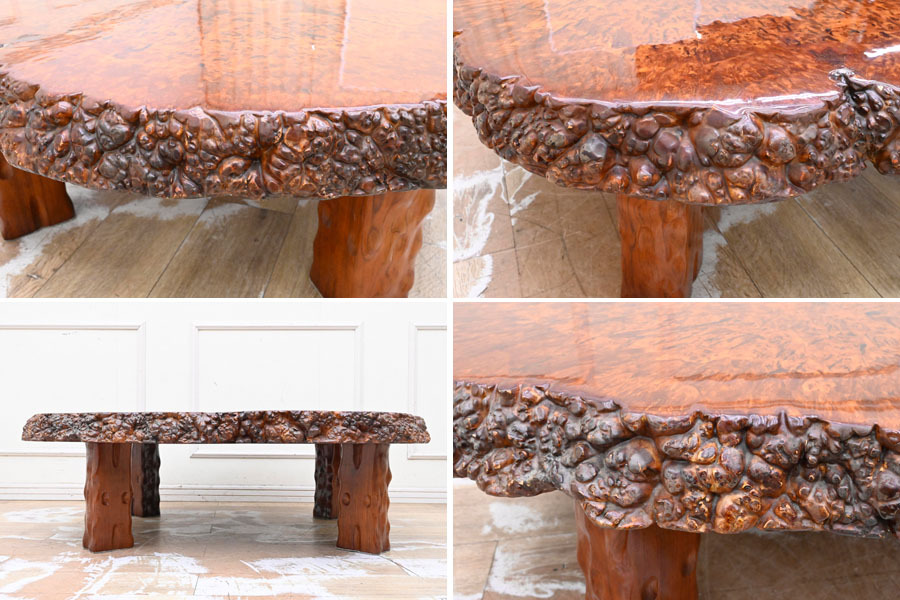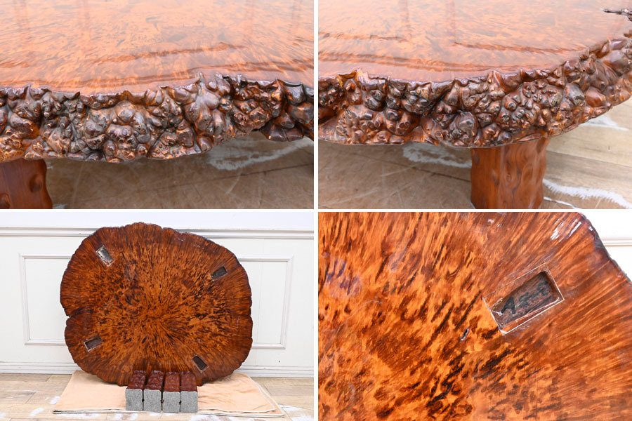 ----------------------------------------------------------------------------------------- ●送料や注意事項は必ずご確認下さい。落札後にトラブルになるケースが増えております。● ◆コンディションは写真・文章にて記載して有りますが、全てのキズの写真は掲載致しておりません。大きなダメージを除き見落とし、記載漏れが有る事はご了承下さい。 ◆当サイトにて出品する商品は多種多彩で、当方商品知識の無い物も多数ありますので落札後の質問やメンテナンス等にはお答えできません。 ◆入札された時点で、画像、文章をご理解していただいたものと判断させていただきます。不明な点は前もってQ&Aからお願い致します。入札後の質問やお電話等でのキャンセルは一切受け付け致しません。 ◆商品説明に「ノークレーム」と記載しているものに関しては、如何なる状況で届いても保証致しません。詳しくは注意事項の「商品到着後について」の最後に記載しておりますのでご確認下さい。 ---------------------------------------------------------------------------------------- 上質で緻密な楓瘤材を使用した座卓、中古品の出品です。 天板を覆う美しい木目は並みの材料とは違う木目を堪能出来る素晴らしいお品ですのでお見逃しの無いように。 幅116x99 高35 厚み7.5cm 【コンディション】 脚1本入りにくい所有り(Aの番号を付けました)、中古品ですのでキズ、ダコン、脚にヒビ、差し込みに欠け、天板横面ガリキズ、コーティング浮き、ハガレ等有りますが、状態は良いでしょう。 非常に見事で希少な木目で、上質な緻密材を使用したお品ですのでお見逃しの無いように。 | ||