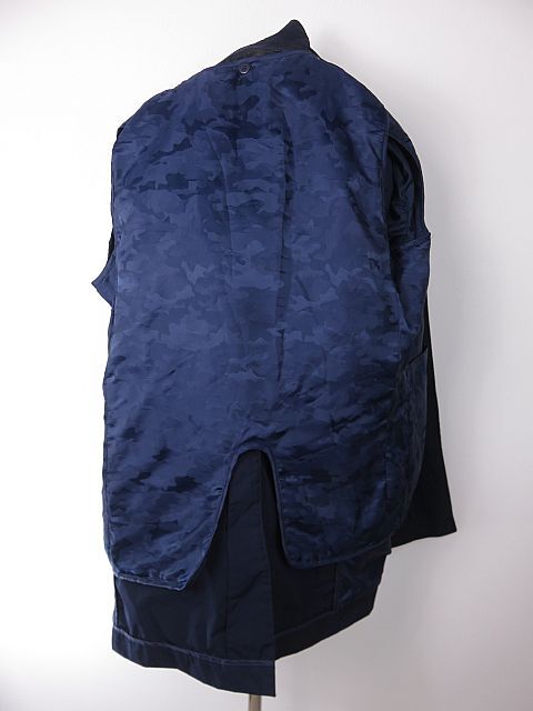 センターボタン留め、薄っすら迷彩柄の取り外し可能なライナー付き、両サイドポケット、センターベンツ