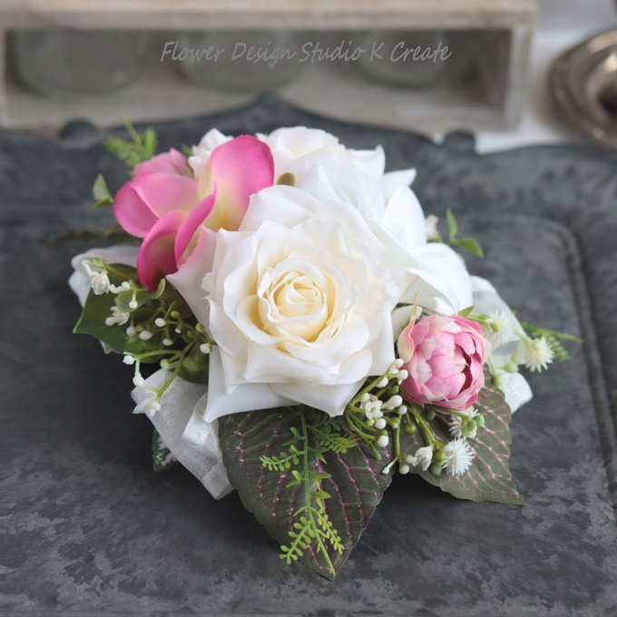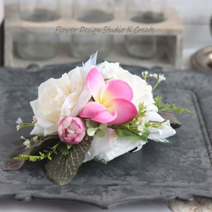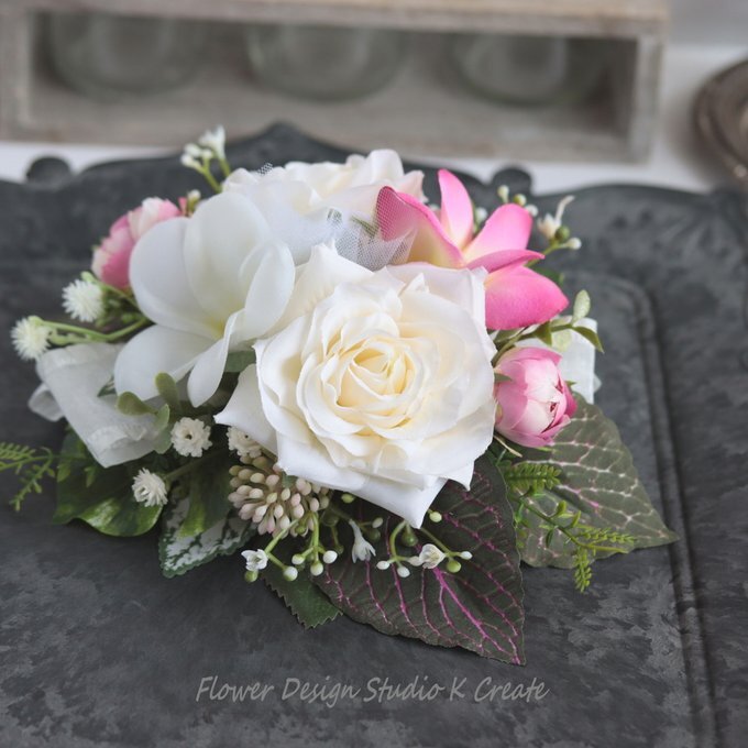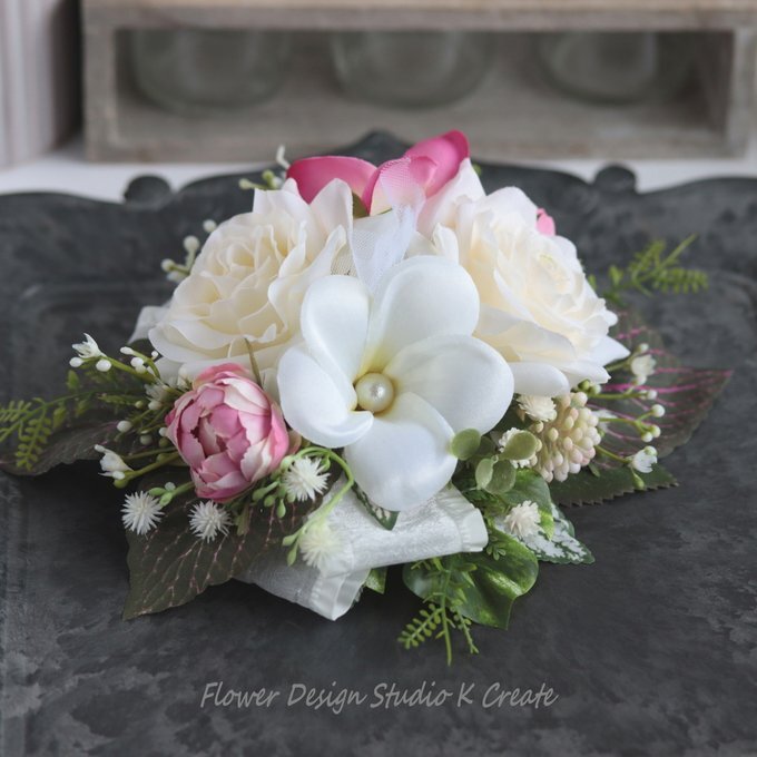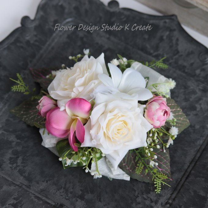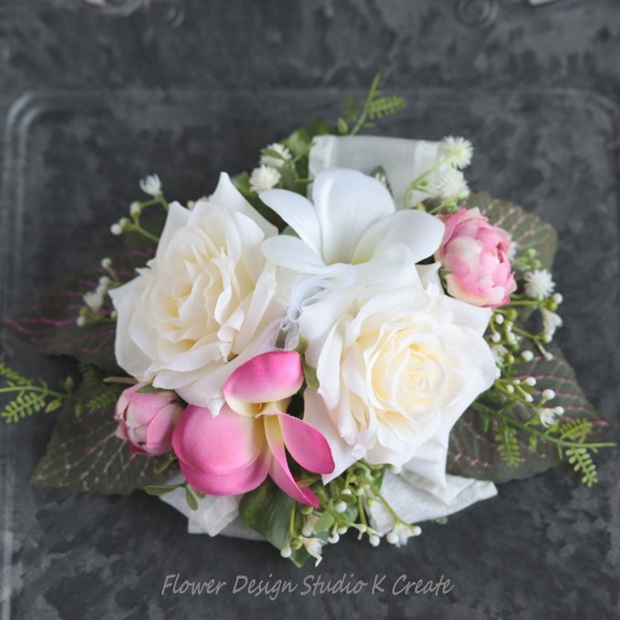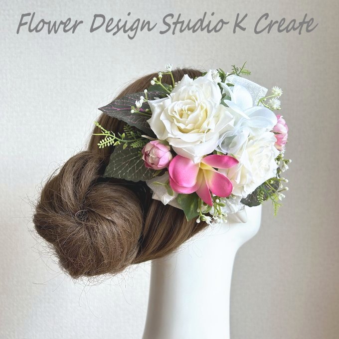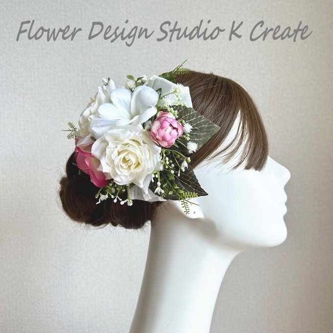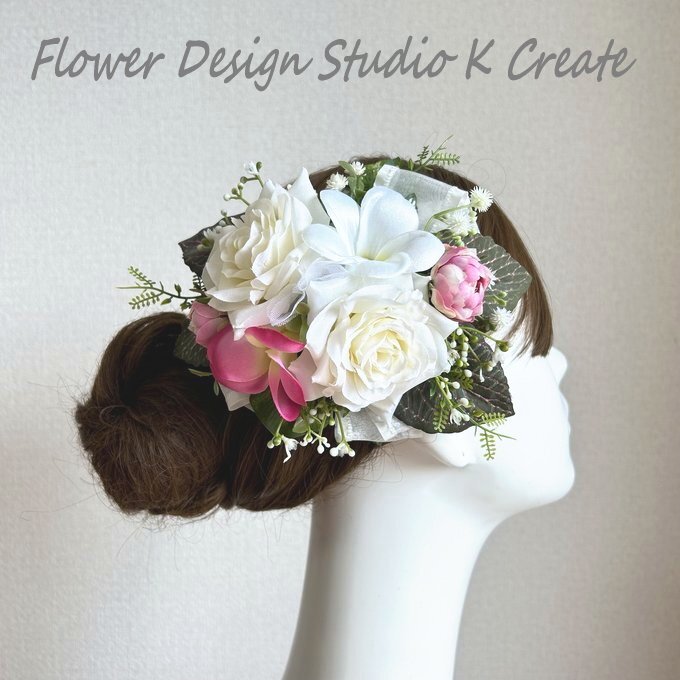 | 南の島でのリゾートウェディングや、 フラダンスの髪飾りとしてお使い頂ける、 白い薔薇とピンクのプルメリアのヘアクリップです。 清楚な純白の白い薔薇と、 パールのついた白いプルメリア、 ピンクのプルメリアとミニ薔薇、 可憐なカスミソウ風のボタニカルで アレンジしました。 ベースには、サイドフリルのチュールリボンと、 モンステラ、モズグリンの葉っぱをあしらいました。 濃い目のグリンが、 白いお花を引き立たせます。 中心には、チュールをあしらっており、 ウェディングにもお使い頂けるヘッドドレスです。 リゾ婚の花嫁様の髪飾りとしてもおすすめです。 お花の裏面は、 80mm幅のシングルクリップタイプで、 リボンでクリップのバネの部分が見えない様に、 覆う感じで仕上げました こちらは、右側に着ける様、アレンジしており、 落下防止のループも 上部に4か所お付けしました。 ダンスの髪飾りとしてもお使い頂けます。 お花は、生花の様な、 高品質なアーティフィシャルフラワーで お作りしています。 保管のできる箱に納めて、 大切に発送させて頂きます。 ●サイズ 縦:160mmx横:210mmx高さ:100mm前後(最端から最端) ●お花:アーティフィシャルフラワー(高級造花/ポリエステル) ●アーティフィシャルフラワーは主に、大手の卸問屋から直接購入し、 生花に限りなく近い色彩と質感にこだわってセレクトしています。 ●K CreateのUピン、コームは、フローラテープが剥がれない様、 コーティング処理を施しています。 【Hashtag】 #フラダンス #髪飾り #アロハ #プルメリア #ピンクのプルメリア #白い薔薇 #ウェディング #フラ #ヘッドドレス #海外挙式 #ブライダル #ヘッドドレス #浴衣 #ヘアクリップ #夏のアクセサリー #ダンス #ダンス髪飾り #夏 #お祭り #ビーチ #撮影会 #フェス #プルメリア #リゾ婚 #リゾートウエディング #南国 #ハワイ #白 #パール #チュール #ピンクの薔薇 【注意】 作品画像、作品の模倣コピー、内容、デザイン全般の無断転載・転用、 アイデアの盗用は、お断り致します。 | ||