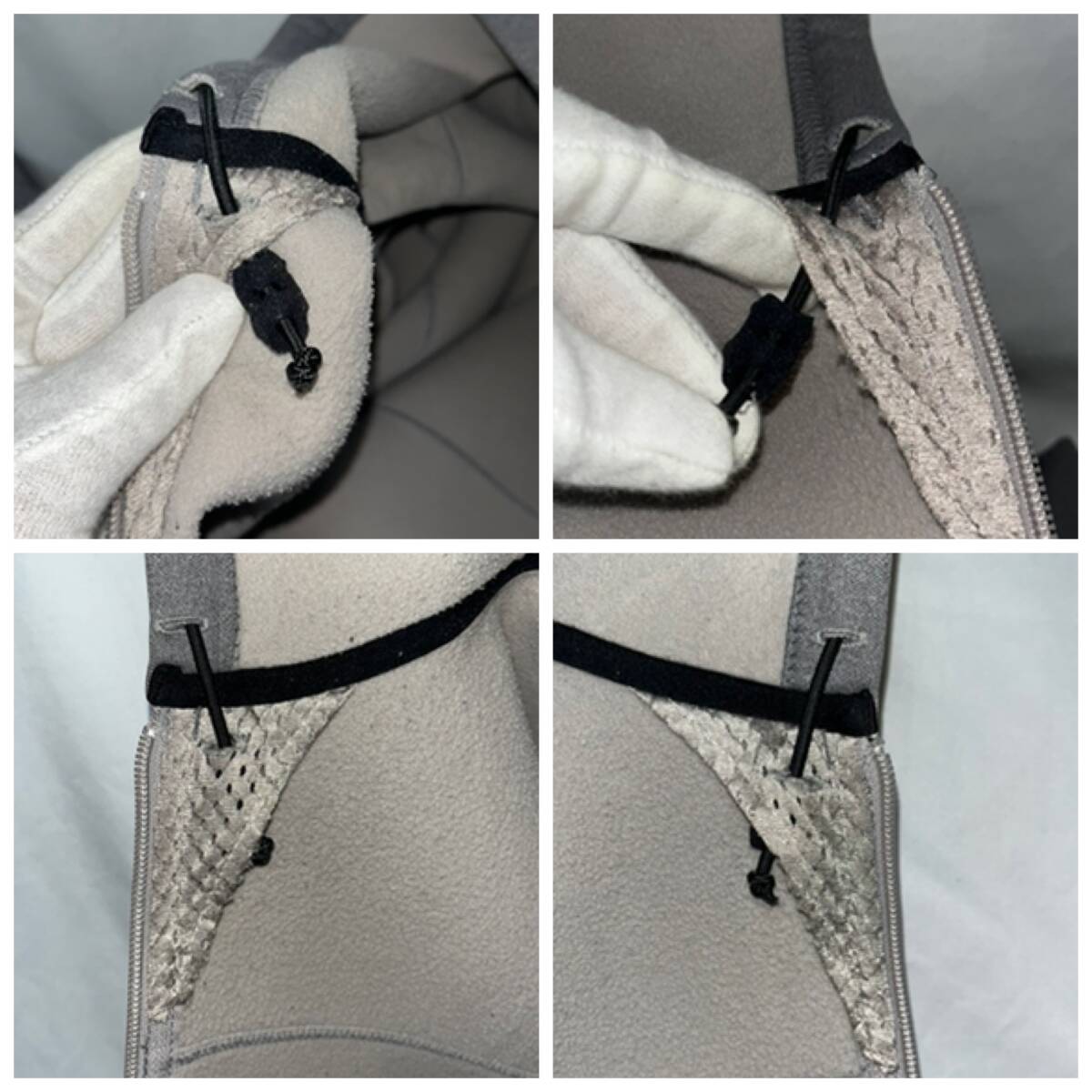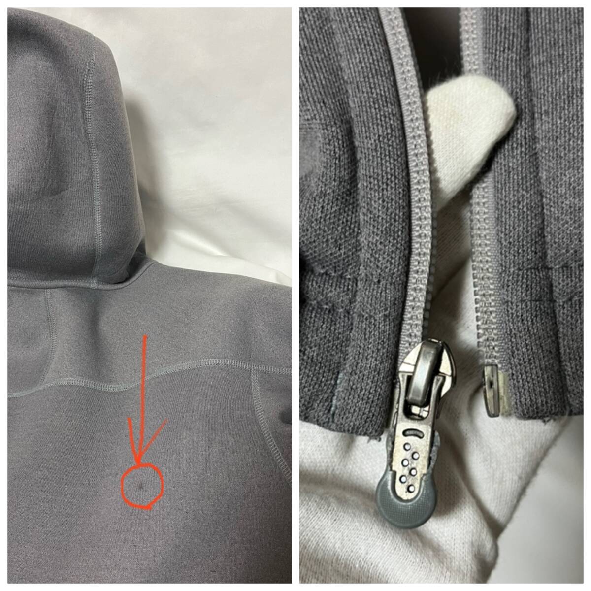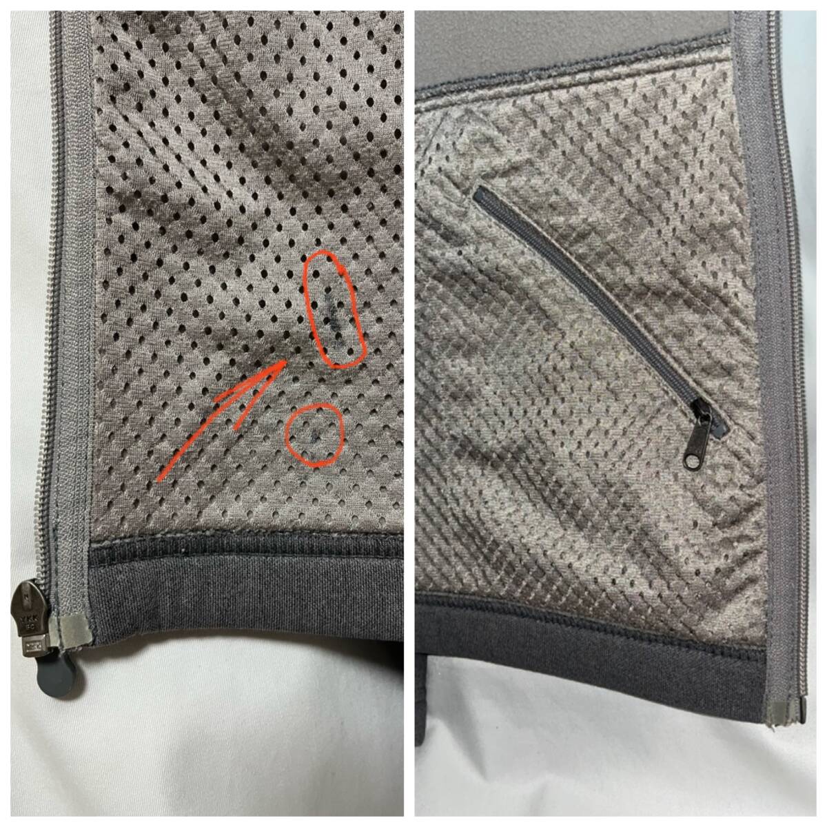 | 中古 内側メッシュ部分と背中右肩下付近に汚れ、右袖に縦横2mm未満の穴、ジップ持ち手プラパーツの割れがあります、その他、適度な使用感はありますが割と綺麗です | ||