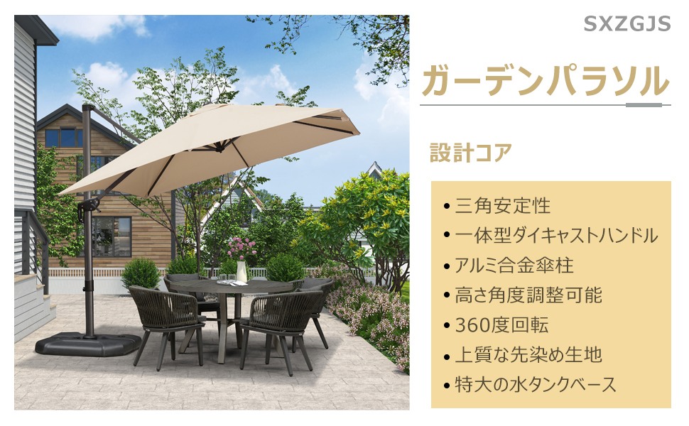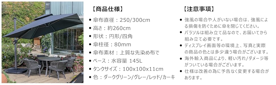 耐風性に優れた大型ガーデンパラソルです。傘カバーをご用意しておりますので、ガーデンやパティオ、業務用にもご利用いただけます。