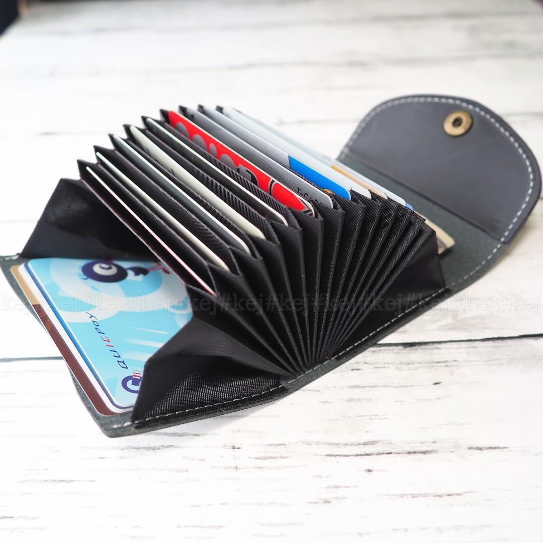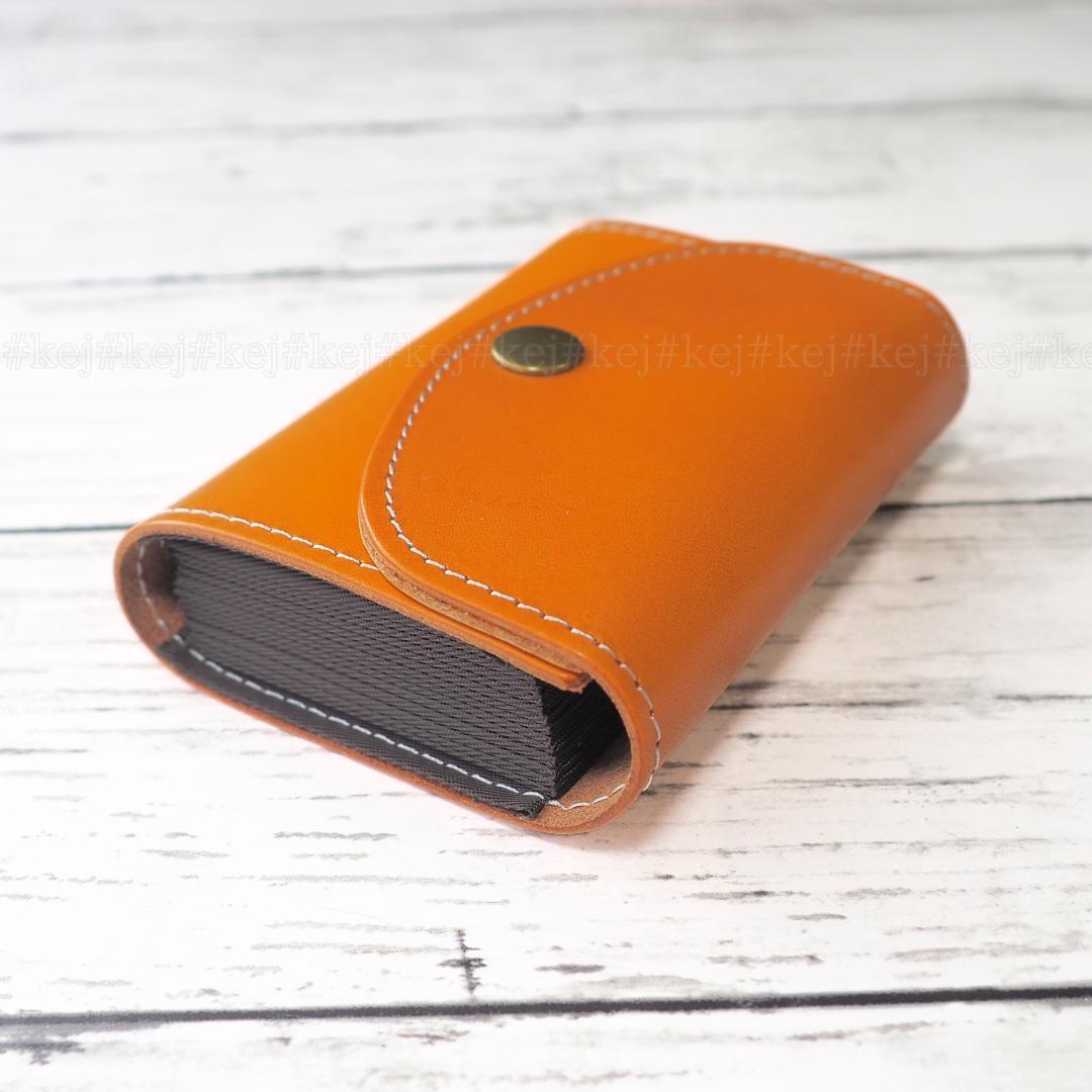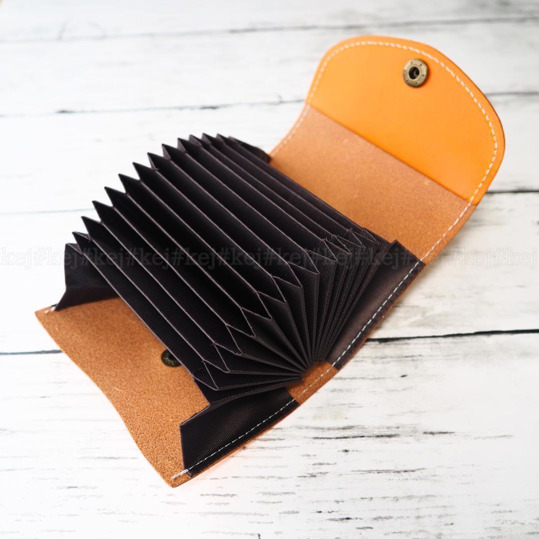 植物タンニン鞣しヌメ革を使用し内側には蛇腹状になったカード入れが12か所とフリースペースが2か所あるシンプルなカードケースです。ちょっとしたカードの整理にどなたにもおすすめです。フリーポケットに2つ折りお札を入れれますが少し曲がります。カードメインの人におすすめの財布です。