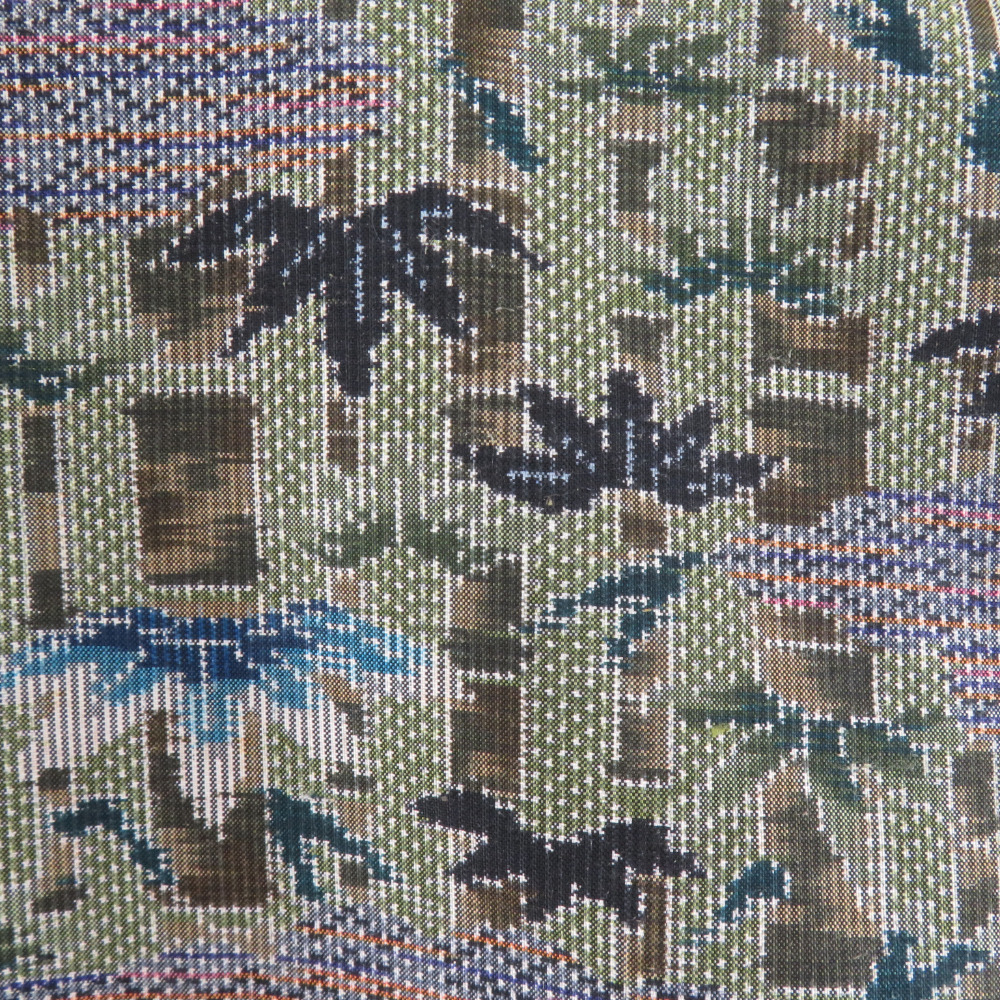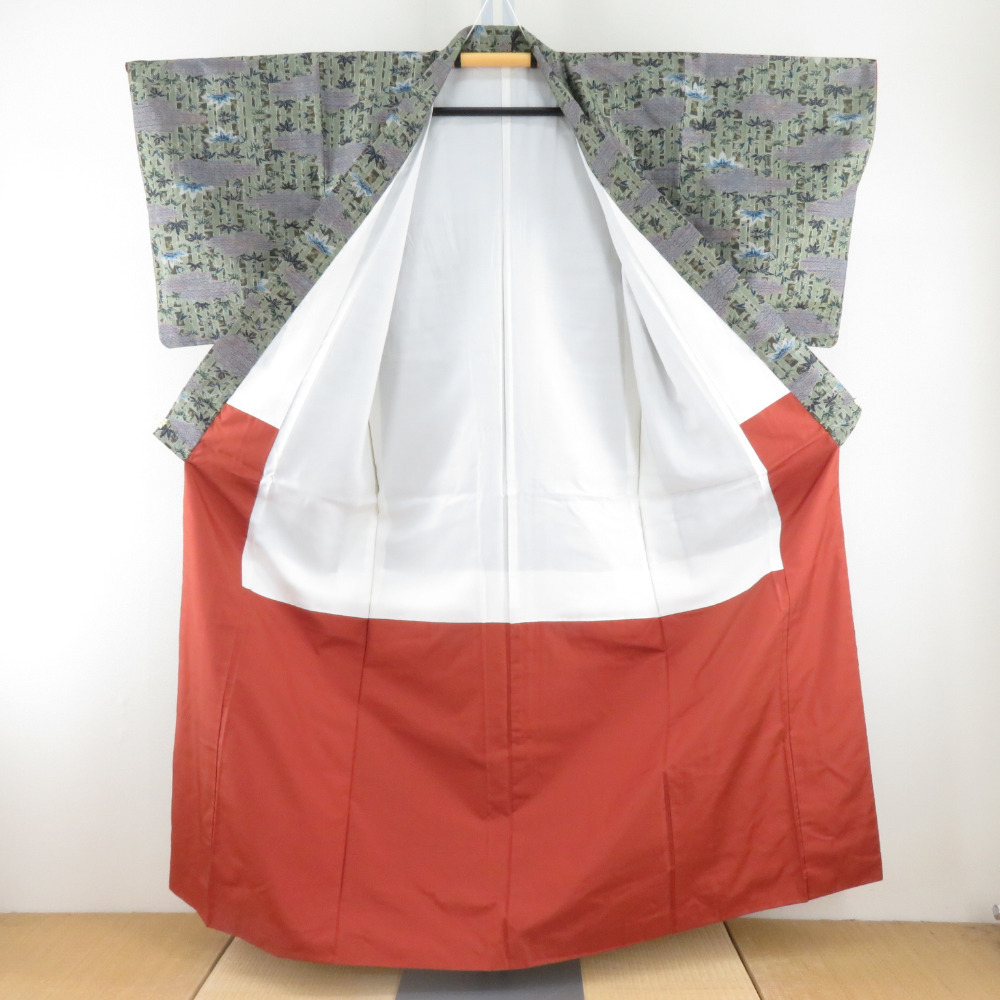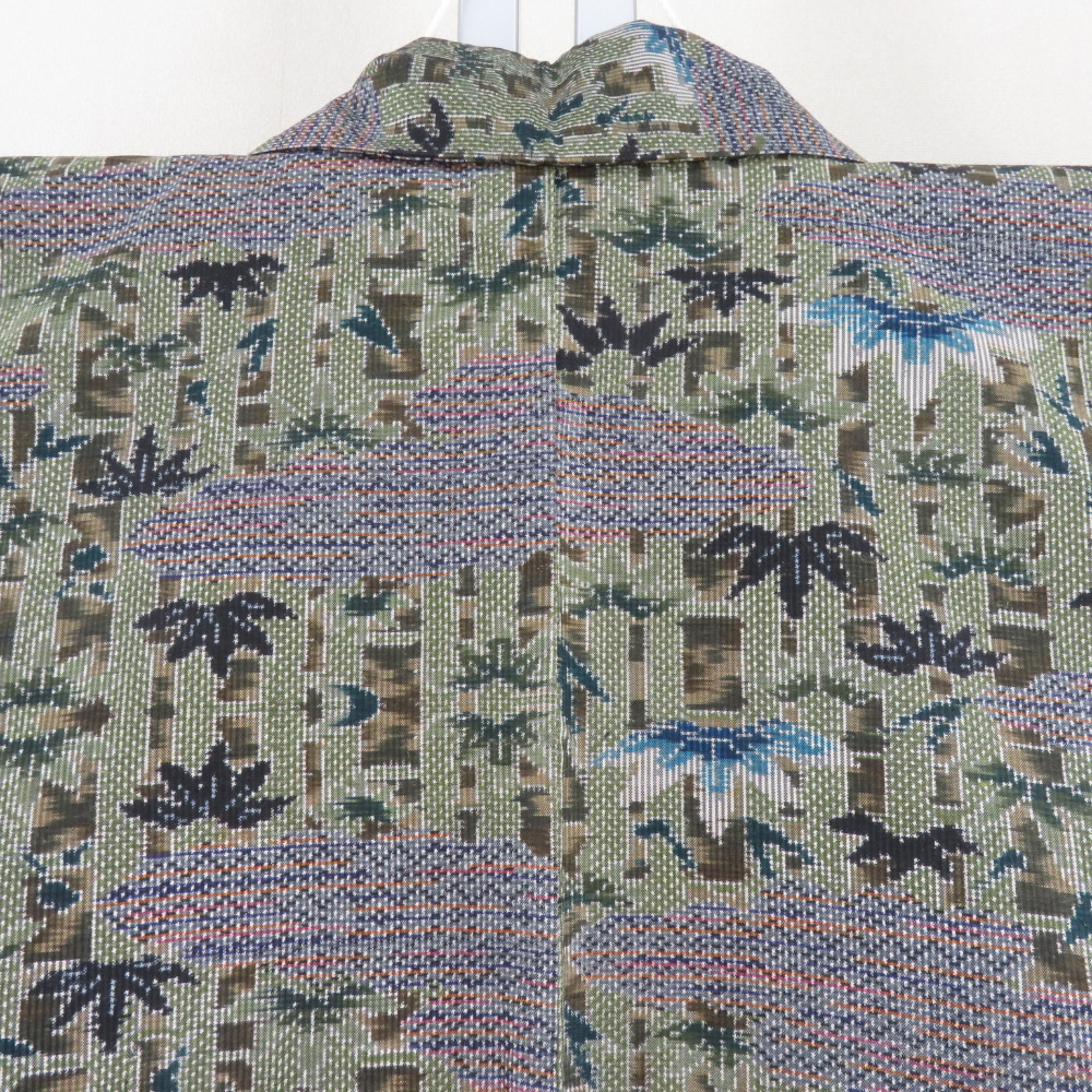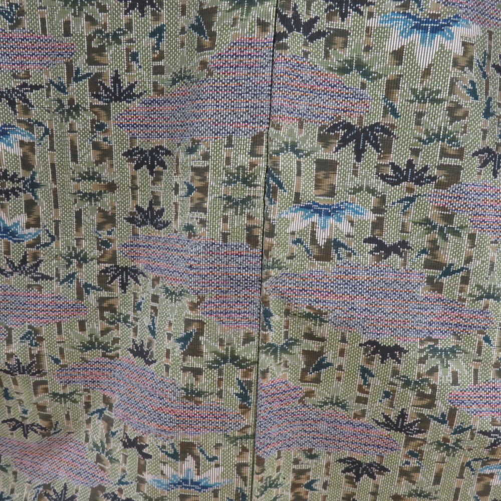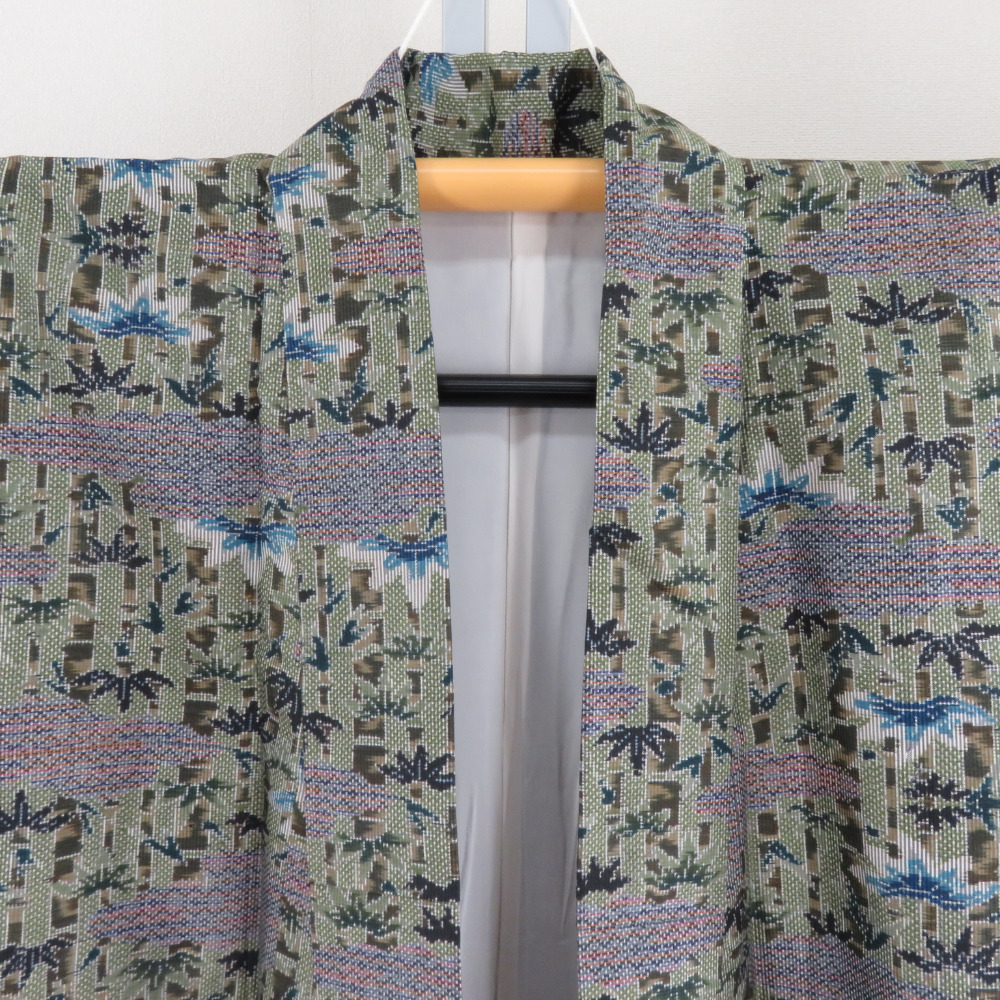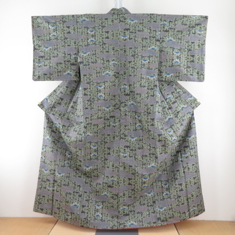 | 紬 着物 竹模様 緑色x青色x灰色 袷 バチ衿 正絹 仕立て上がり カジュアル 身丈157cm |