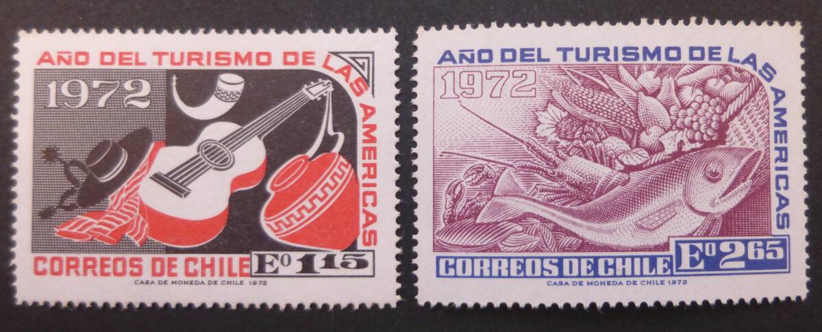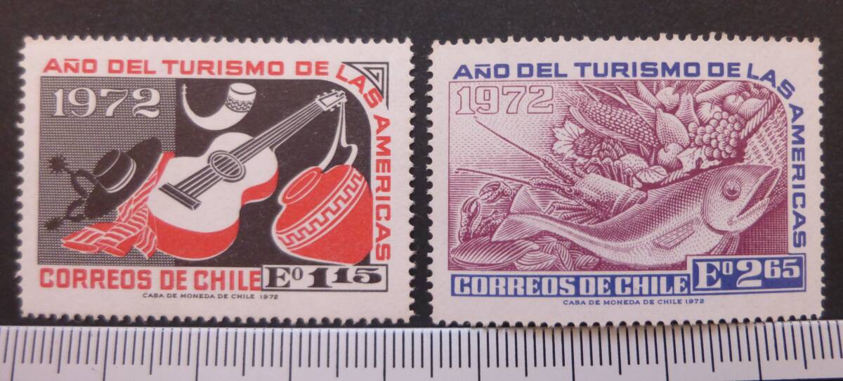 チリで 1972年に発行された、 ラテンアメリカ観光年 記念切手 2枚です。 音楽と食べ物