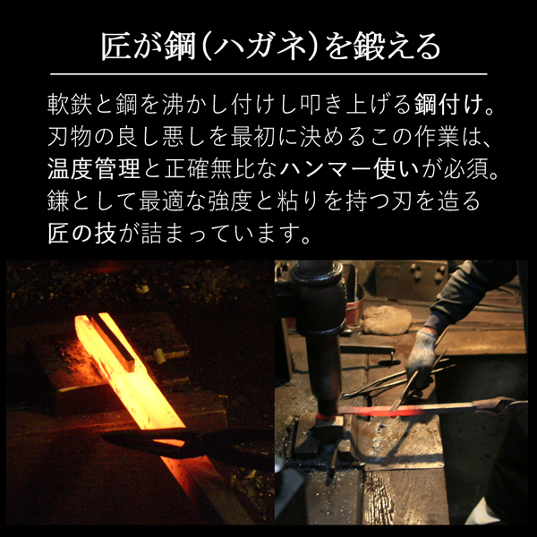 青紙鋼と極軟鉄を鍛接火造りすることで、硬く粘り強く切れ味鋭い刃となっています