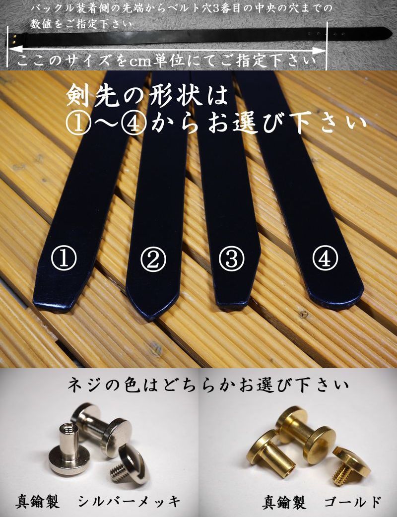 | 商品説明 | 専門の馬具職人が全てハンドメイドにて仕上げました、本牛革製のベルトです。 このベルトを製作頂いた馬具職人は、乗馬クラブや、官公庁などに、馬具などを提供しています。 ≪革の材質≫ このベルトに使用しているサドルレザーは、牛革の部分で特に上質で丈夫な背中の部分(ベンズ)の1枚革を使用した、極上の革ベルトです。 新品時はとてもコシがあり固めの仕上がりですが、使用するほどに体に馴染んで 独特の風合いになっていきます。 天然皮革ですので、全体的に、動物(牛)がもっているしわや血管(血筋)が通っていた跡がそのまま革に模様として現れております。 しわや血筋はそれ自体本革である証拠であり、むしろそれが味わいになっています。 中古品(使用品)、不良品ではありませんので、ご理解下さい。 また使い込むことにより、本革らしい味わい深い独特の風合いに熟していきます。 革の裁断から仕上げまでプレスなどを一切使わず、全て馬具職人様による手作業のハンドメイドです。 コバ(裁断面)も手作業で丁寧に磨き上げております。 またバックルをあえて付けず、ベルトのみの販売ですので低価格でご提供出来ました。 バックル単品でも販売しておりますので、こちらのベルトと同時にご購入された場合、一括発送可能です。 (馬具職人工房が取り扱っております、ベルト幅40mm以上のバックルでしたら、全て取り付け可能です。) ≪サイズ≫ 幅:34mm 革の厚さ:5mm ベルト穴は2.5cm間隔5つ開いています。 ※剣先を納めるベルトループは取り外し可能です。 このベルトは革部分をカットして、長さを短く調整することが出来ません。 お支払確認後、ご希望の長さに調整してからのお渡しになります。 バックル装着側の先端からベルト穴3番目の中央の穴までの数値をご指定下さい。 ※サイズは最大で110cmまで承ります。 また剣先の形状を変更する事も可能です。 画像の1~4の中からお選び下さい。 こちらの商品はお支払確認後に製作する受注生産品になります。 商品の製作に10日~20日程度お時間を頂きます。 ※本品はベルトのみの販売で、画像にあるバックルは出品商品には含まれませんので、ご注意下さい。(画像のバックルは装着例です。) ベルトの裏側にある留め金具をマイナスドライバーで回して、簡単にバックルの着脱が出来ます。 留め金具(ネジ)の色が2色ありますので、どちらかお選び下さい ・真鍮製 ゴールド色 ・真鍮製 シルバーメッキ ベルト幅35mm以上のバックルでしたら、取り付け可能です。 革が『5mm』と非常に厚く、それだけで存在感がありますので、シンプルなバックルから、ごついUSAウエスタンバックルまでどんなバックルにも合います。 革の質は本当に上質で素晴らしい出来ですので、ベルトのみをお探しの方にお勧めです。 その他の商品は 「馬具職人工房 ヤフーショップ」にて販売中です。 |